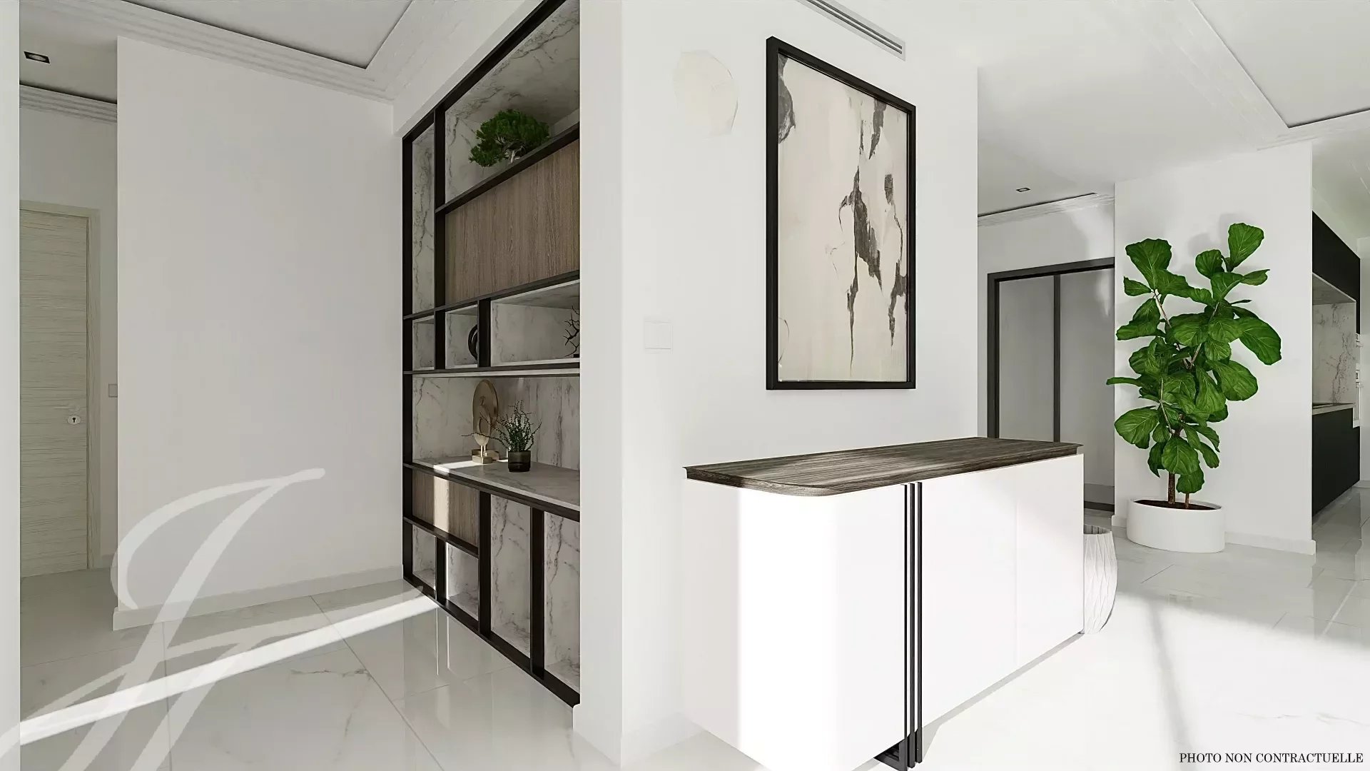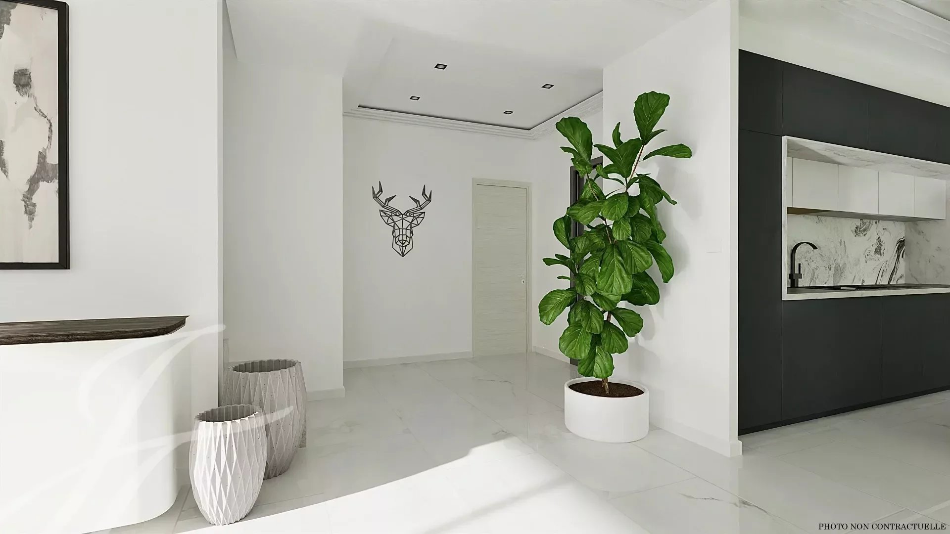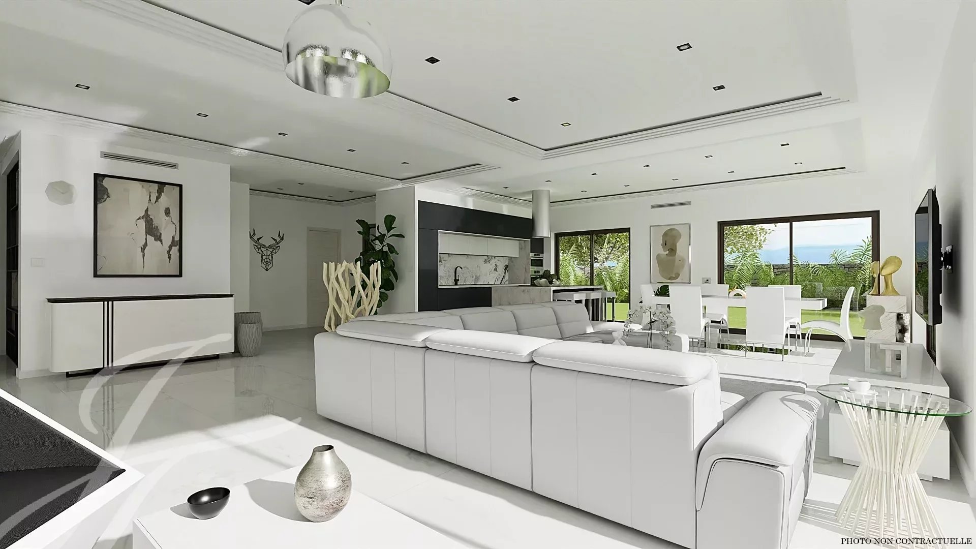 Large reception area of 70m², living room, dining room, open kitchen, bedroom with dressing room, bathroom and toilet.