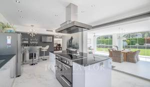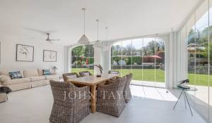 A bright and inviting glazed terrace welcomes you, creating a seamless flow between indoor and outdoor living. This space connects effortlessly to a modern, fully-equipped kitchen. The open-plan design leads into the dining area and a spacious living room enjoying views over the pool and garden.