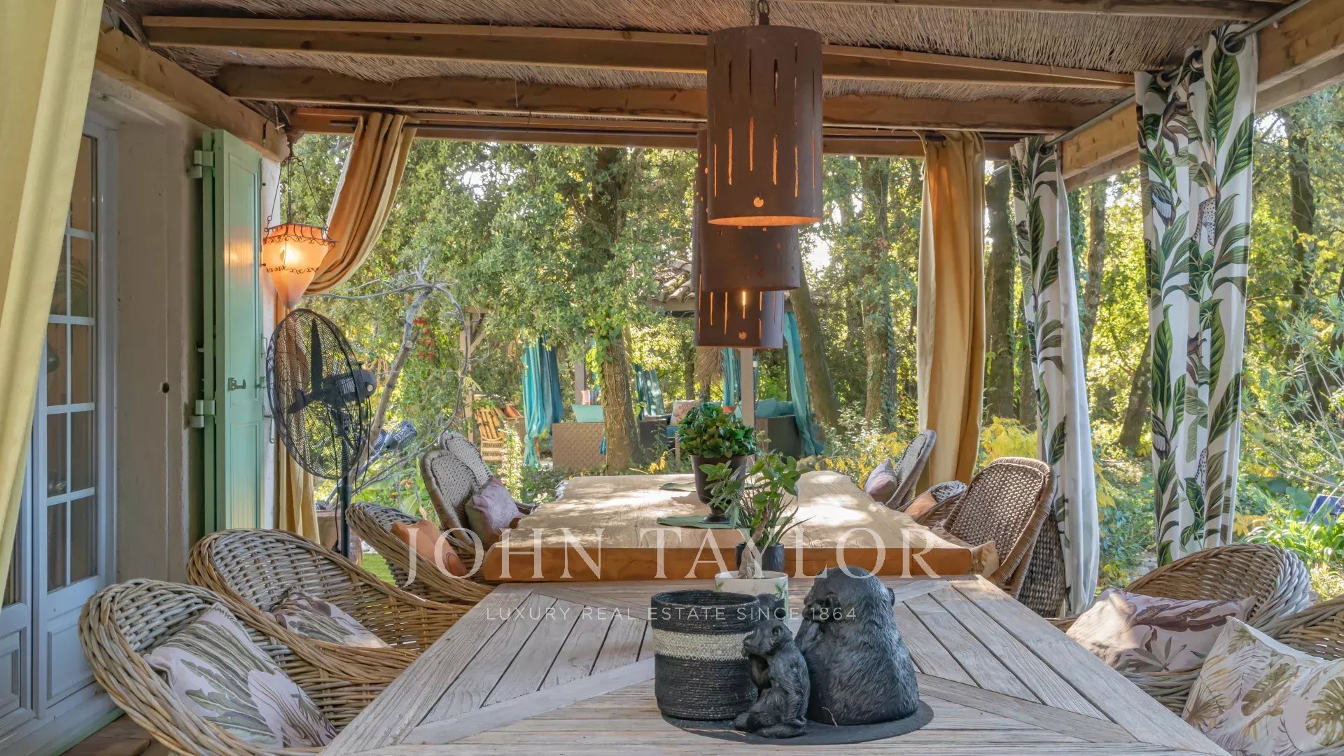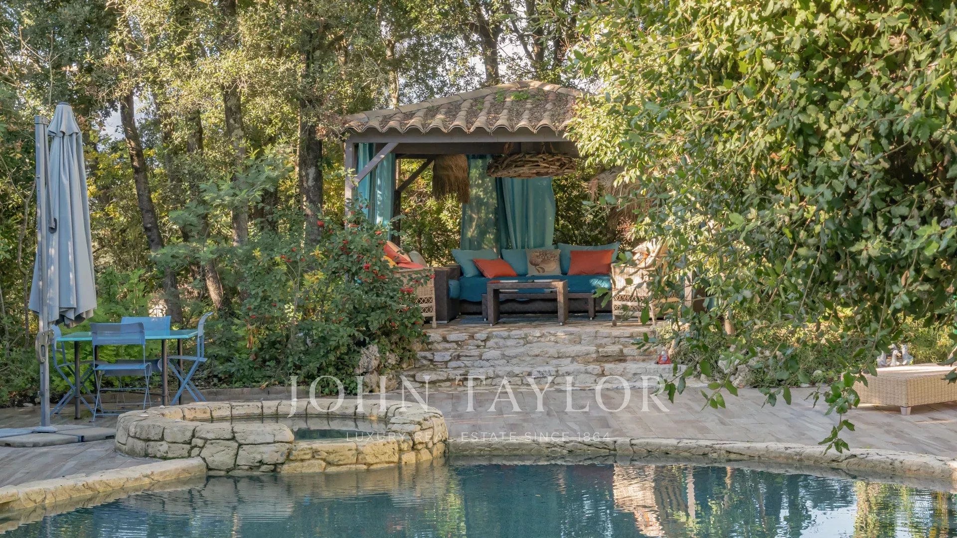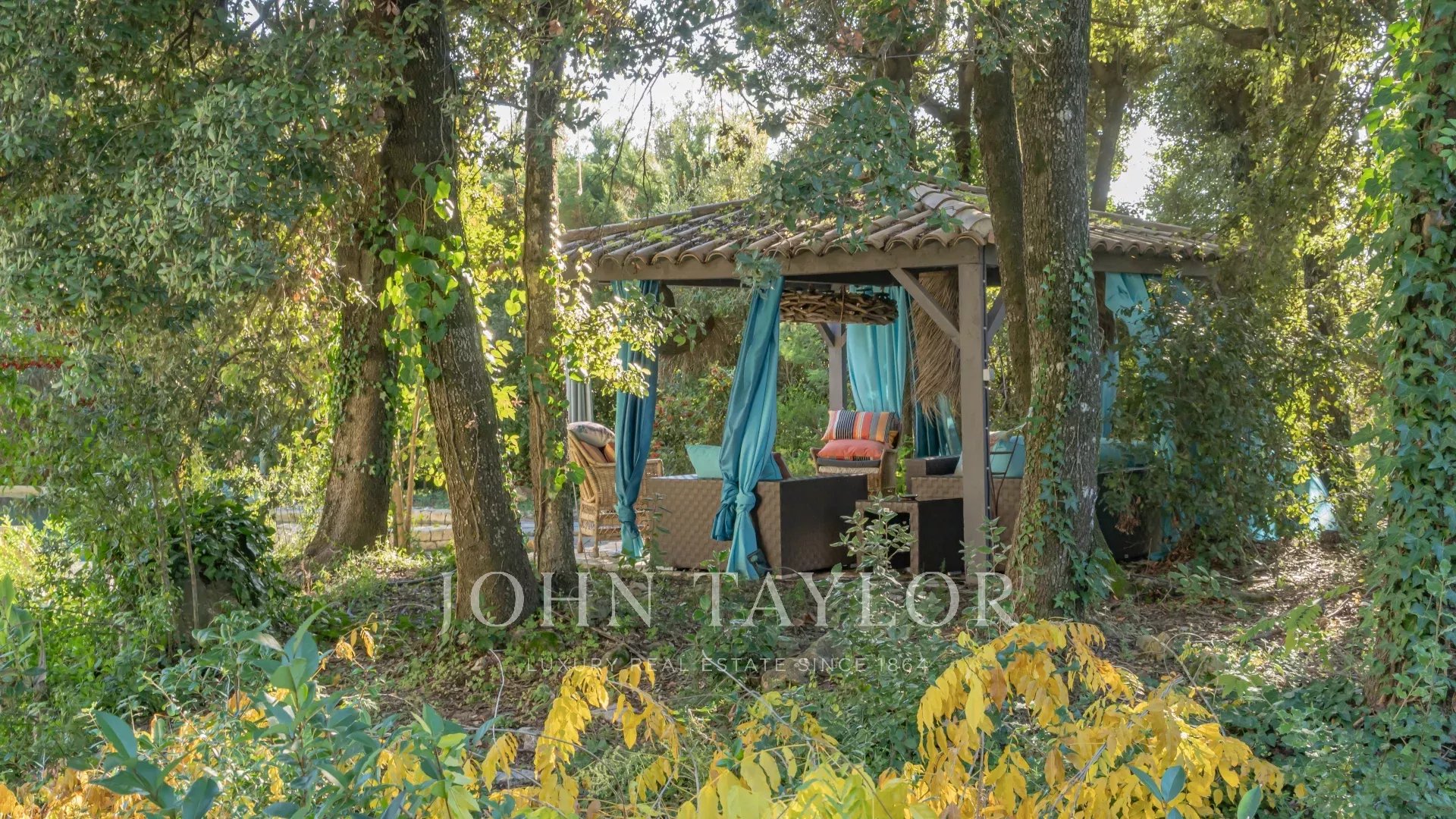 Heated Diffazur swimming pool, landscaped garden with fountain and koi pond, various relaxation areas and separate janitor's cottage.