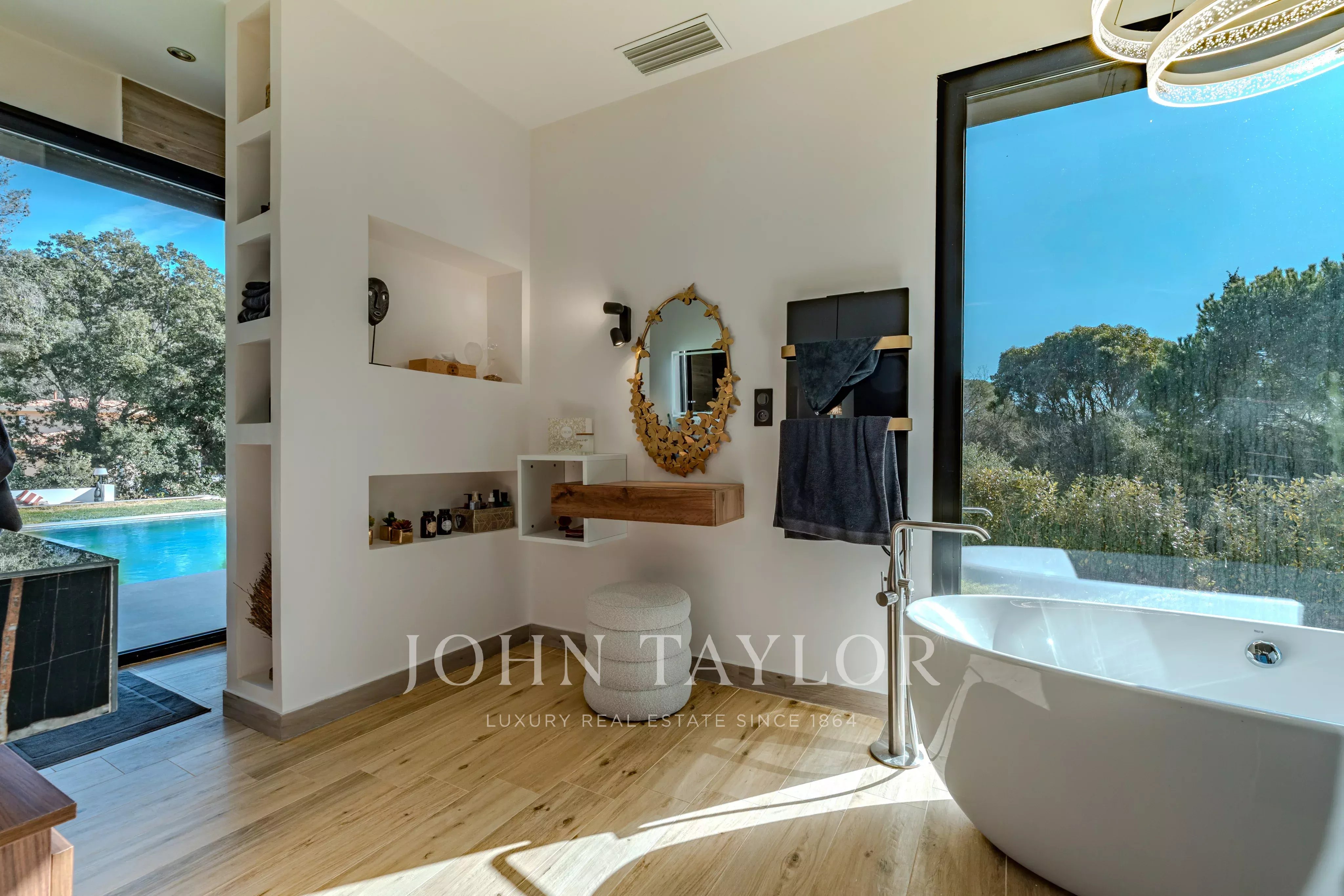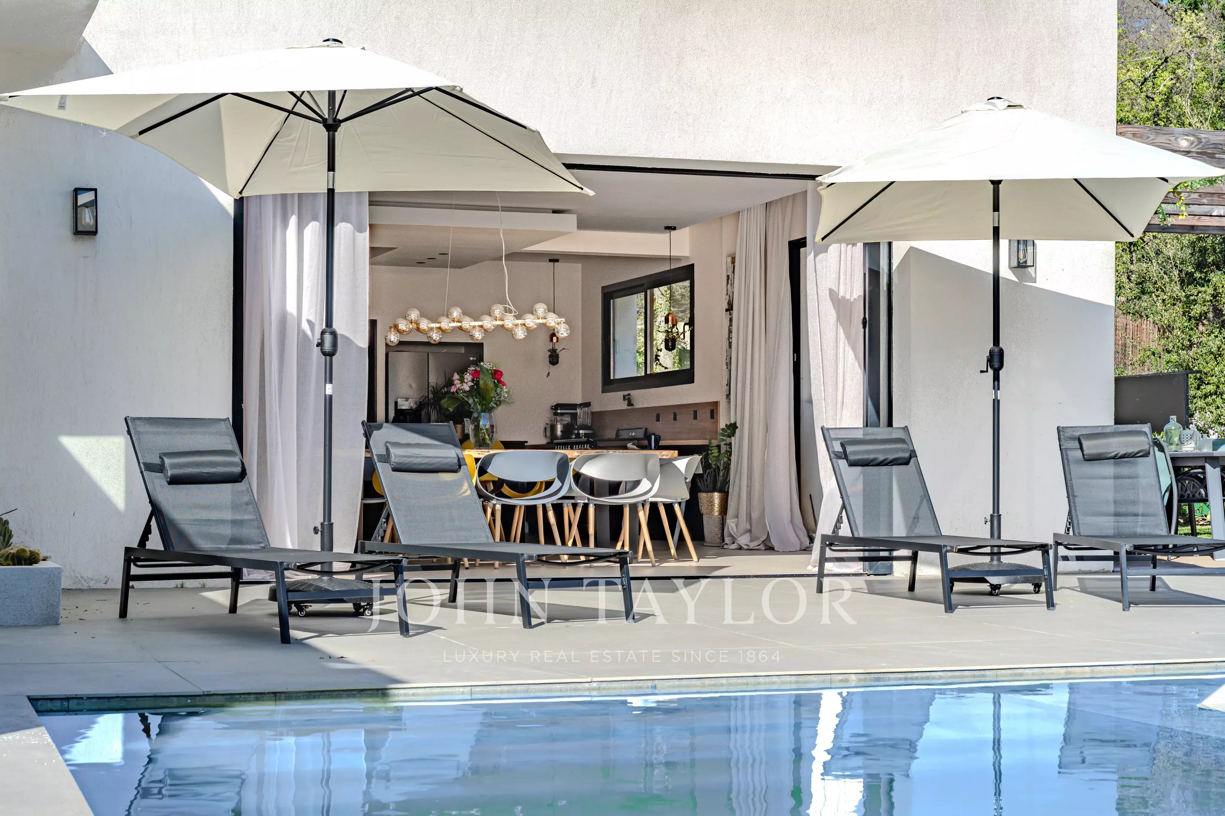Set on approximately 3,115 sqm of landscaped grounds, the property boasts high-end outdoor amenities, including an infinity pool with open views, a fully equipped pool house (shower and toilet), a convivial fire pit area, and a pétanque court.