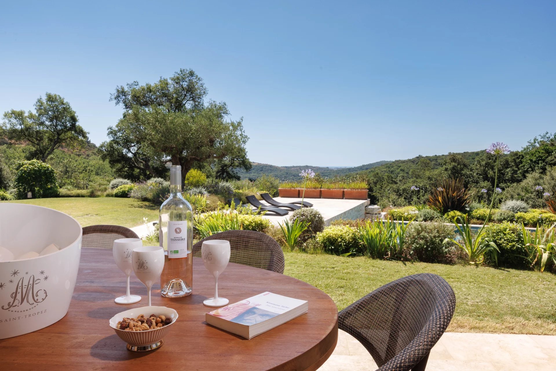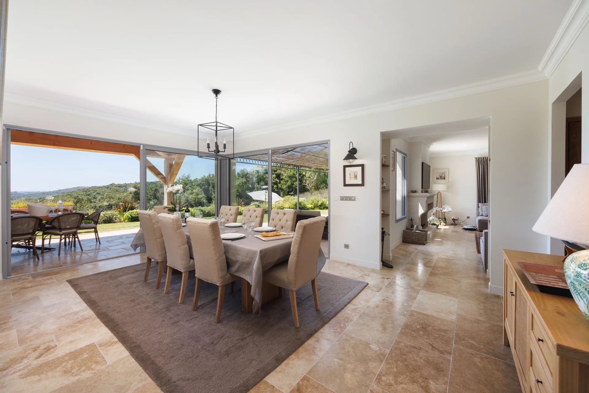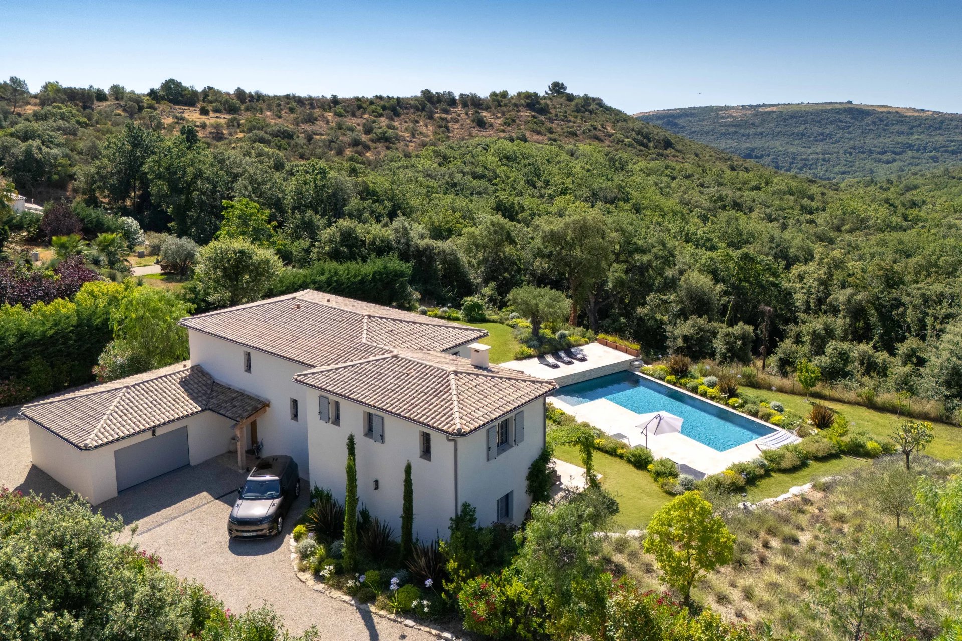 On the ground floor, the villa comprises a beautiful entrance hall, a dining room connected to a large kitchen with central island, all opening onto a vast covered terrace of over 85 m² and an open-air terrace, a cosy living room with fireplace and the Master Suite with dressing room and full bathroom; laundry room and large garage for two vehicles.