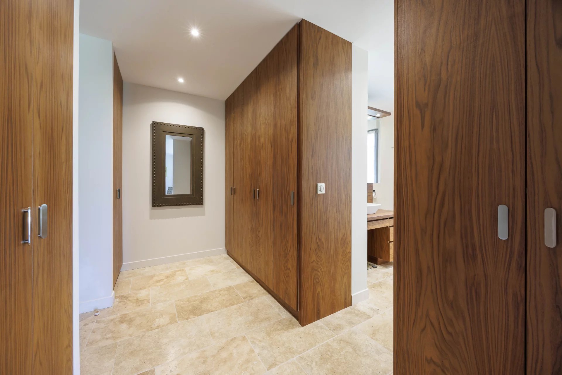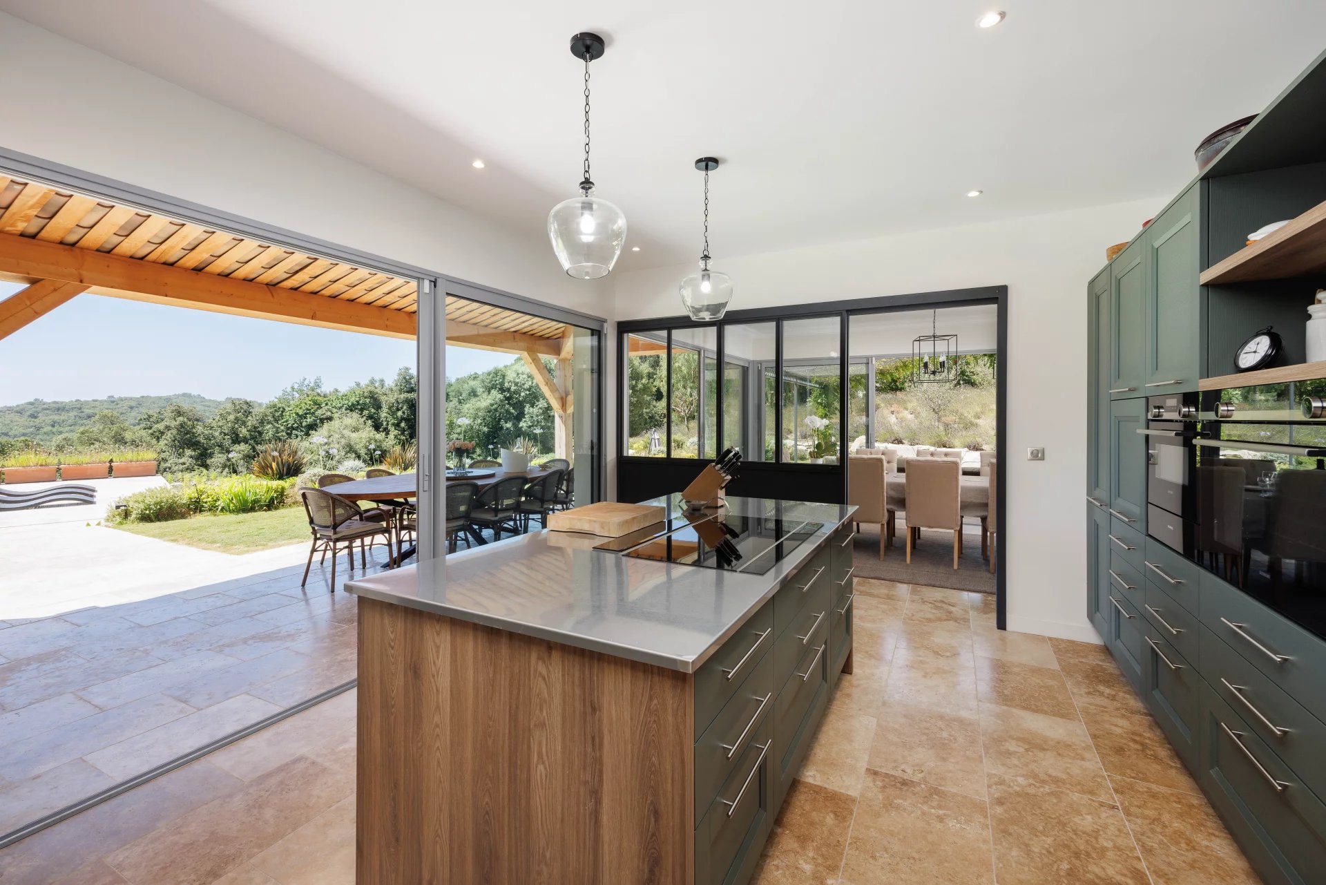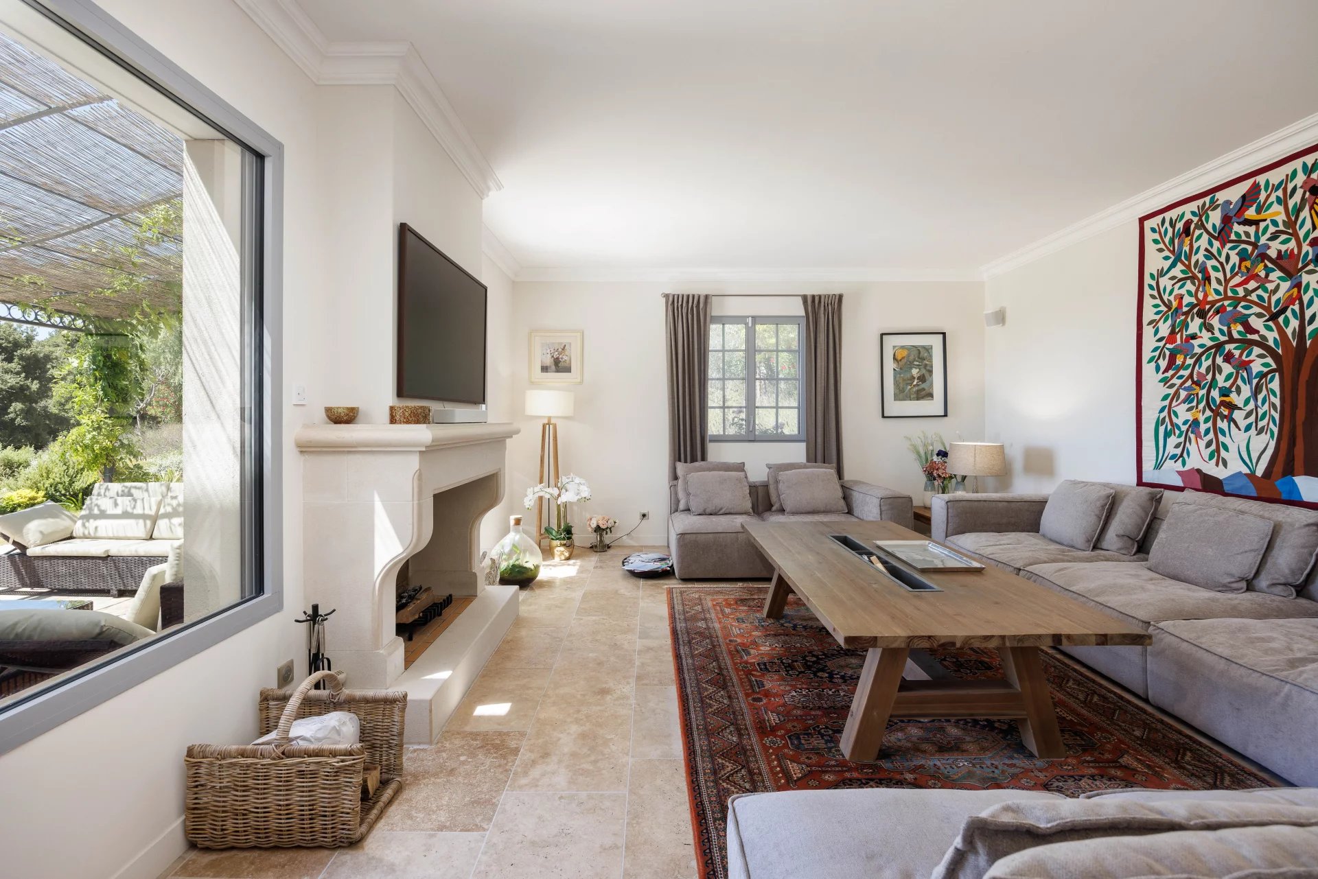 On the ground floor, the villa comprises a beautiful entrance hall, a dining room connected to a large kitchen with central island, all opening onto a vast covered terrace of over 85 m² and an open-air terrace, a cosy living room with fireplace and the Master Suite with dressing room and full bathroom; laundry room and large garage for two vehicles.