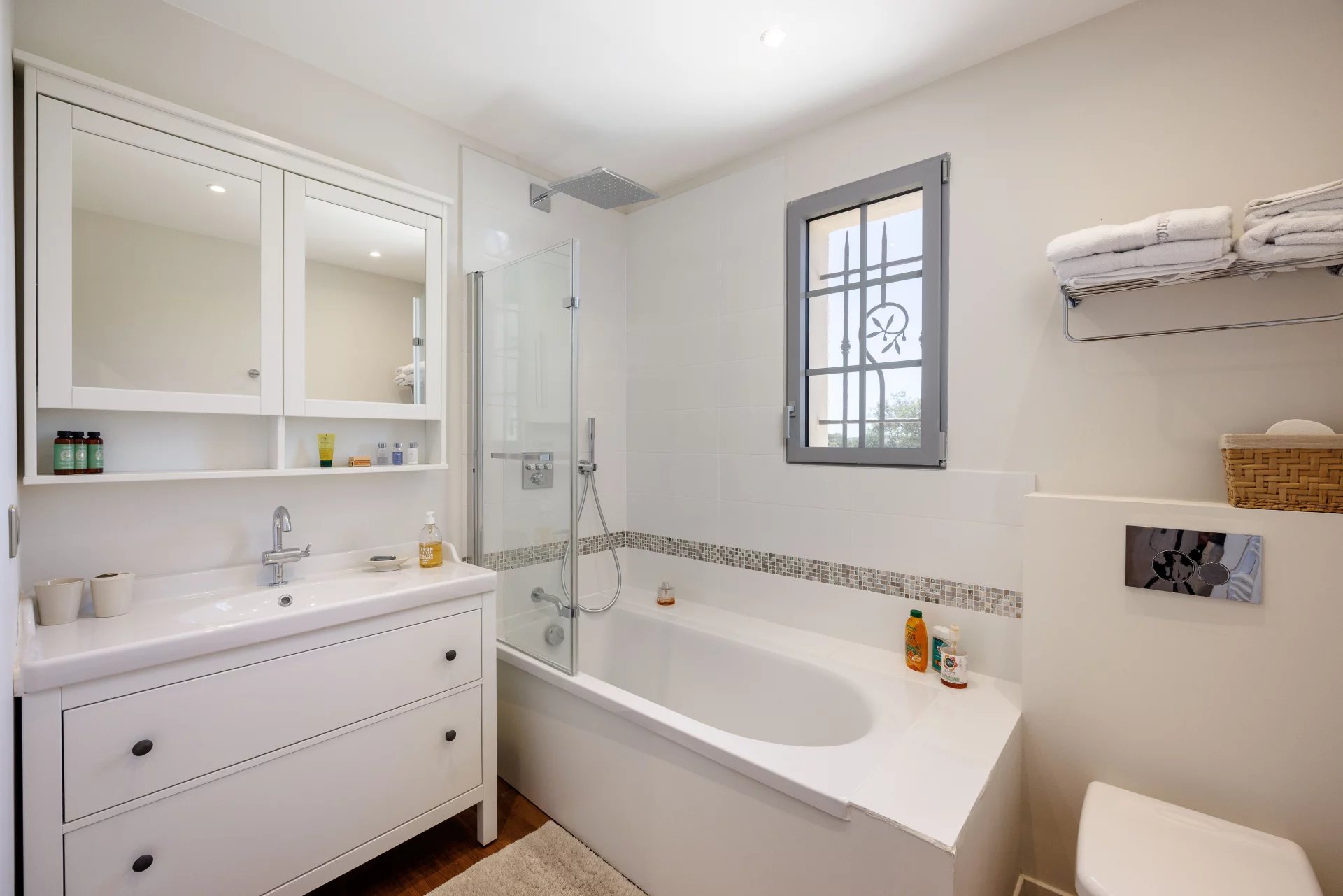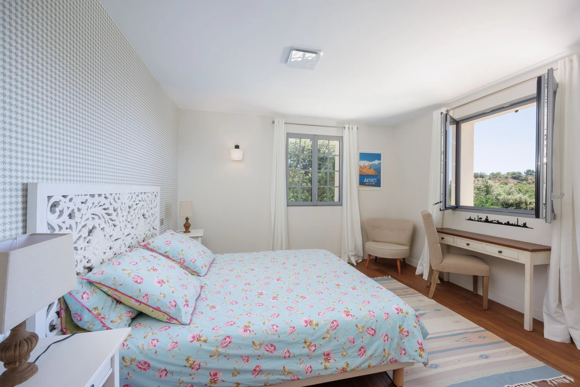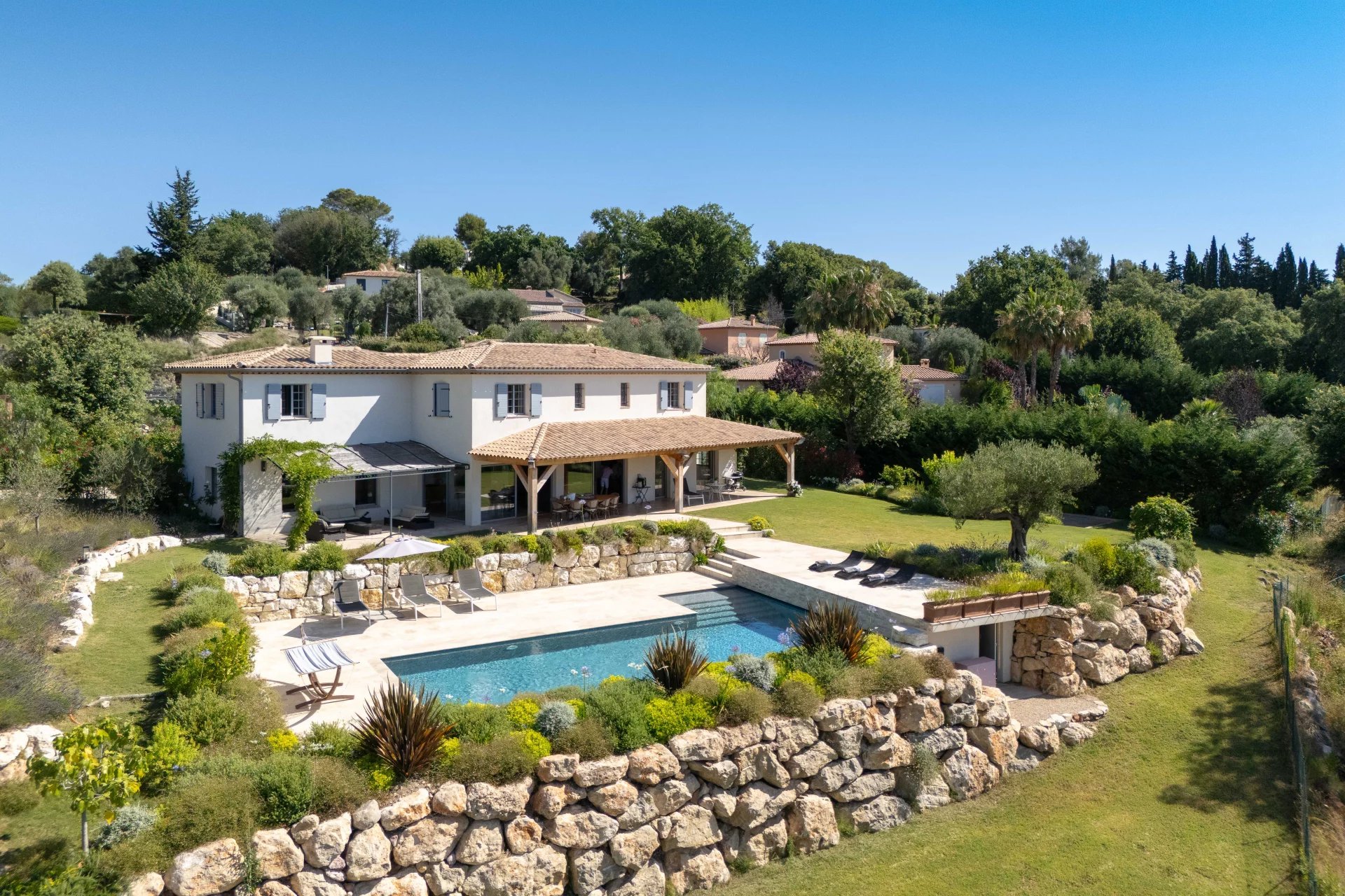 Situated in a quiet residential area of Roquefort-les-Pins, just a few minutes from the village center yet in absolute peace and quiet, this imposing new bastide with a total surface area of approx. 417 m² will seduce you with its southern exposure, its unobstructed view over the hills, the forest and all the way to the sea, and its chic Provencal charm combining modern comforts.