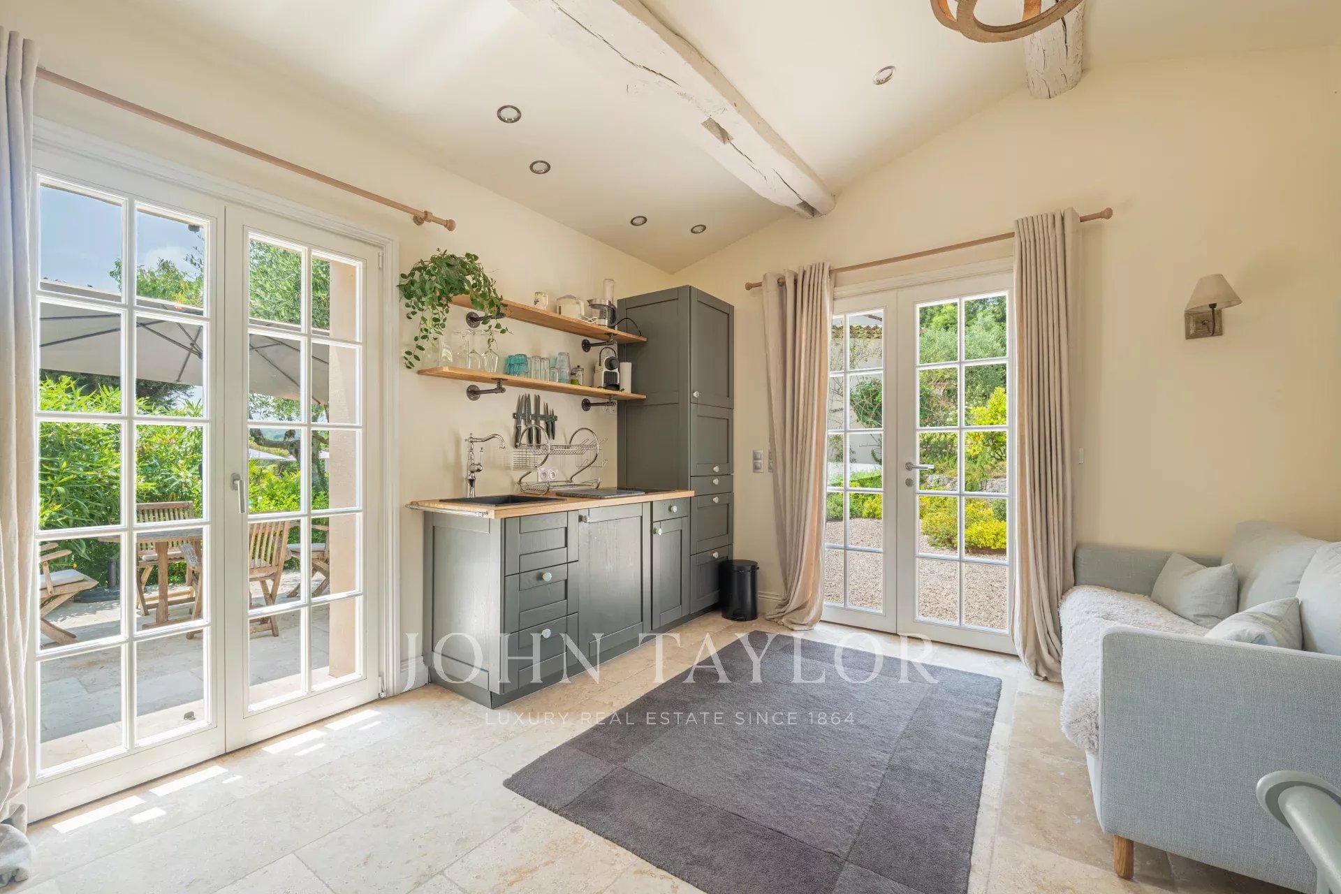 There is a fully independent studio with equipped kitchen and bathroom offering a fifth bedroom. In addition, there is an independent office in the garden, where you can work in the peace and quiet with underfloor heating when needed.
