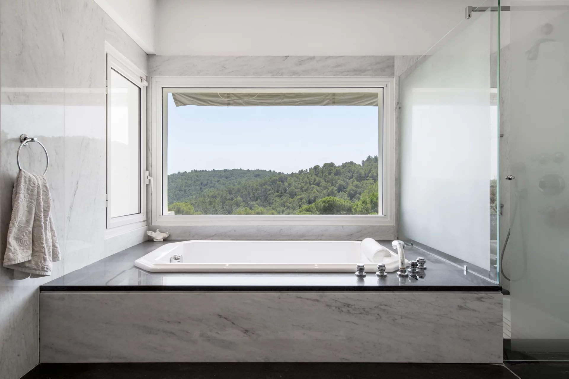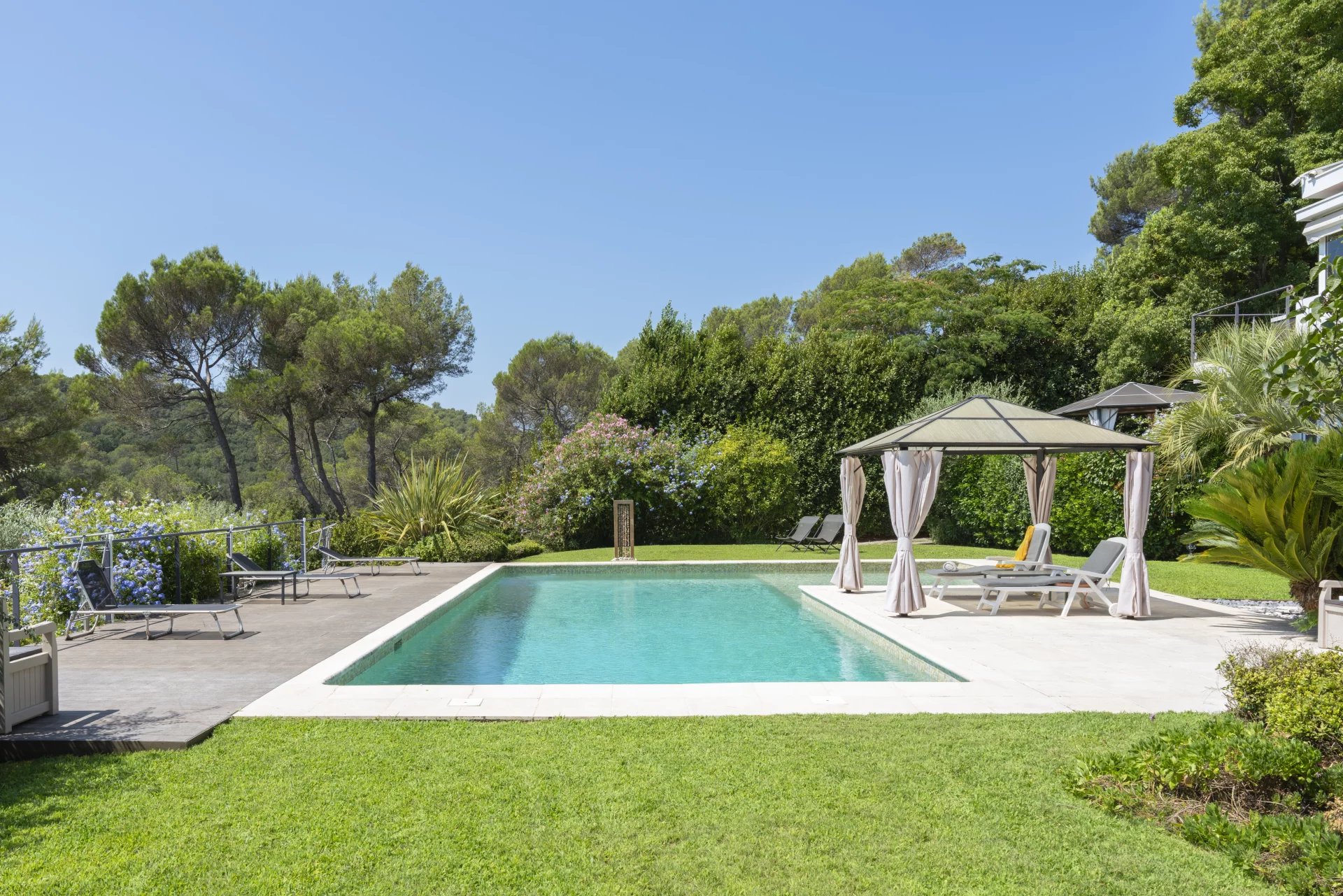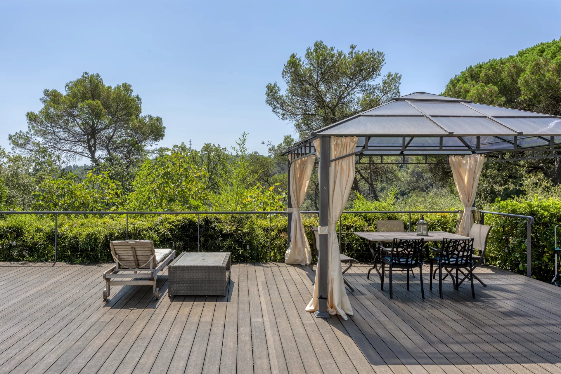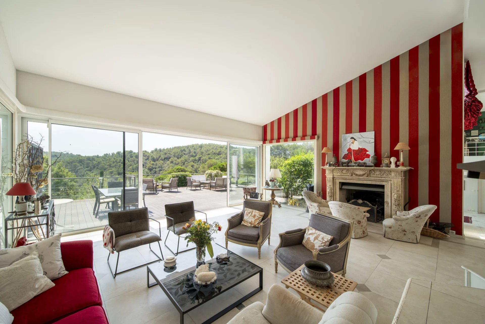 Walking distance to Valbonne in a sought after private domain, this exceptional 518 sq.m architectural masterpiece, bathed in natural light, offers breathtaking open views across the surrounding forest in complete calm. The property features five spacious bedrooms in the main house, along with an additional independent one-bedroom apartment, perfect for guests or extended family.