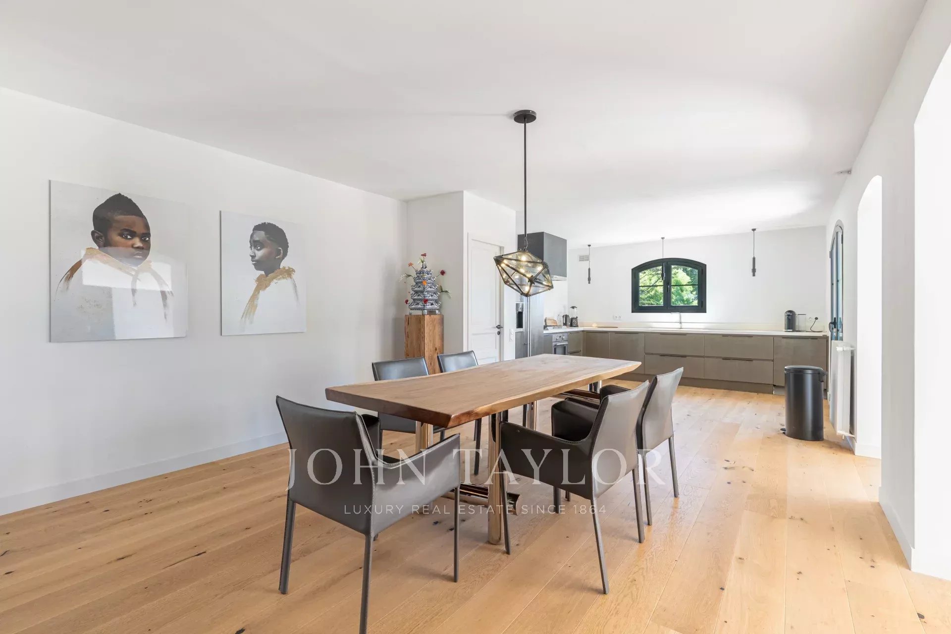 The entrance leads into a modern, fully equipped kitchen that opens onto a spacious dining room.