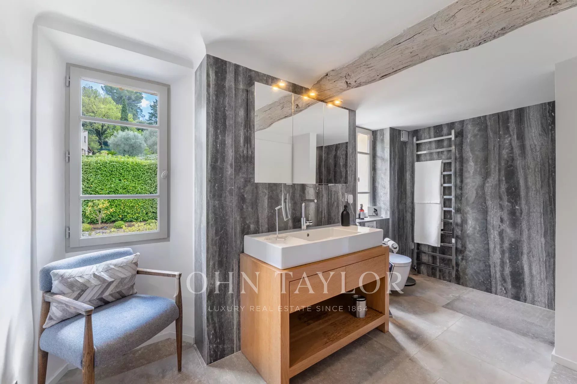 Tastefully restored 18th-century stone property with swimming pool with a mature garden in a good neighbourhood walking distance to Valbonne village. The interior of this charming historic building is renovated to a high standard in a contemporary modern style while retaining original features of old world charm.Large open plan living space with undefloor hearing and reversible Air con with a designated formal dining area and open plan kitchen all communicating with the outdoor terraces,garden and pool. On the first floor double master suites with dressing and bathrooms. On the second floor 2 possibly 3 bedrooms and a large office.