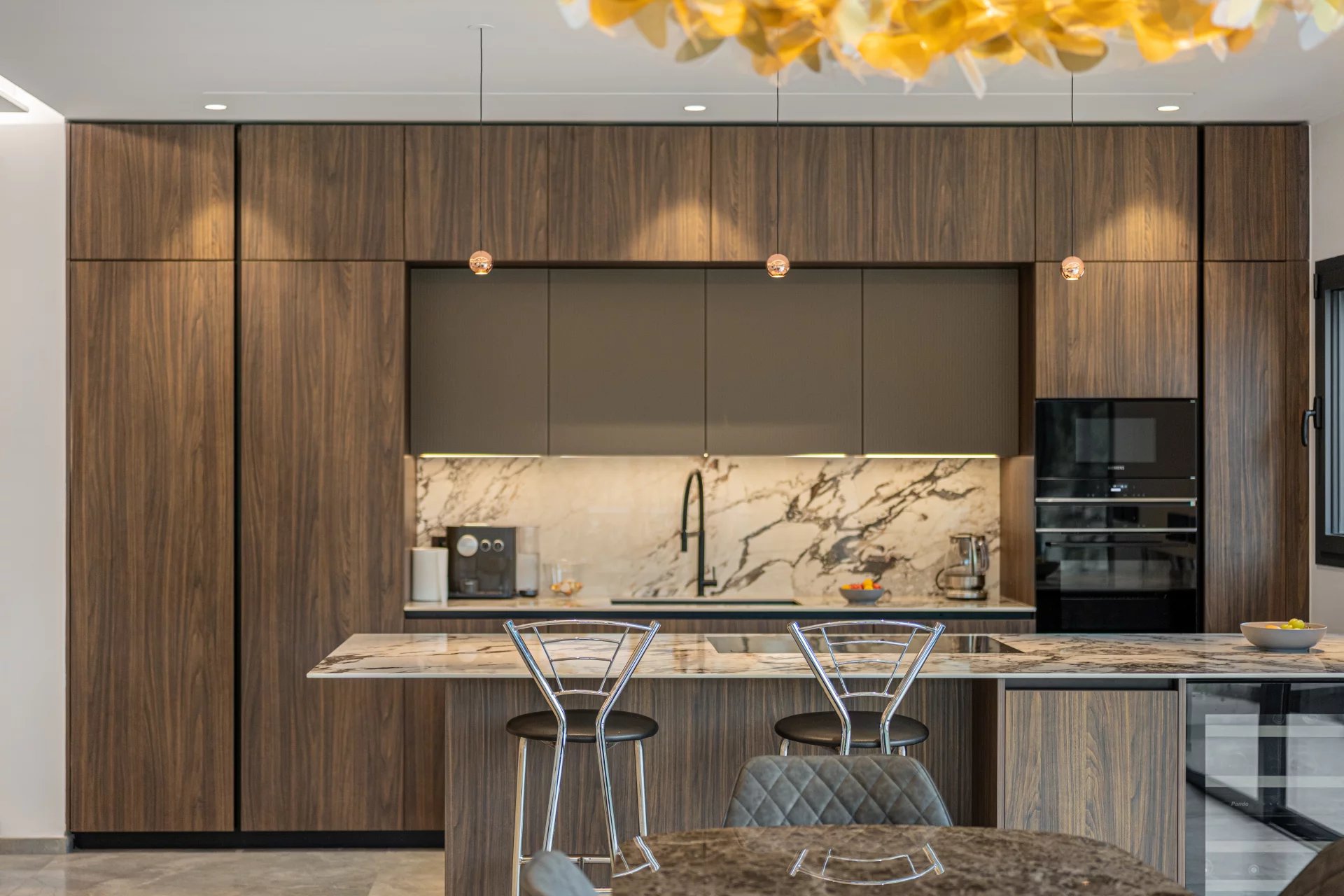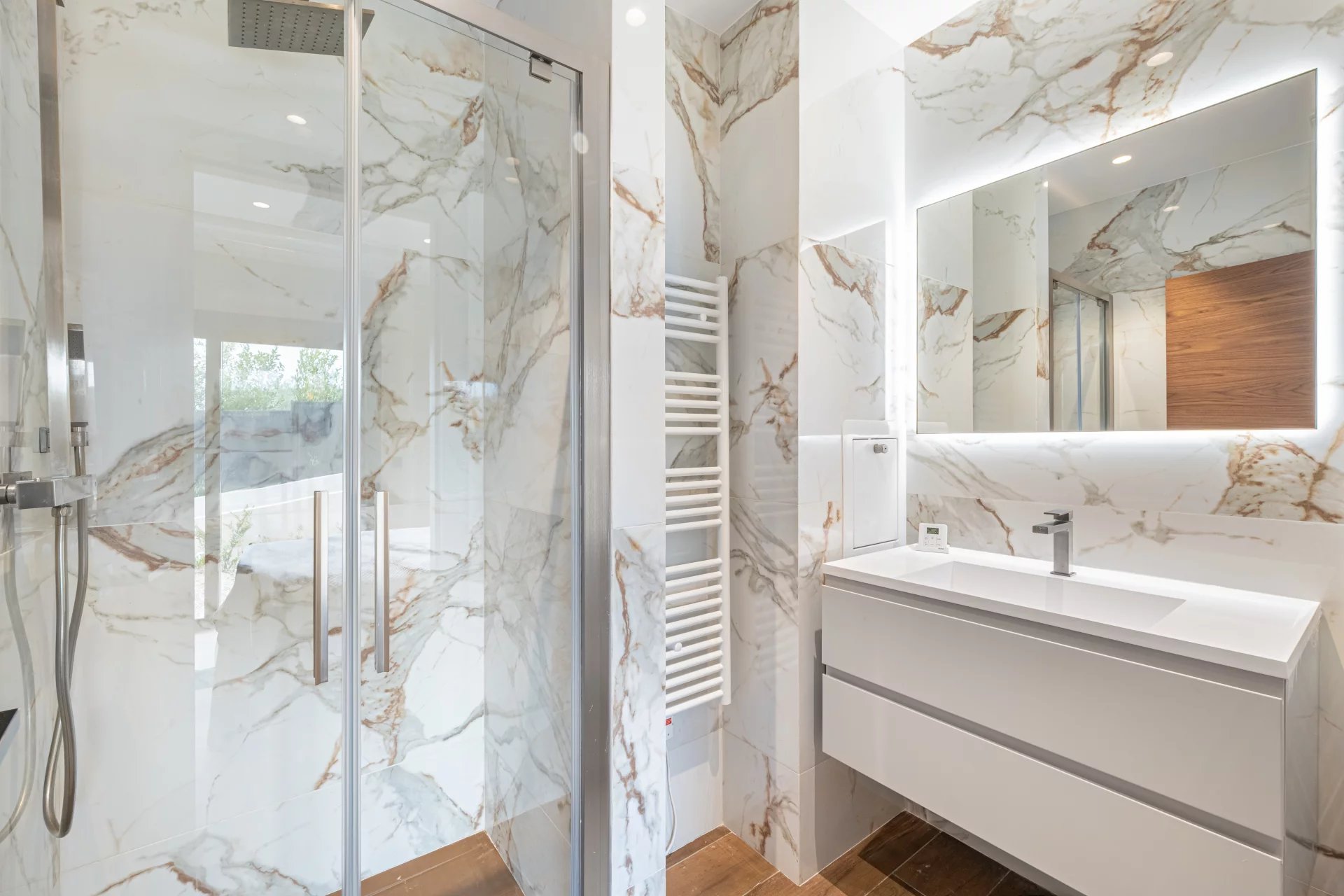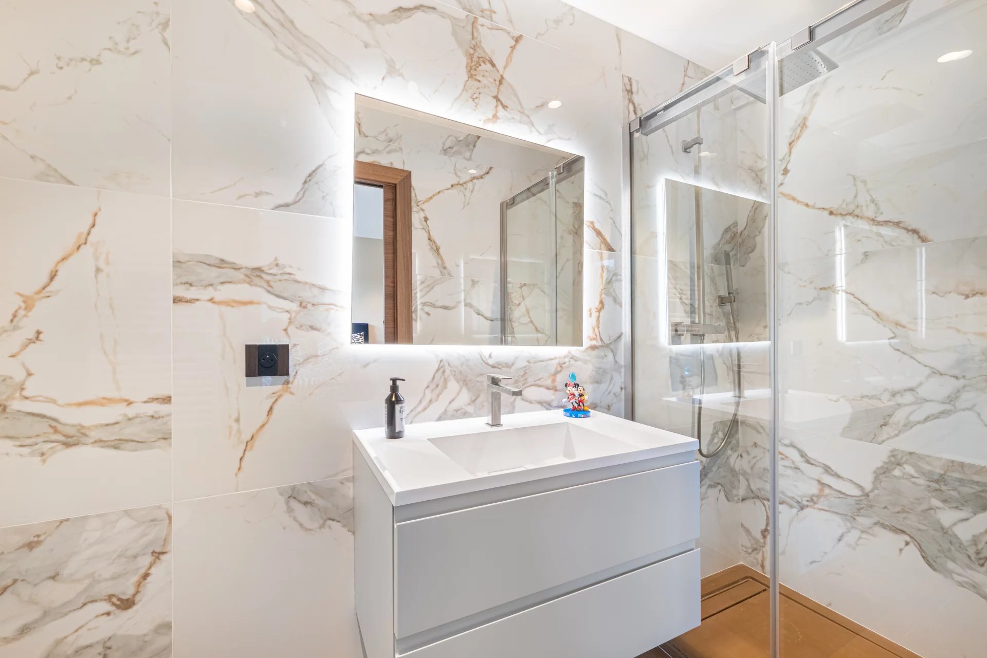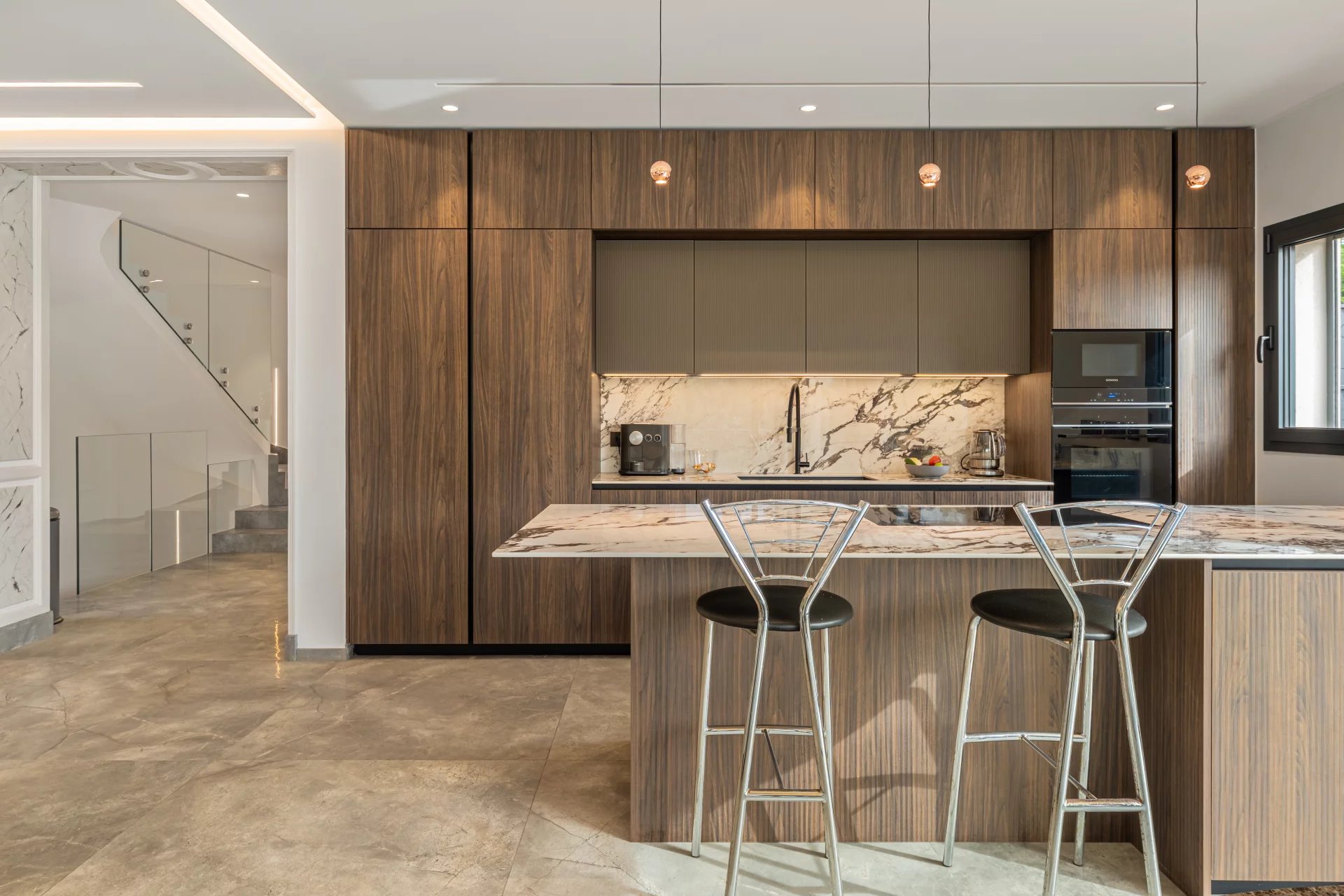 Upon entering, you are welcomed by a light-filled living and dining area with an open-plan, high-end kitchen. Large sliding doors create a seamless transition between the stylish interior and the spacious, covered terrace, revealing a stunning view of the pool and Jacuzzi.