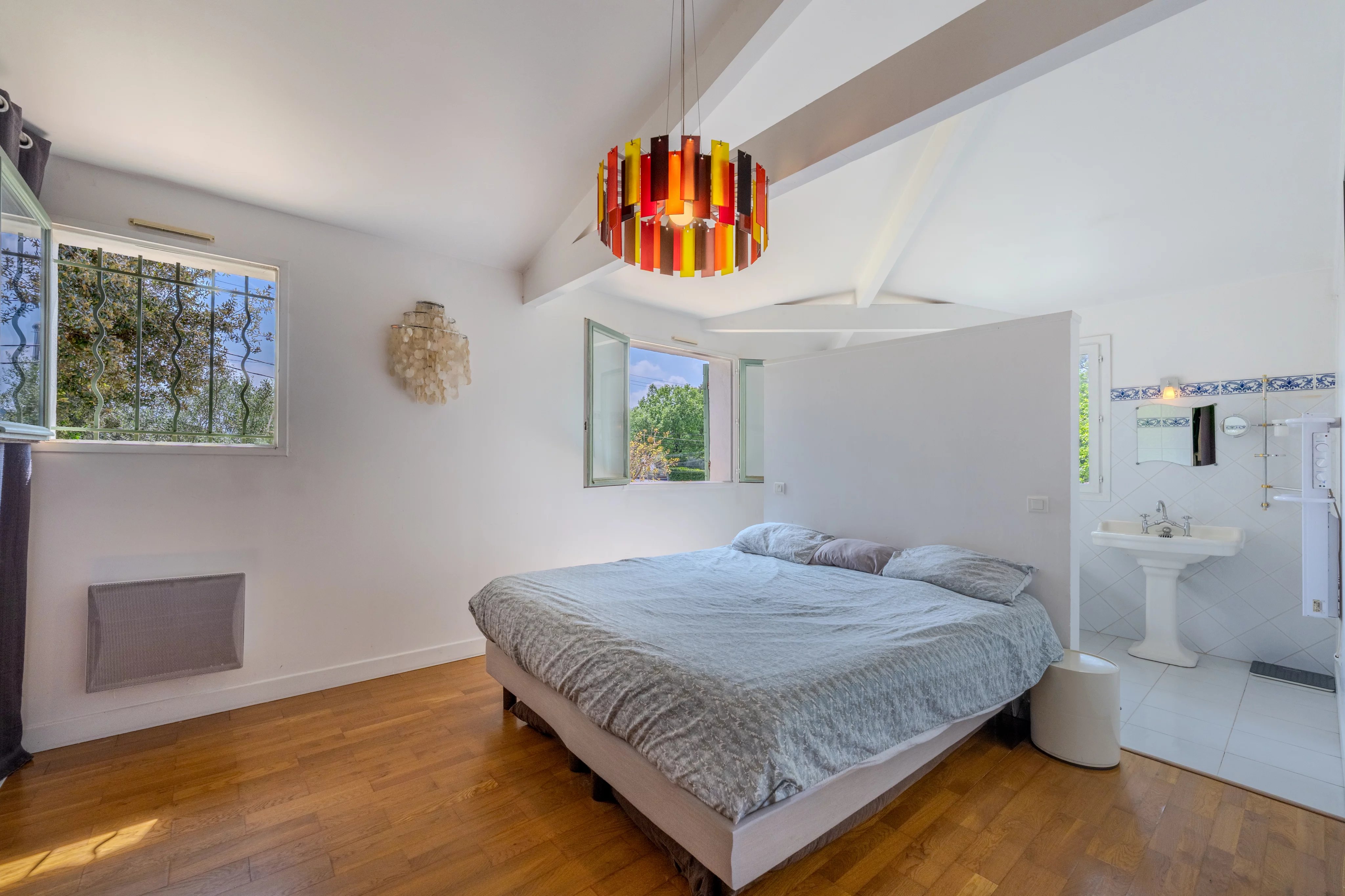 The ground floor features a master suite, offering the comfort of single-level living, which is particularly appreciated. Upstairs, an elegant master bedroom with its bathroom and three additional bedrooms share a bathroom, ideal for a large family or entertaining.