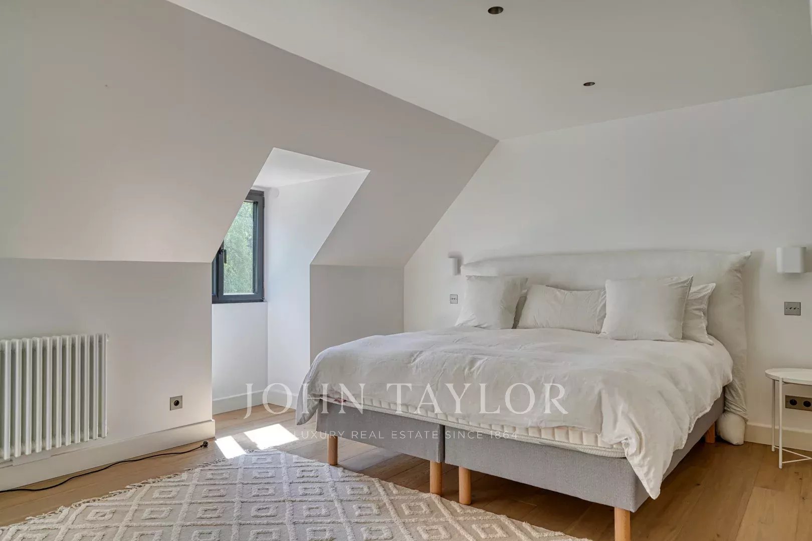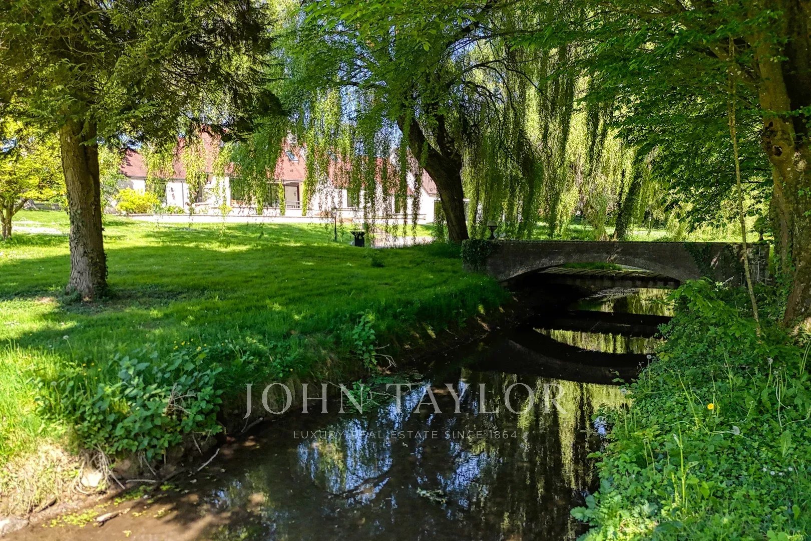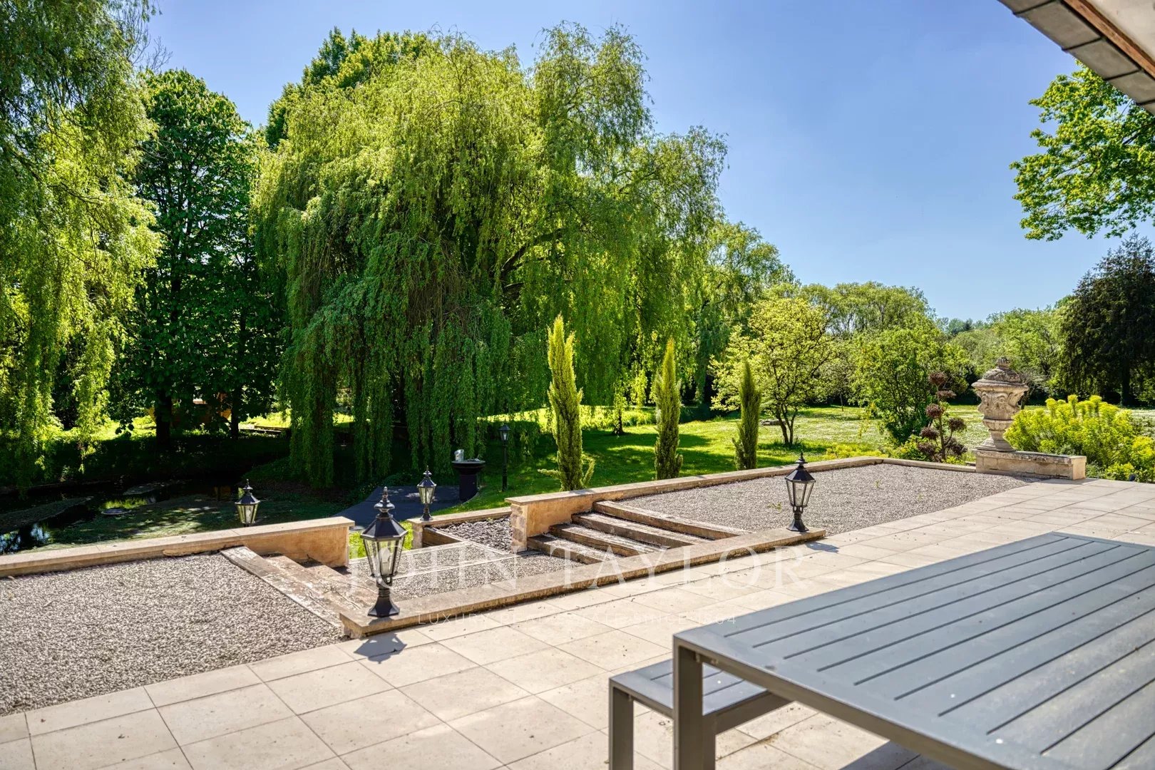 Fully renovated, the property spans approximately 285 m² and offers wide, unobstructed views over a landscaped 1.3-hectare park, crossed by a lovely stream.