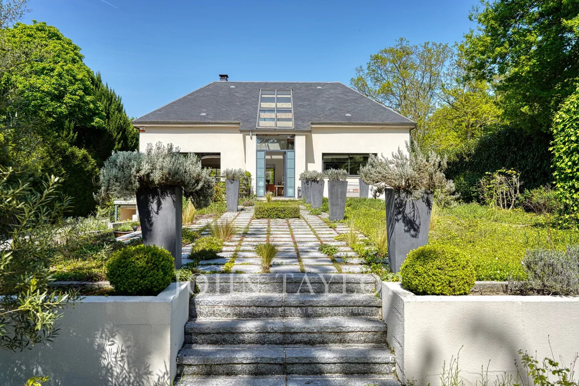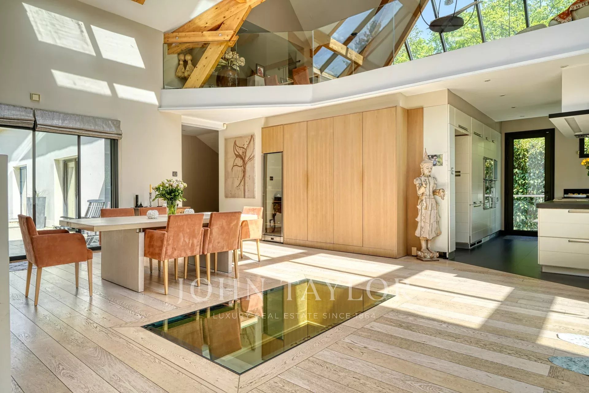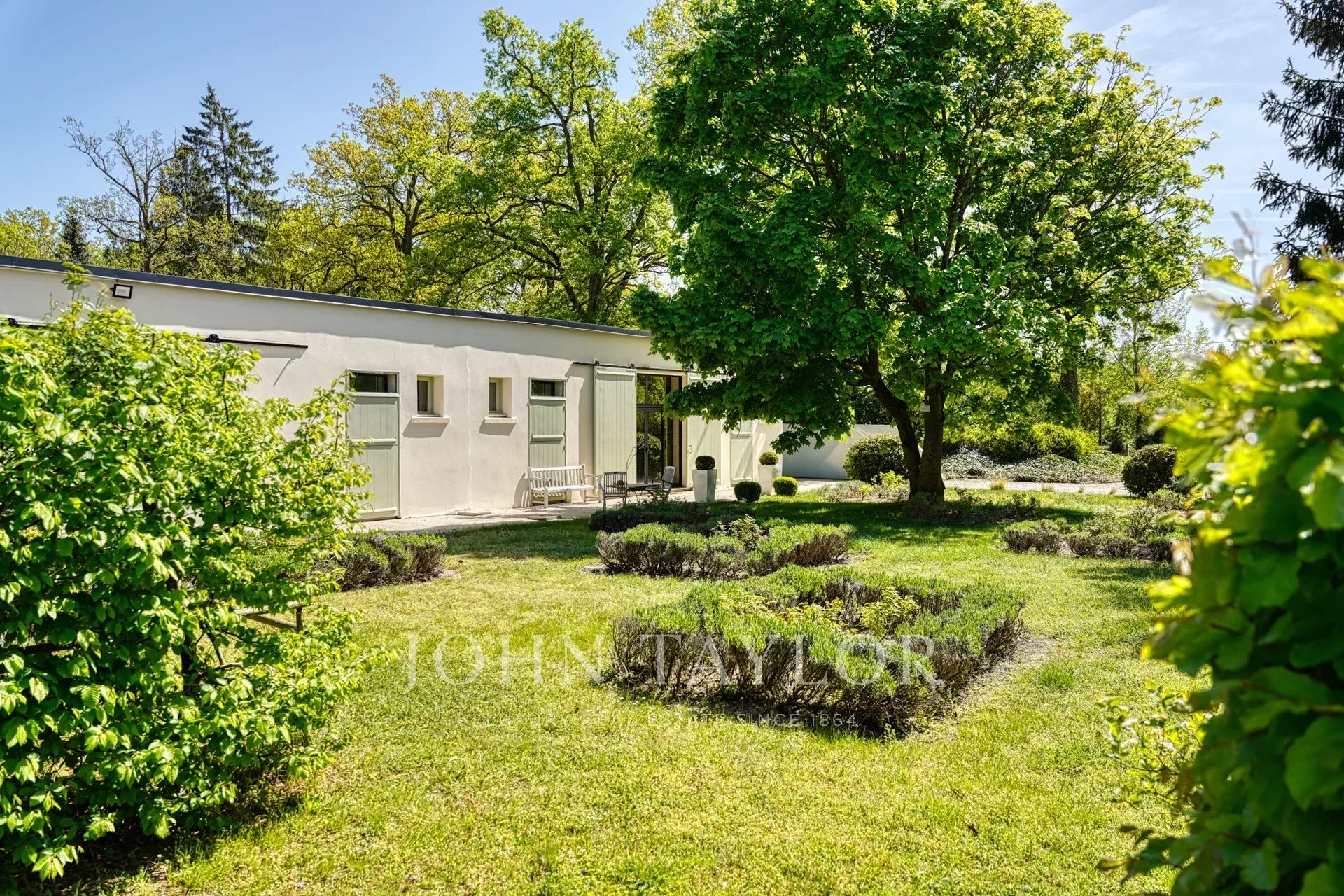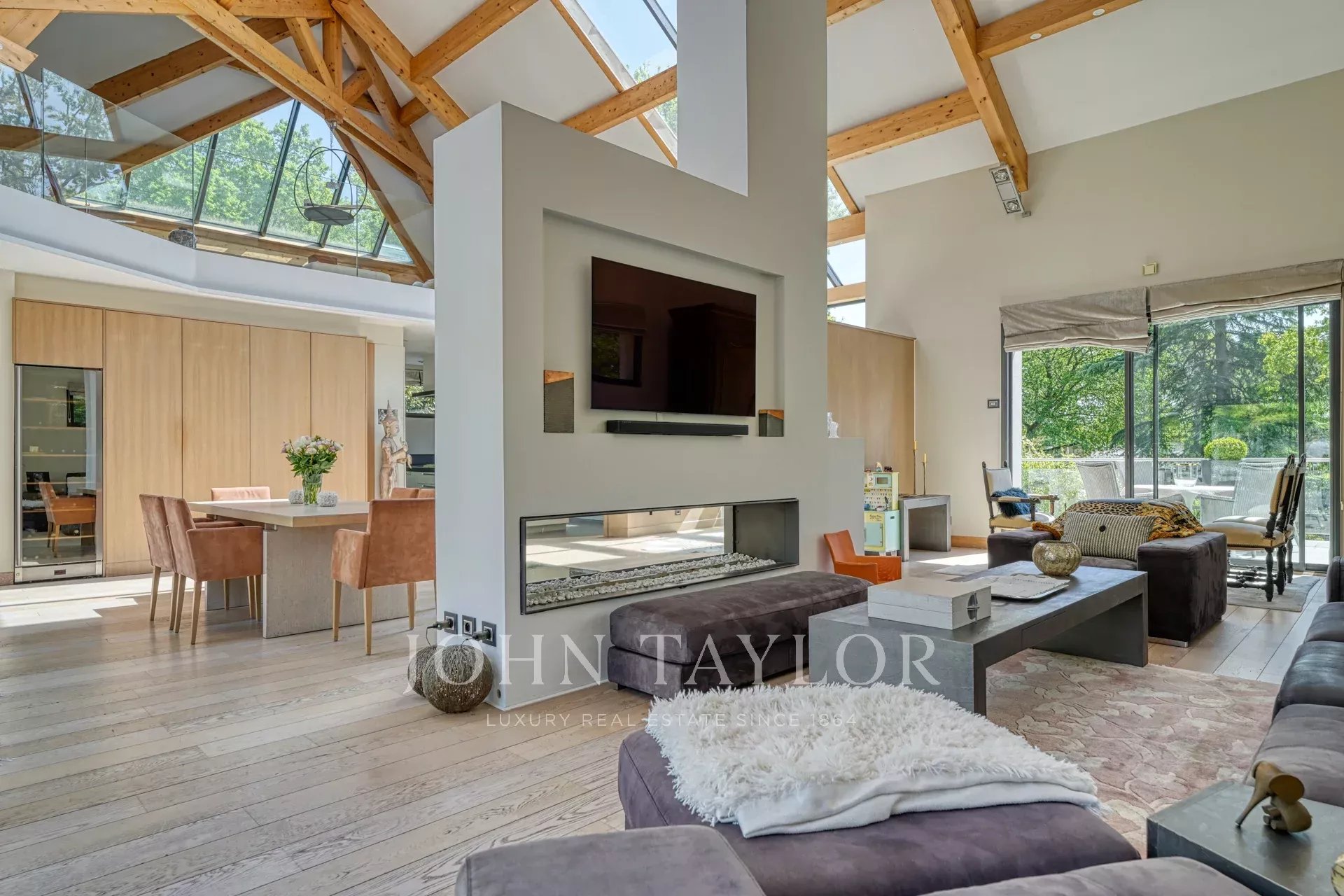 Just 45 minutes from Paris and 25 minutes from CDG Airport, nestled within the private and golf estate of Le Lys, this early 2000s architect-designed home enjoys a preserved setting, entirely sheltered from view.