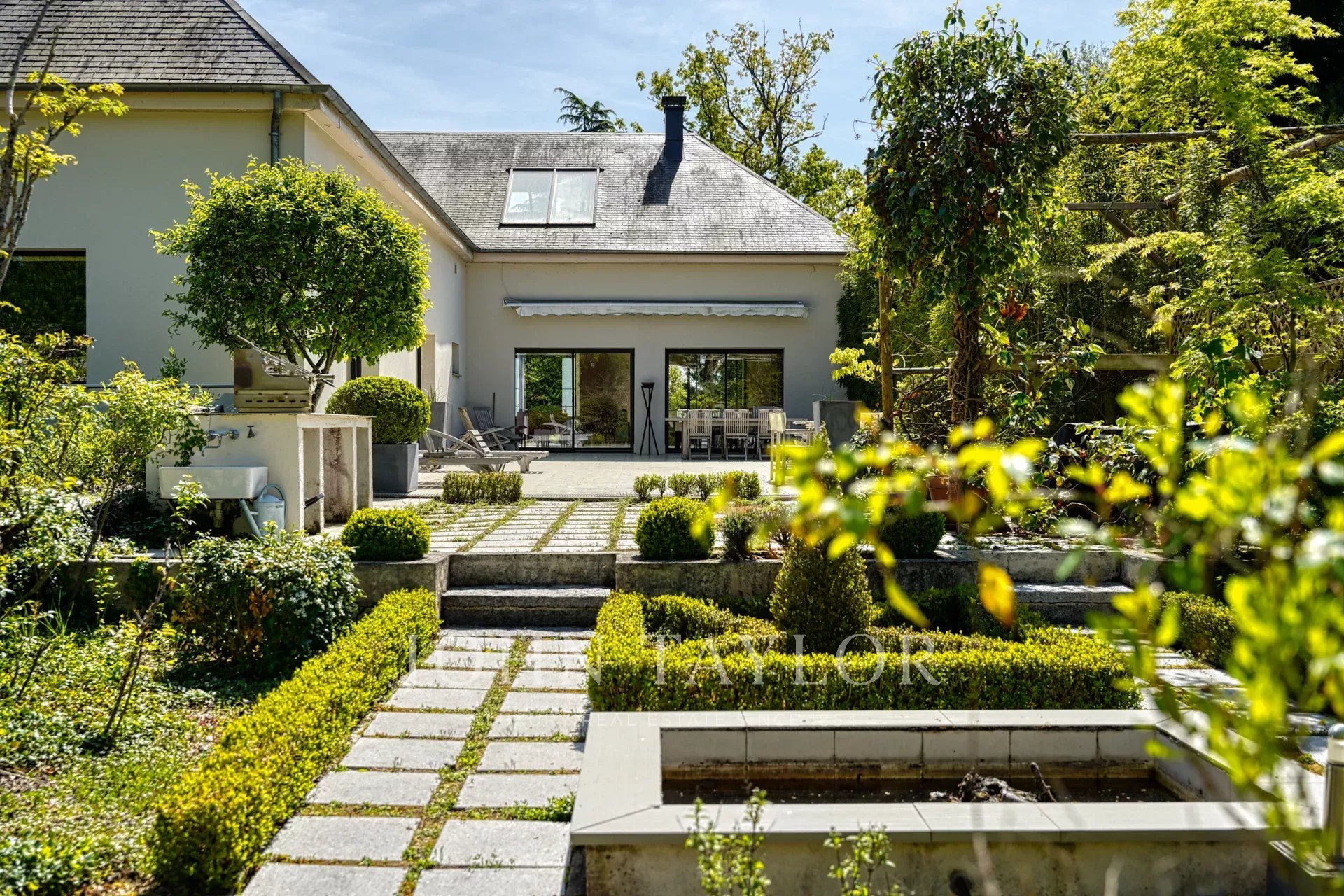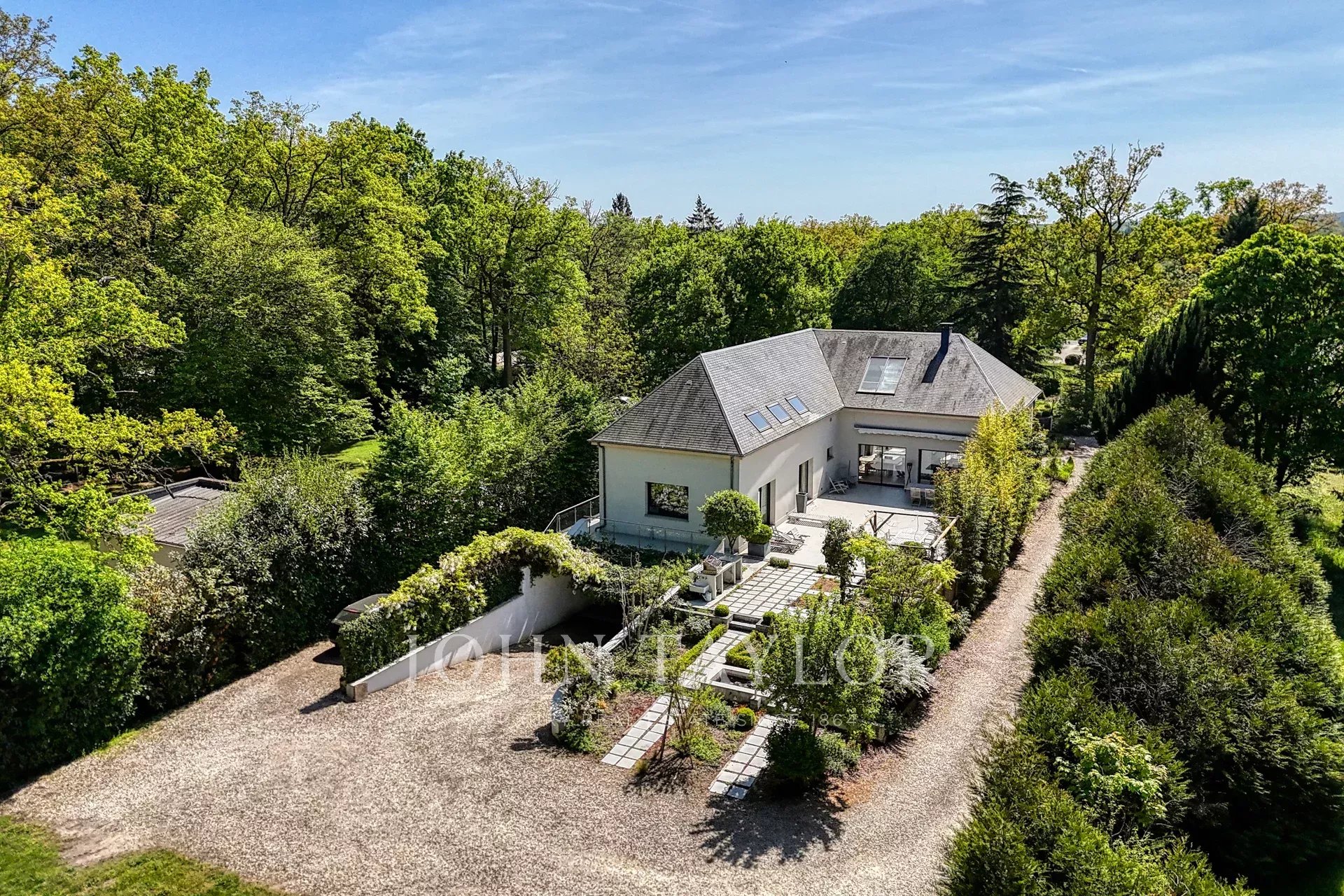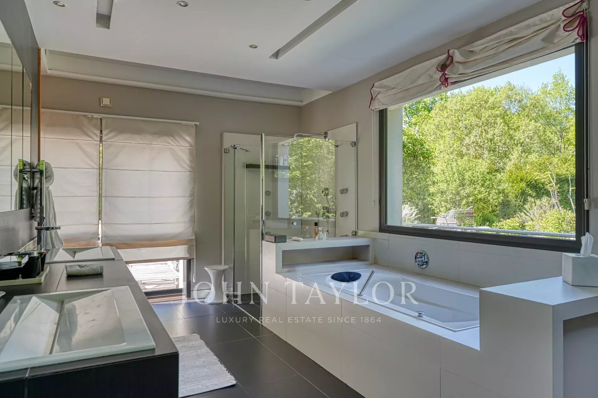 Just 45 minutes from Paris and 25 minutes from CDG Airport, nestled within the private and golf estate of Le Lys, this early 2000s architect-designed home enjoys a preserved setting, entirely sheltered from view.