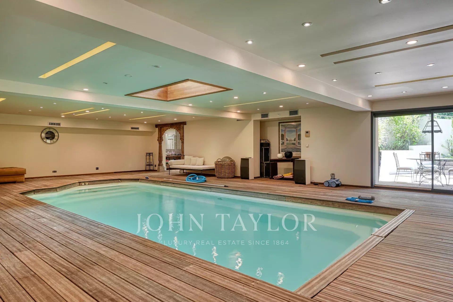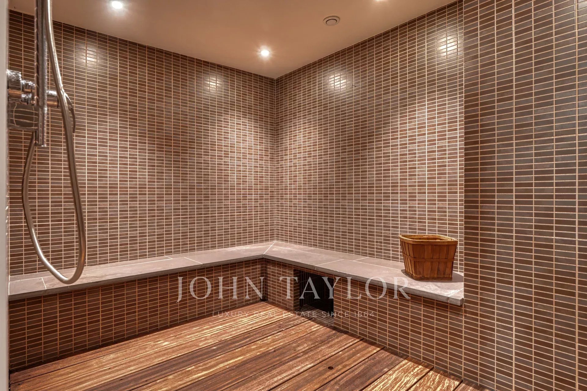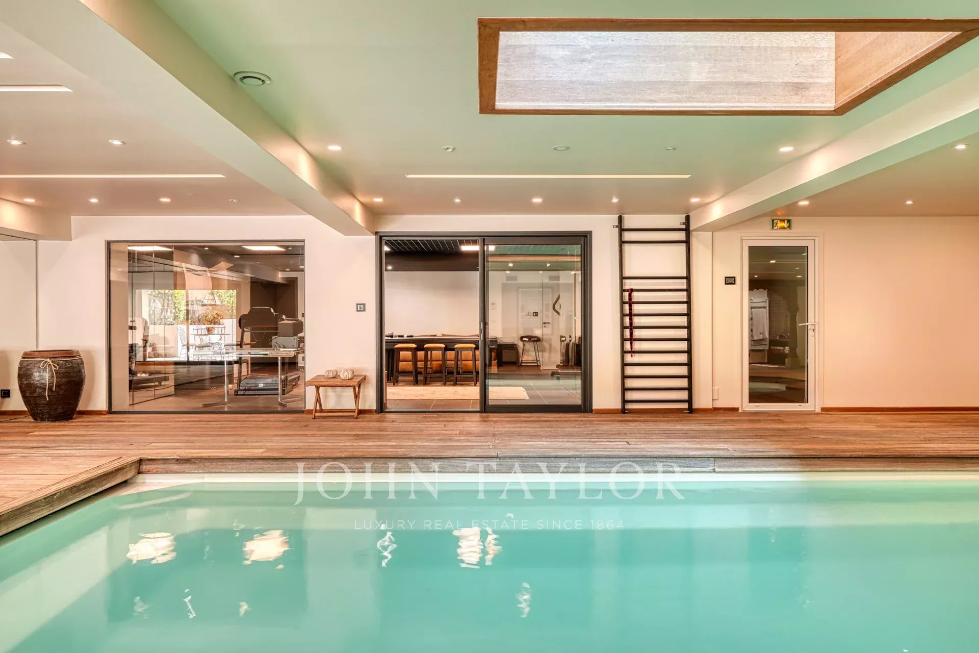 The garden level is dedicated to wellness and leisure, offering an indoor swimming pool, hammam, fitness room, and home cinema, as well as a garage for two vehicles.