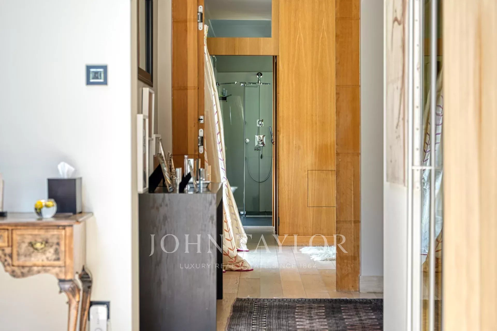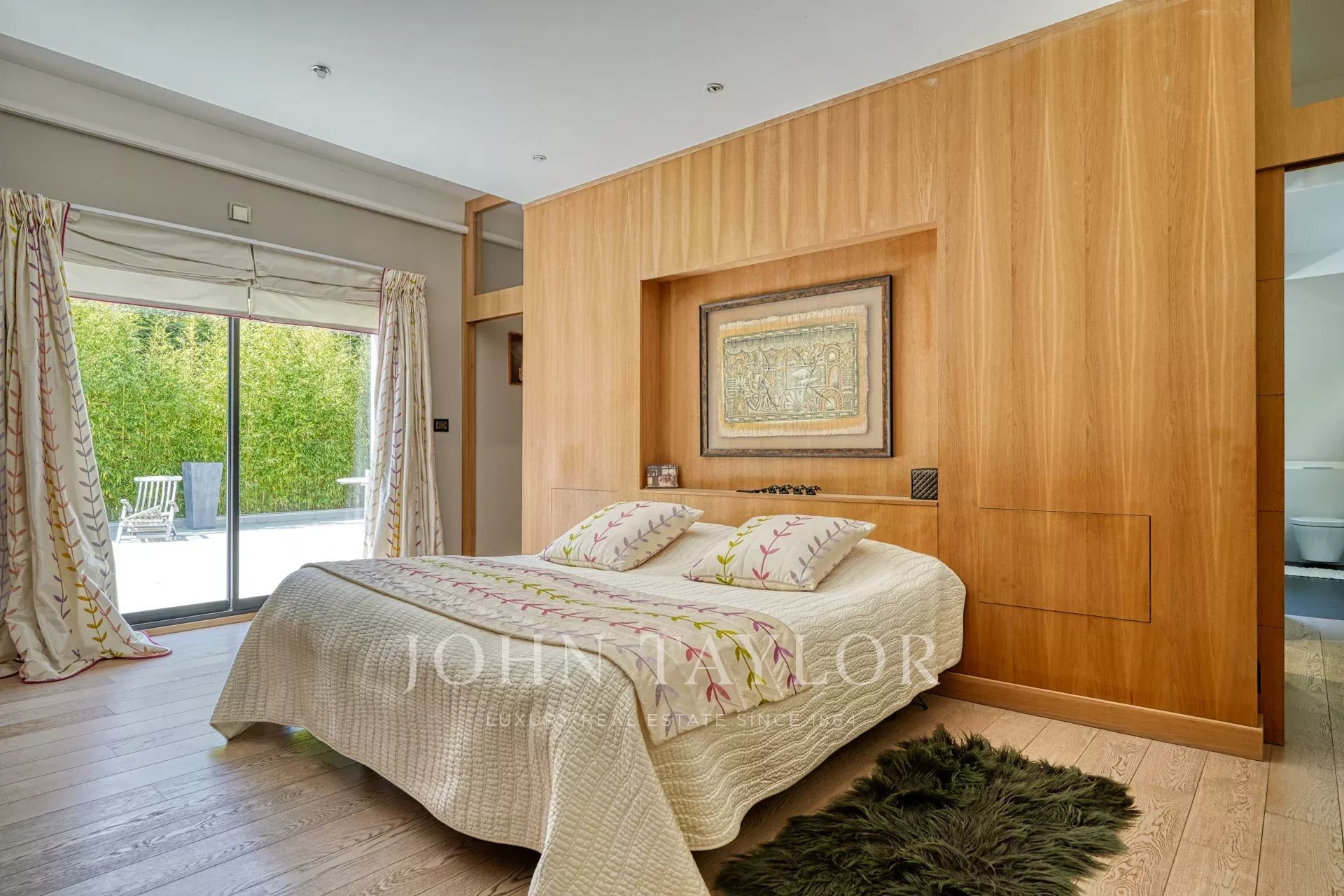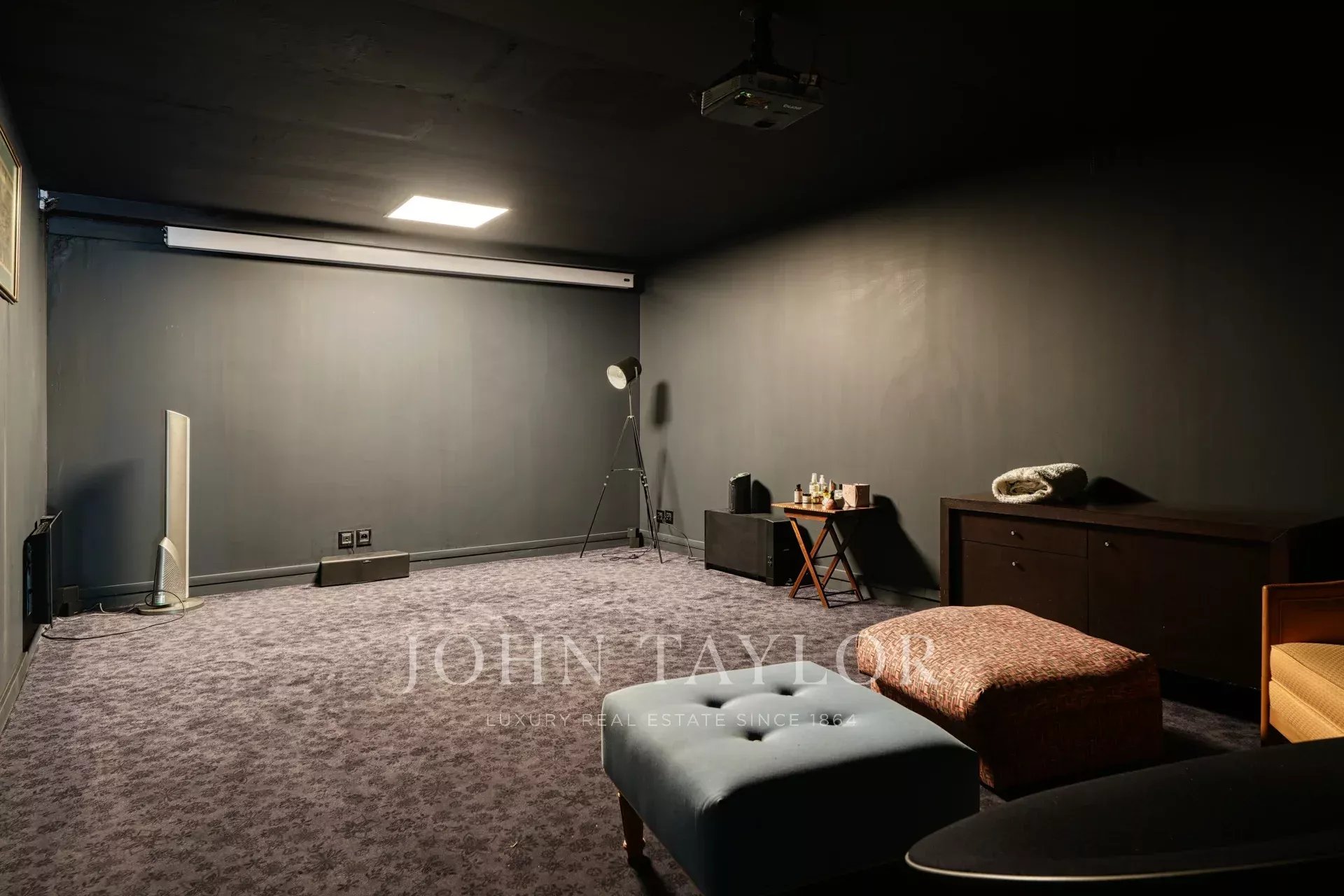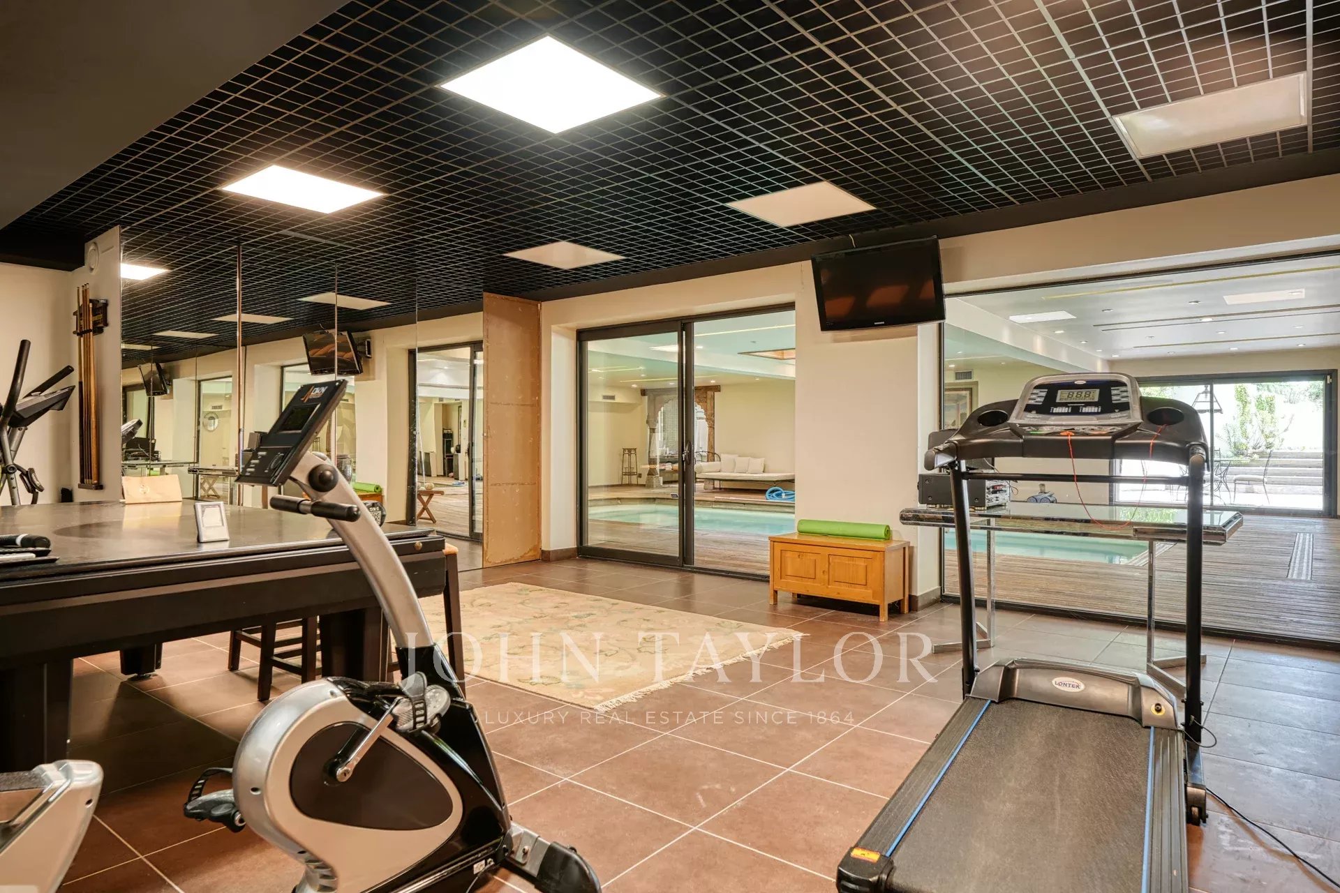 The garden level is dedicated to wellness and leisure, offering an indoor swimming pool, hammam, fitness room, and home cinema, as well as a garage for two vehicles.