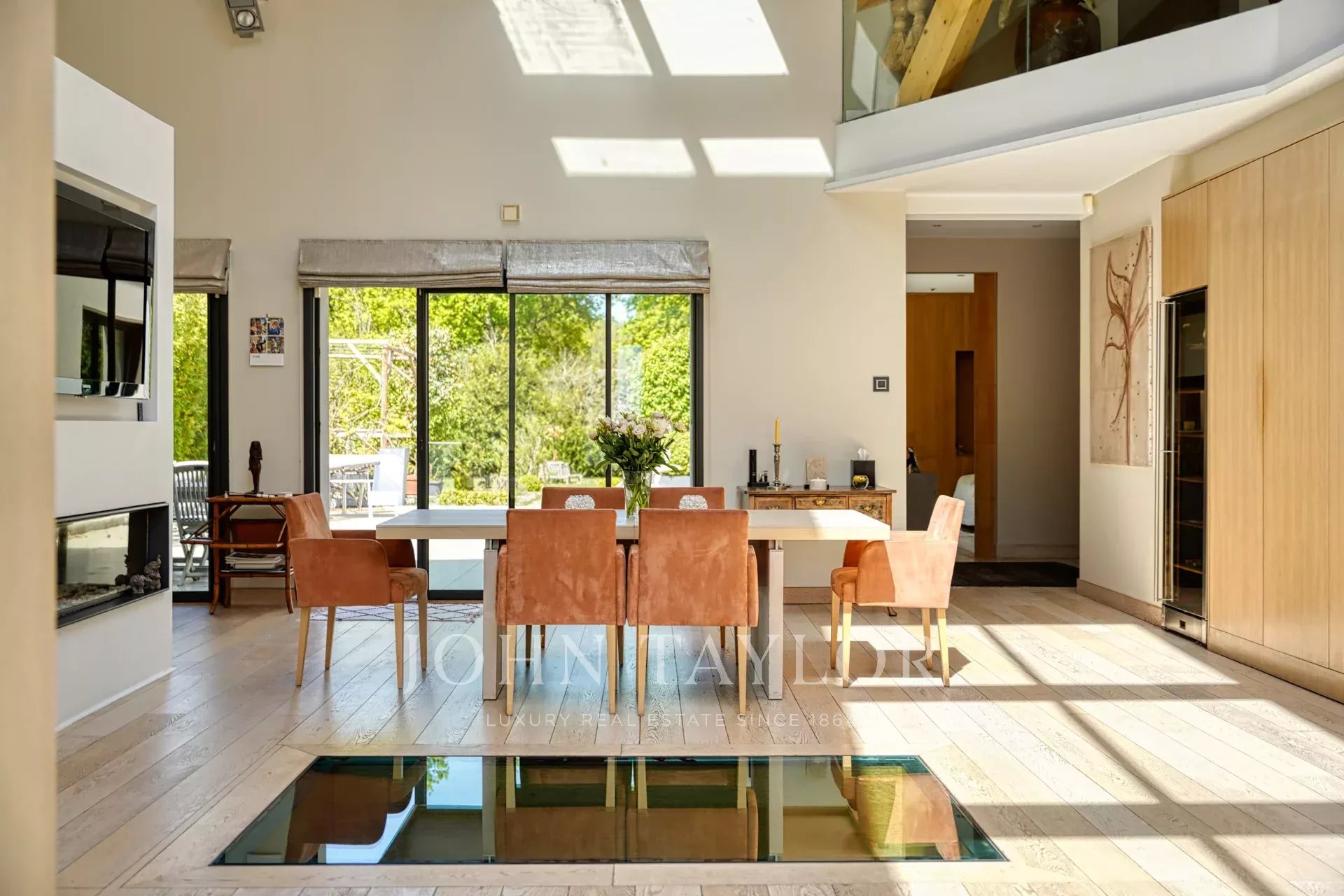 The architecture emphasizes open volumes and natural light, with expansive floor-to-ceiling windows overlooking the garden. The property offers an intimate atmosphere, in perfect harmony with its surroundings.