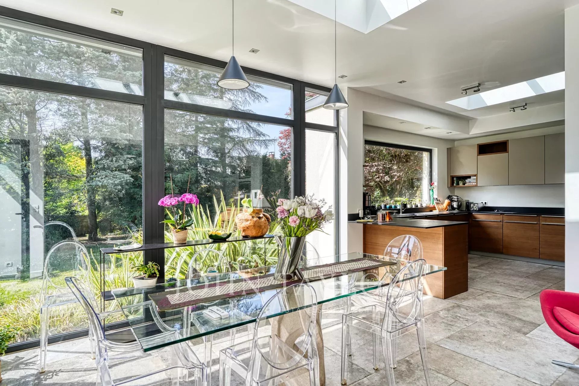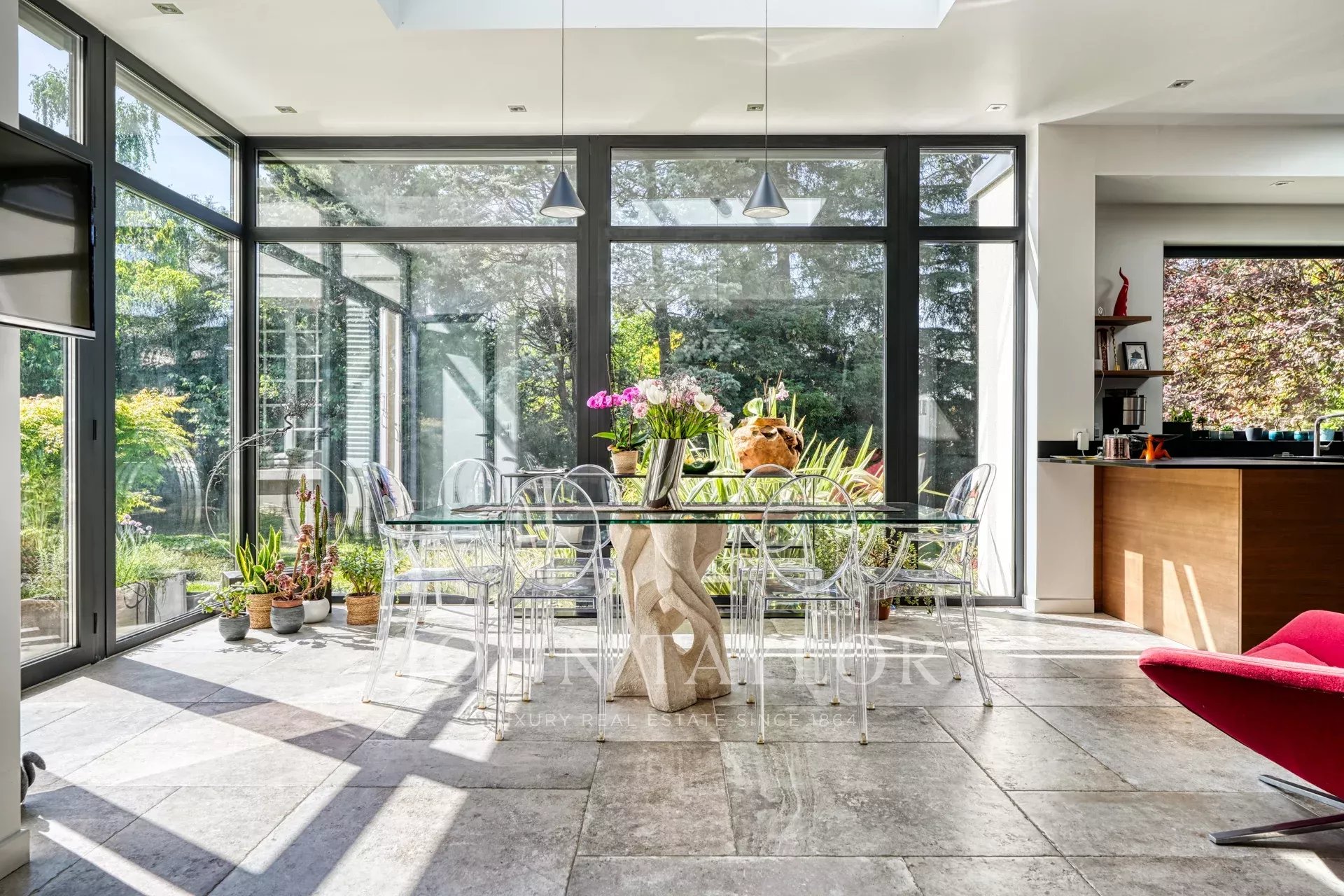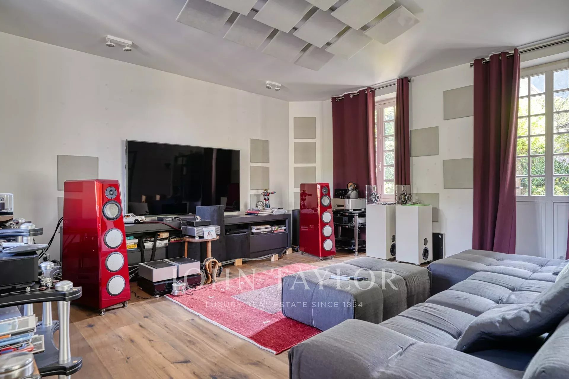 The reception areas, flooded with light through a west-east exposure, open generously onto the garden. The through-living room—particularly remarkable for its volume and brightness—is a central living space, ideal for entertaining. It extends to a dining area and a kitchen under a conservatory, equipped with high-end appliances, forming a smooth and convivial garden-level space. A home cinema space completes these amenities.