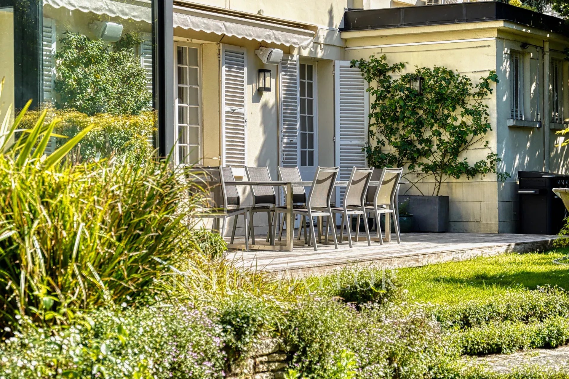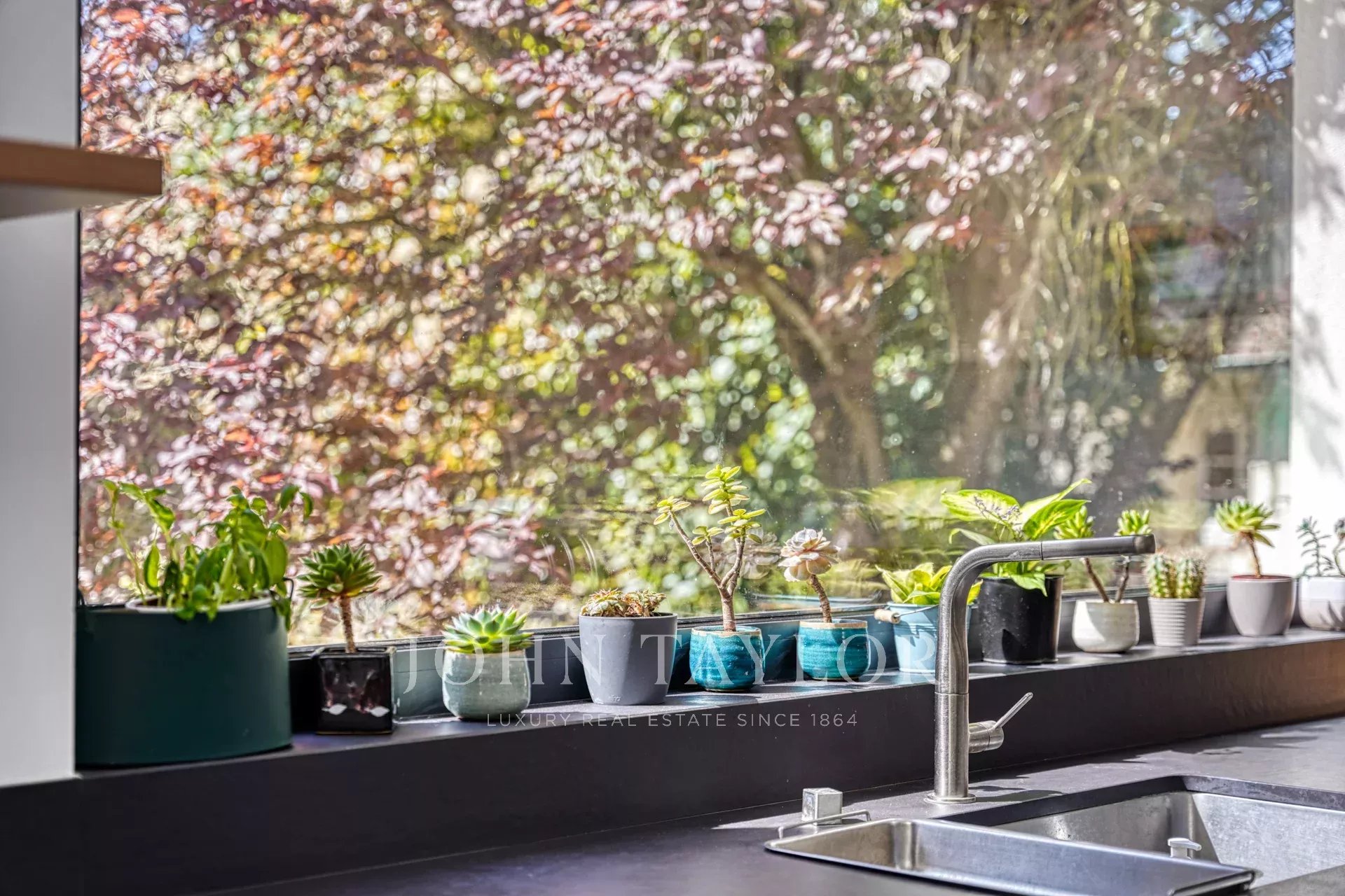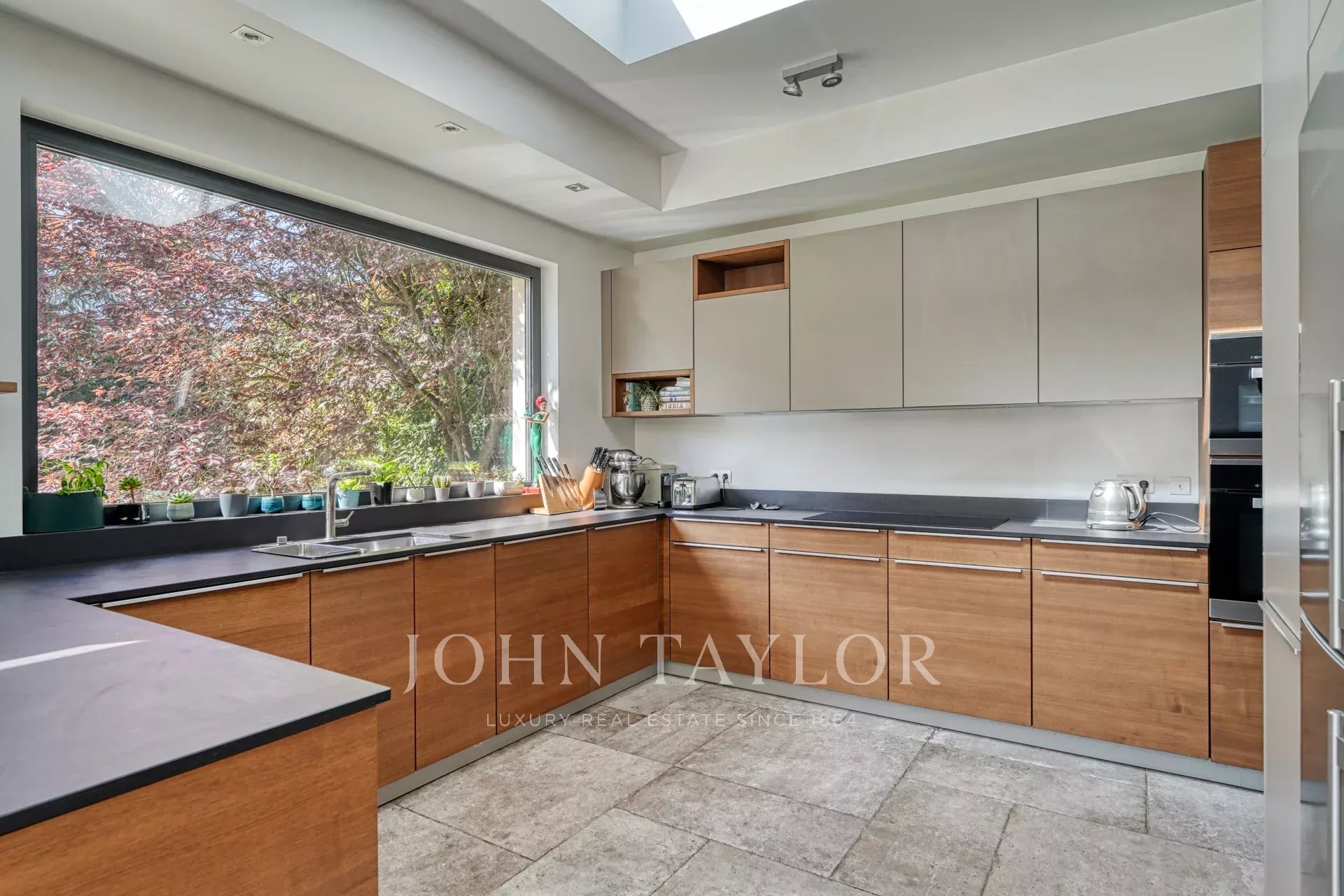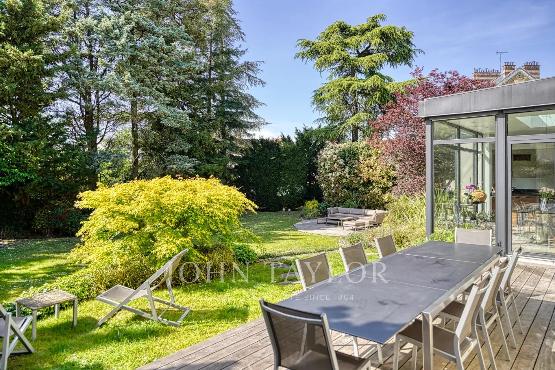The reception areas, flooded with light through a west-east exposure, open generously onto the garden. The through-living room—particularly remarkable for its volume and brightness—is a central living space, ideal for entertaining. It extends to a dining area and a kitchen under a conservatory, equipped with high-end appliances, forming a smooth and convivial garden-level space. A home cinema space completes these amenities.