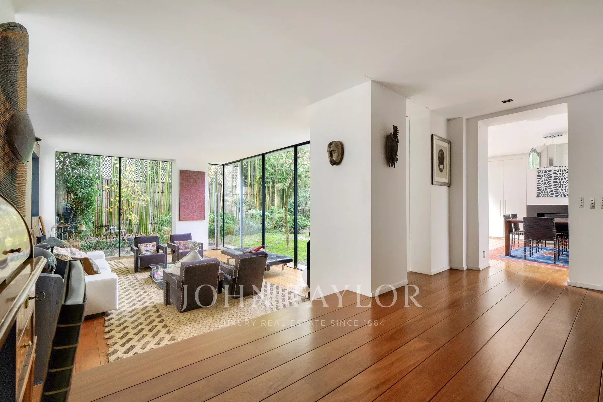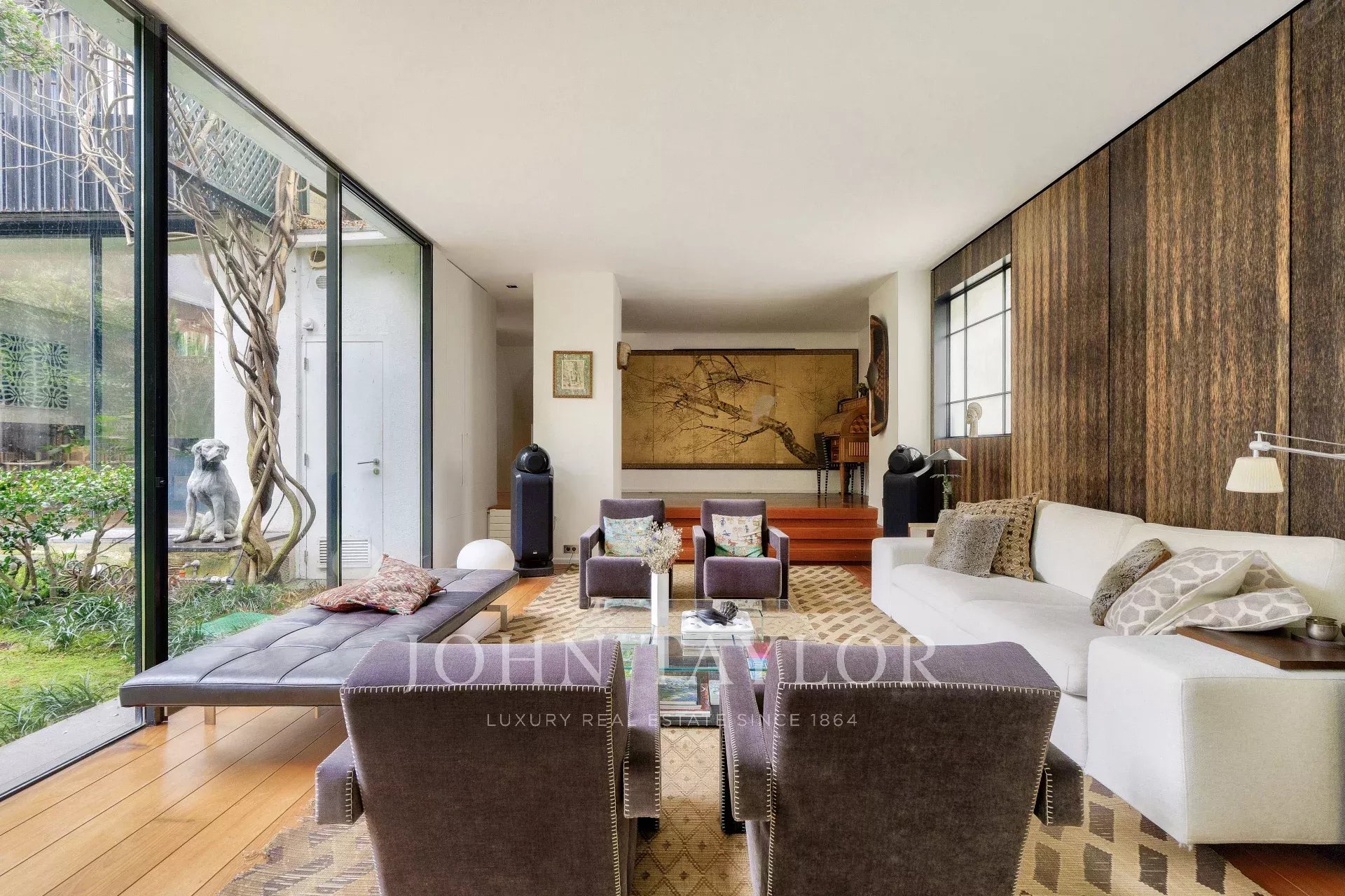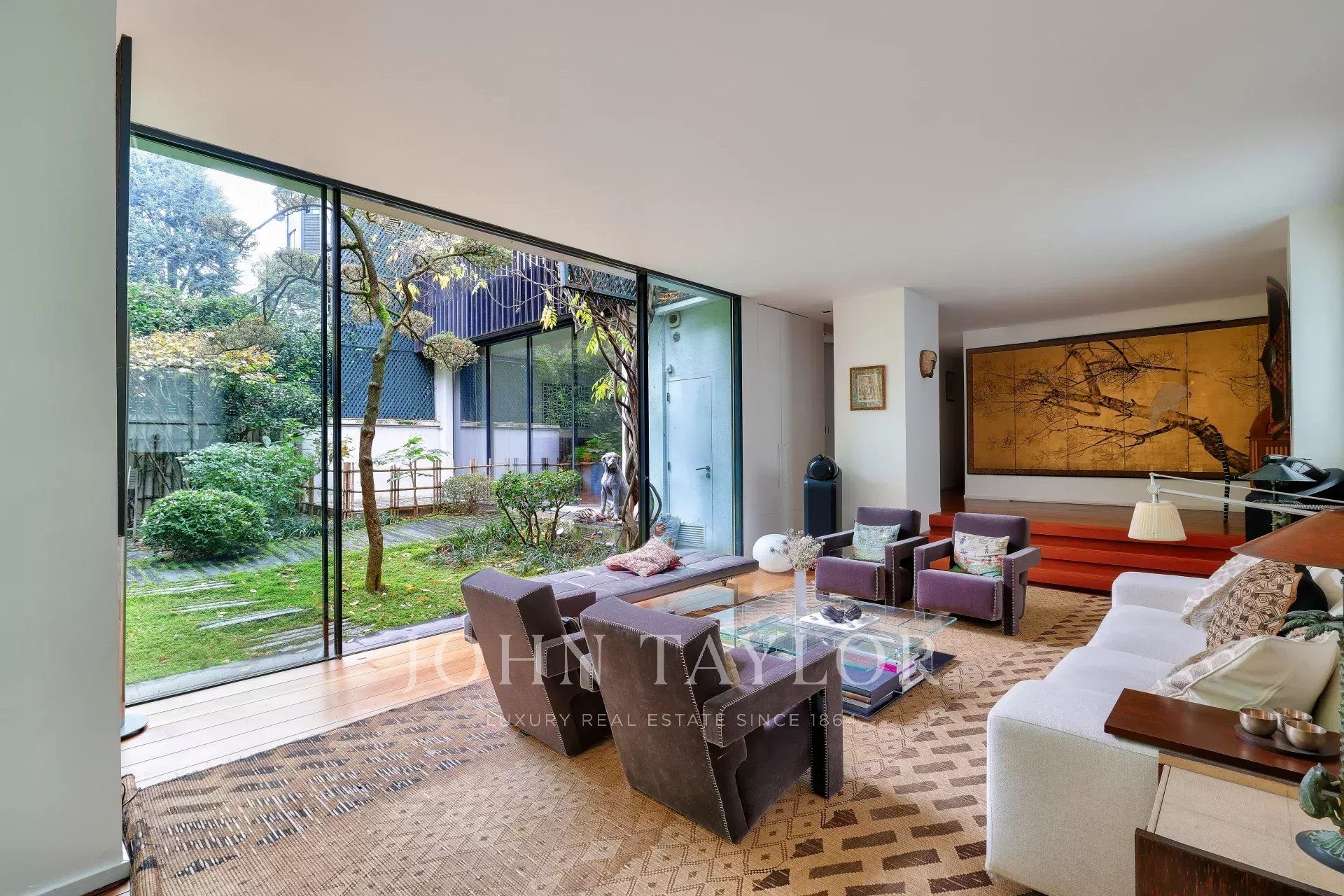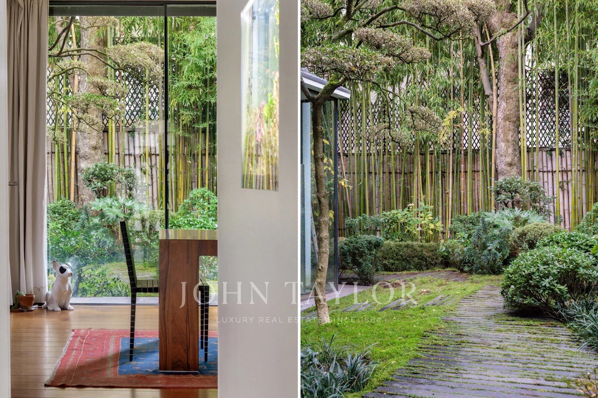 A vast living and dining room opening, thanks to its large bay windows, onto a sublime Japanese-inspired green sanctuary: a masterful work of craftsmanship, a true piece of art embracing the space and providing rare intimacy