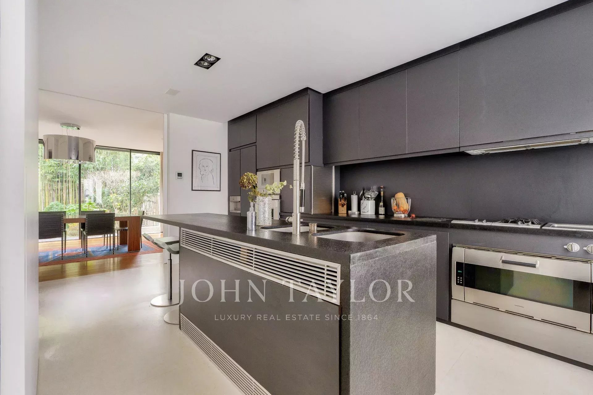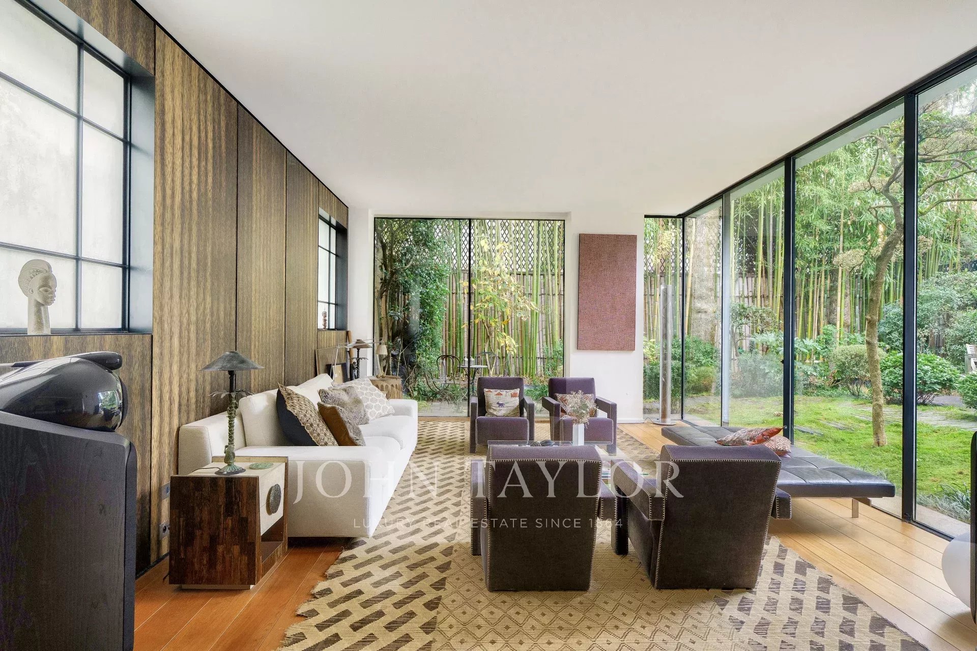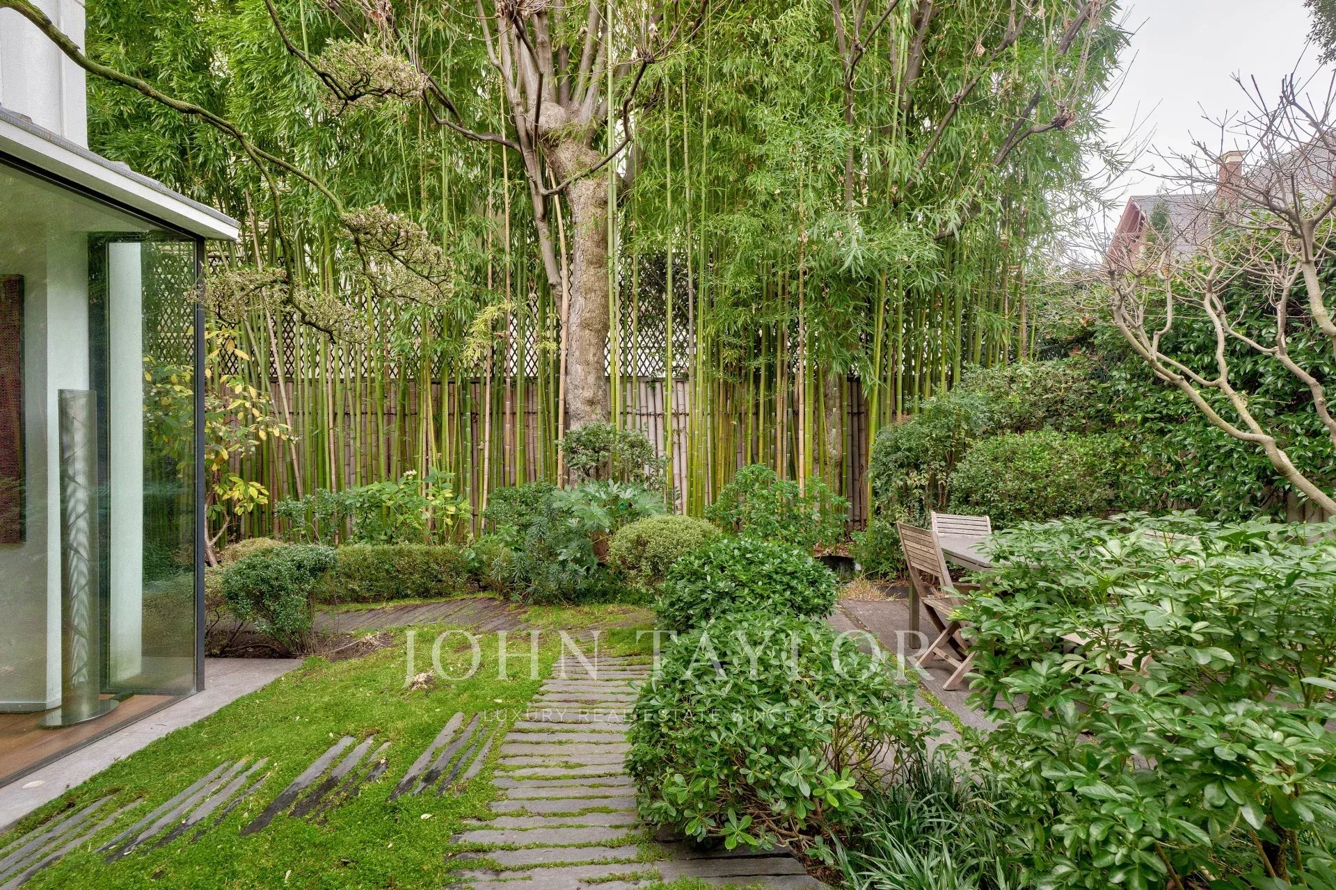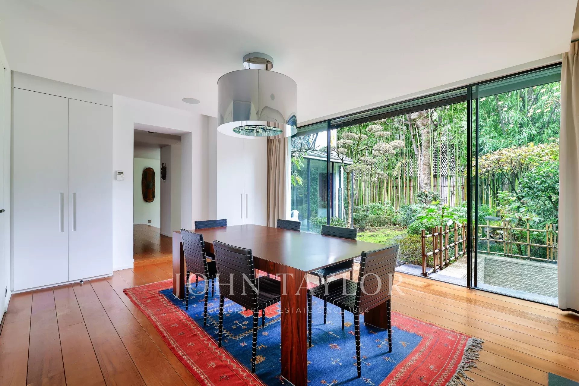 A vast living and dining room opening, thanks to its large bay windows, onto a sublime Japanese-inspired green sanctuary: a masterful work of craftsmanship, a true piece of art embracing the space and providing rare intimacy