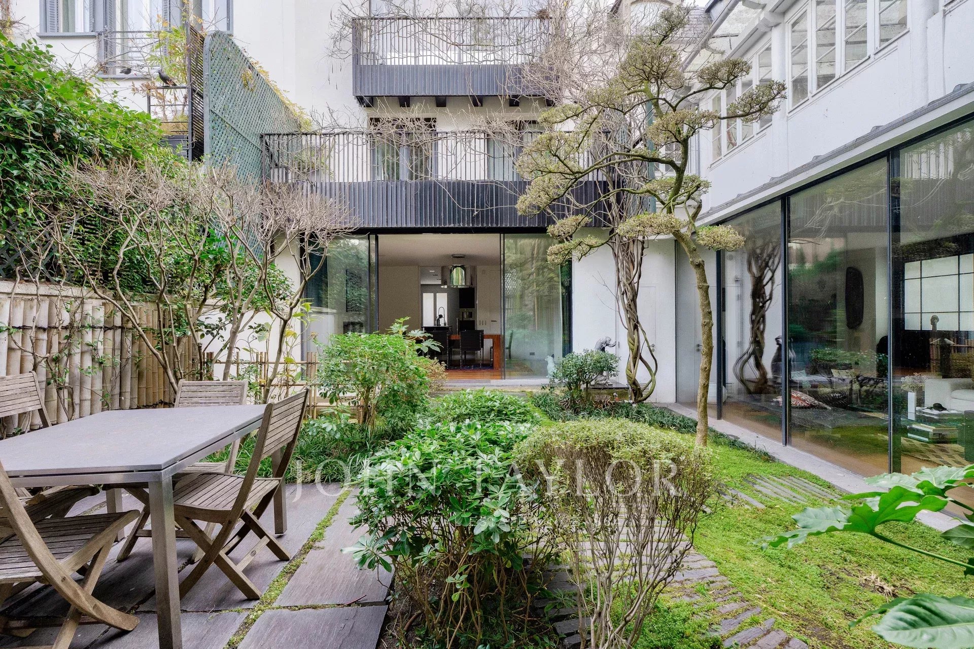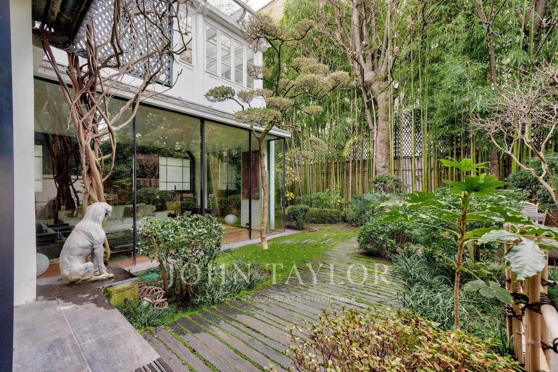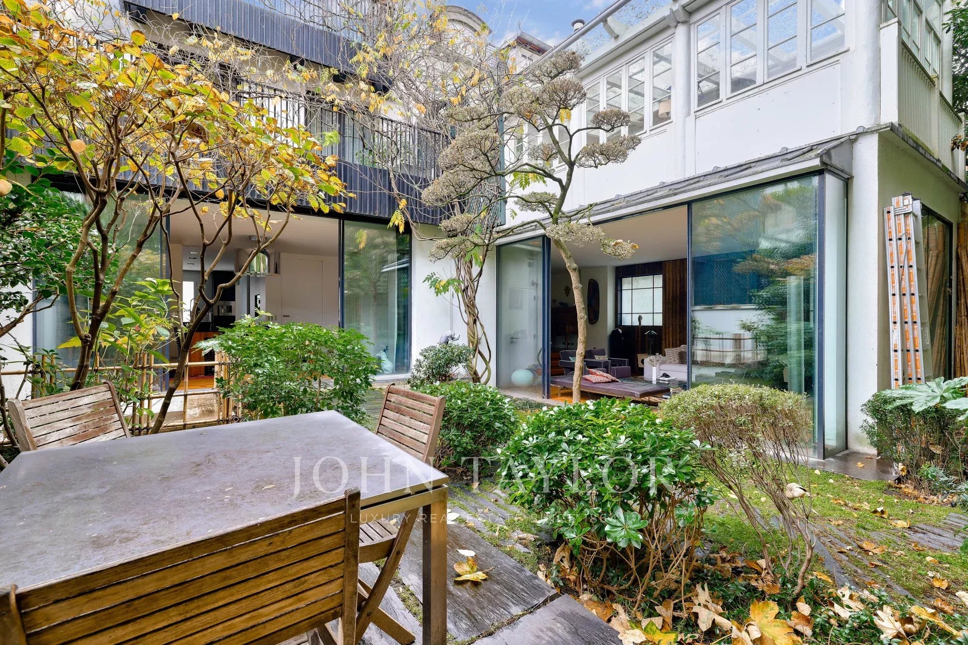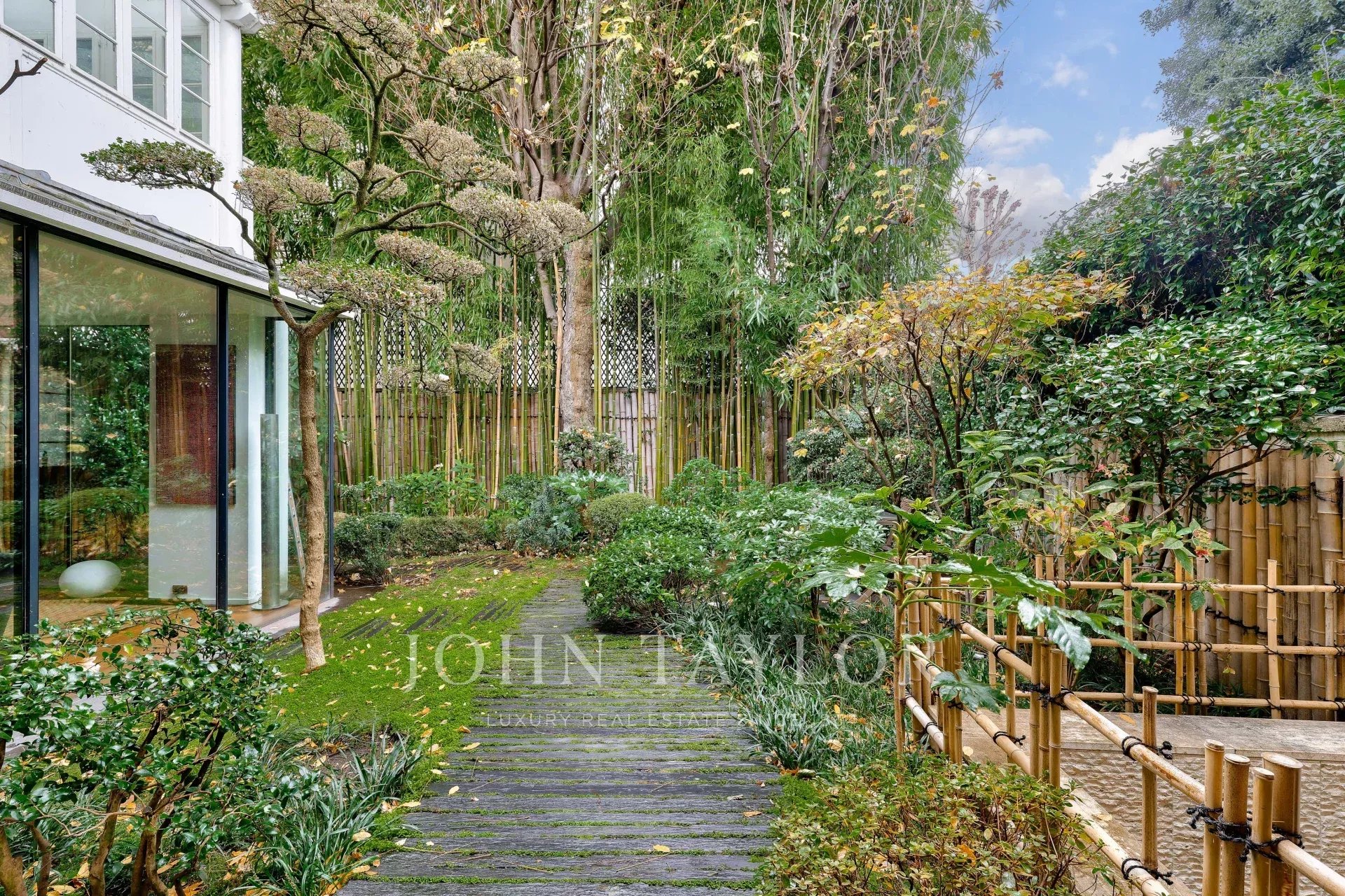 A vast living and dining room opening, thanks to its large bay windows, onto a sublime Japanese-inspired green sanctuary: a masterful work of craftsmanship, a true piece of art embracing the space and providing rare intimacy