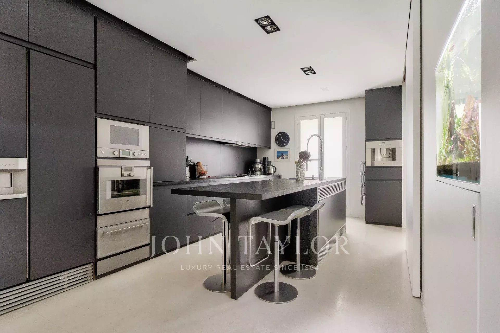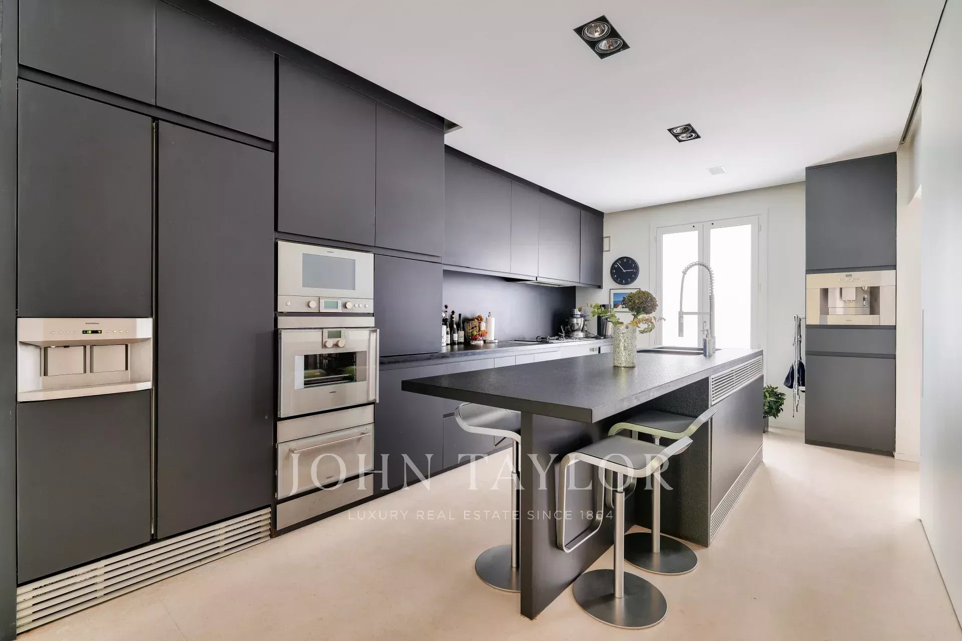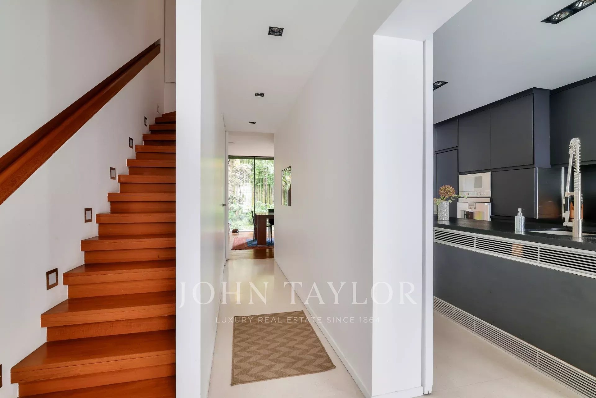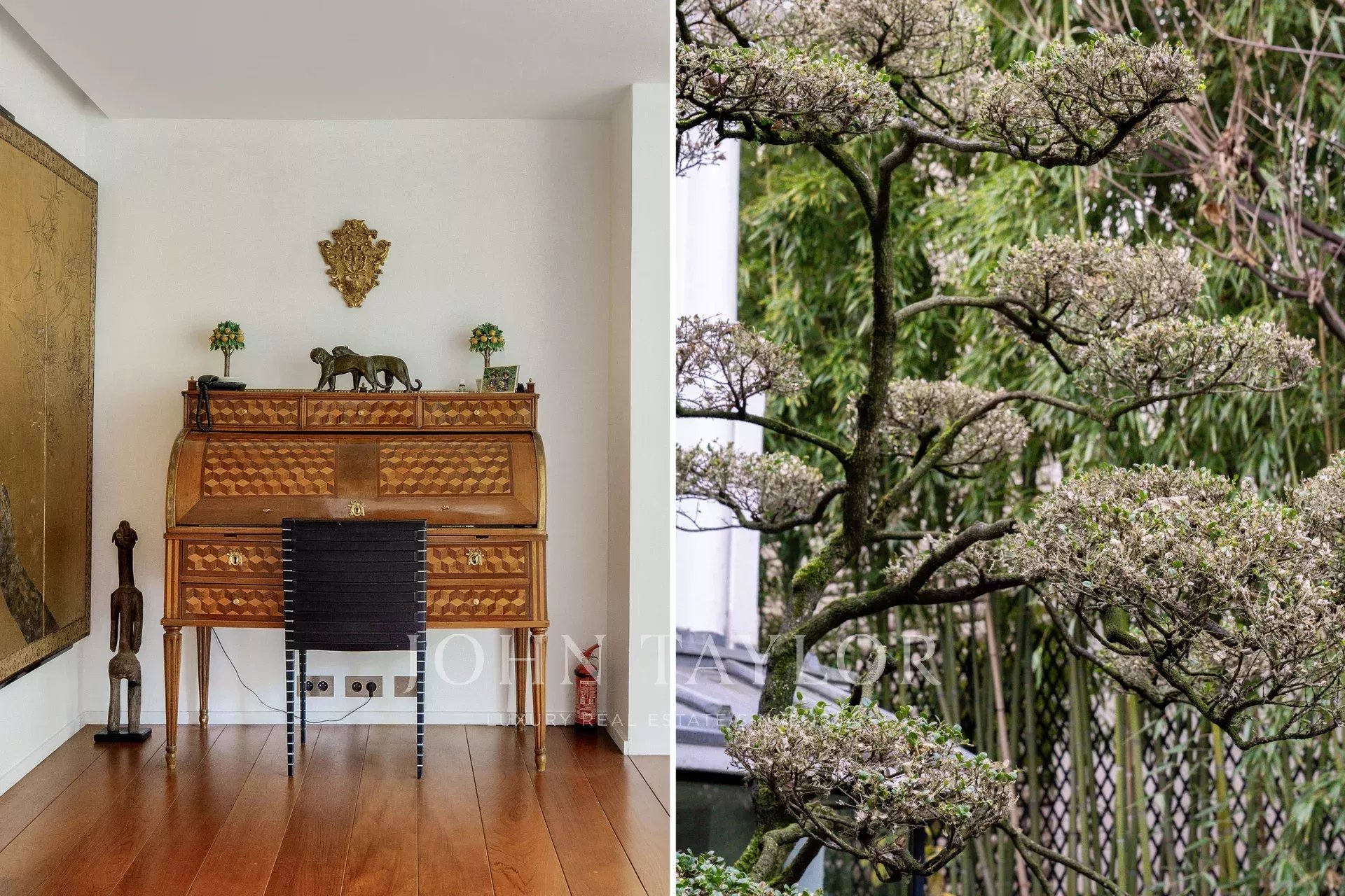 A vast living and dining room opening, thanks to its large bay windows, onto a sublime Japanese-inspired green sanctuary: a masterful work of craftsmanship, a true piece of art embracing the space and providing rare intimacy
