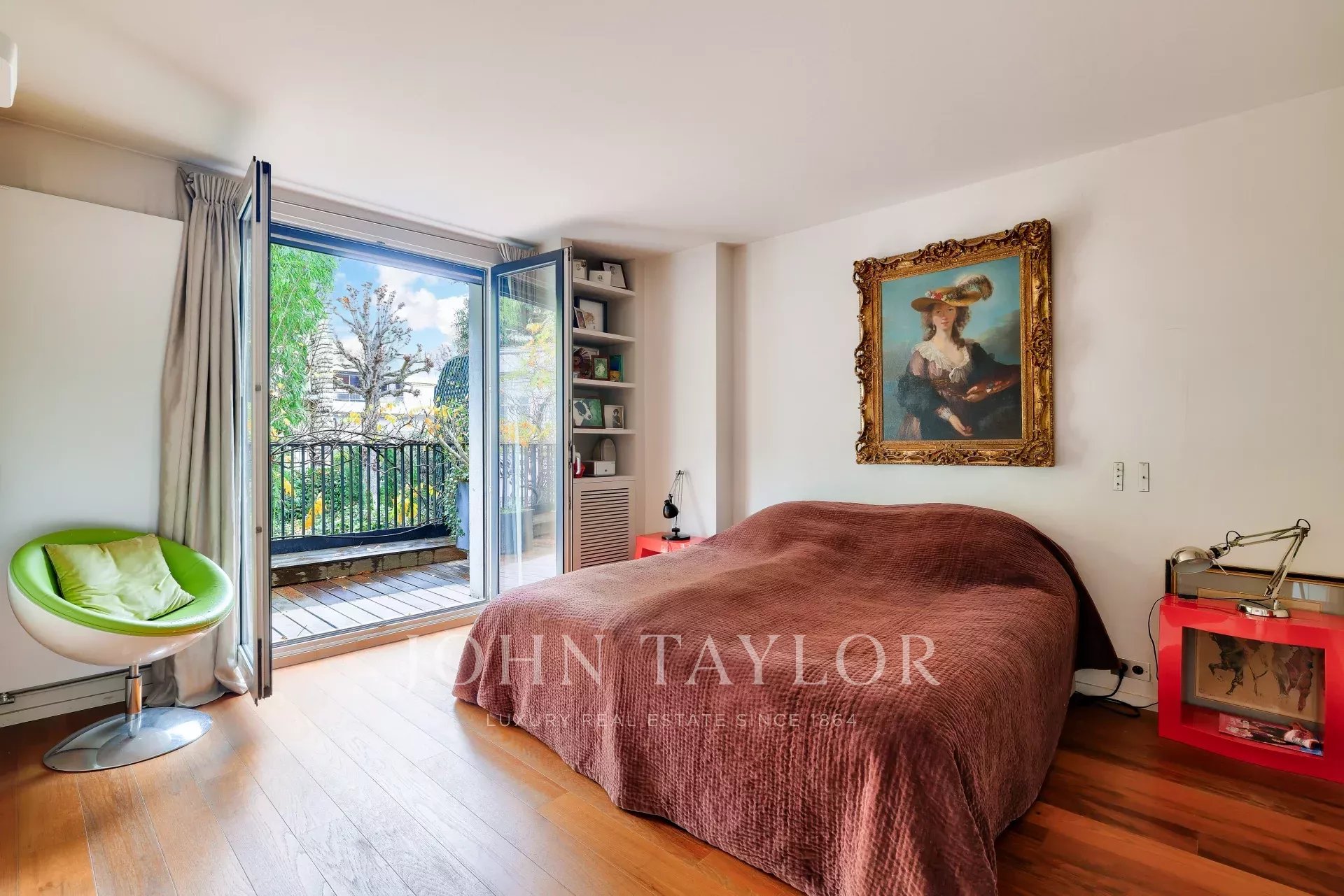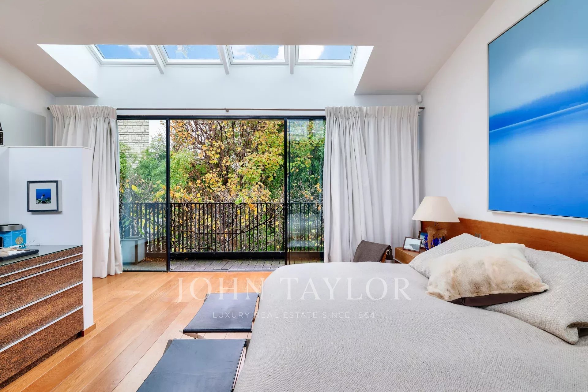 An impressive Master suite with over 5 m ceiling height, balcony overlooking the garden