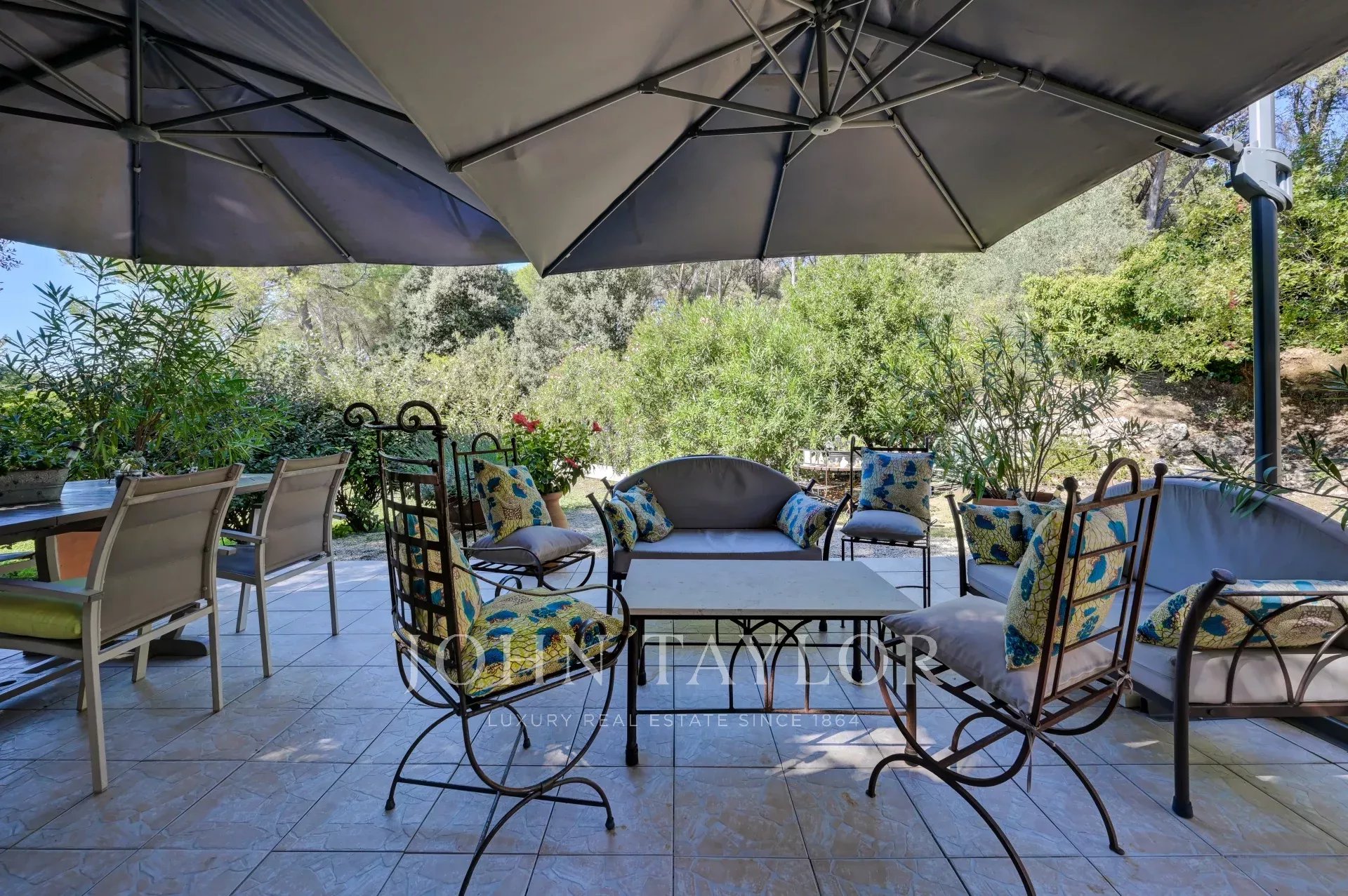 The main house offers spacious rooms with a bright living room opening onto a south-facing terrace, a fully equipped kitchen with laundry and pantry, an office, and a ground-floor suite. Upstairs, a master suite with dressing room and two additional bedrooms complete the sleeping area.