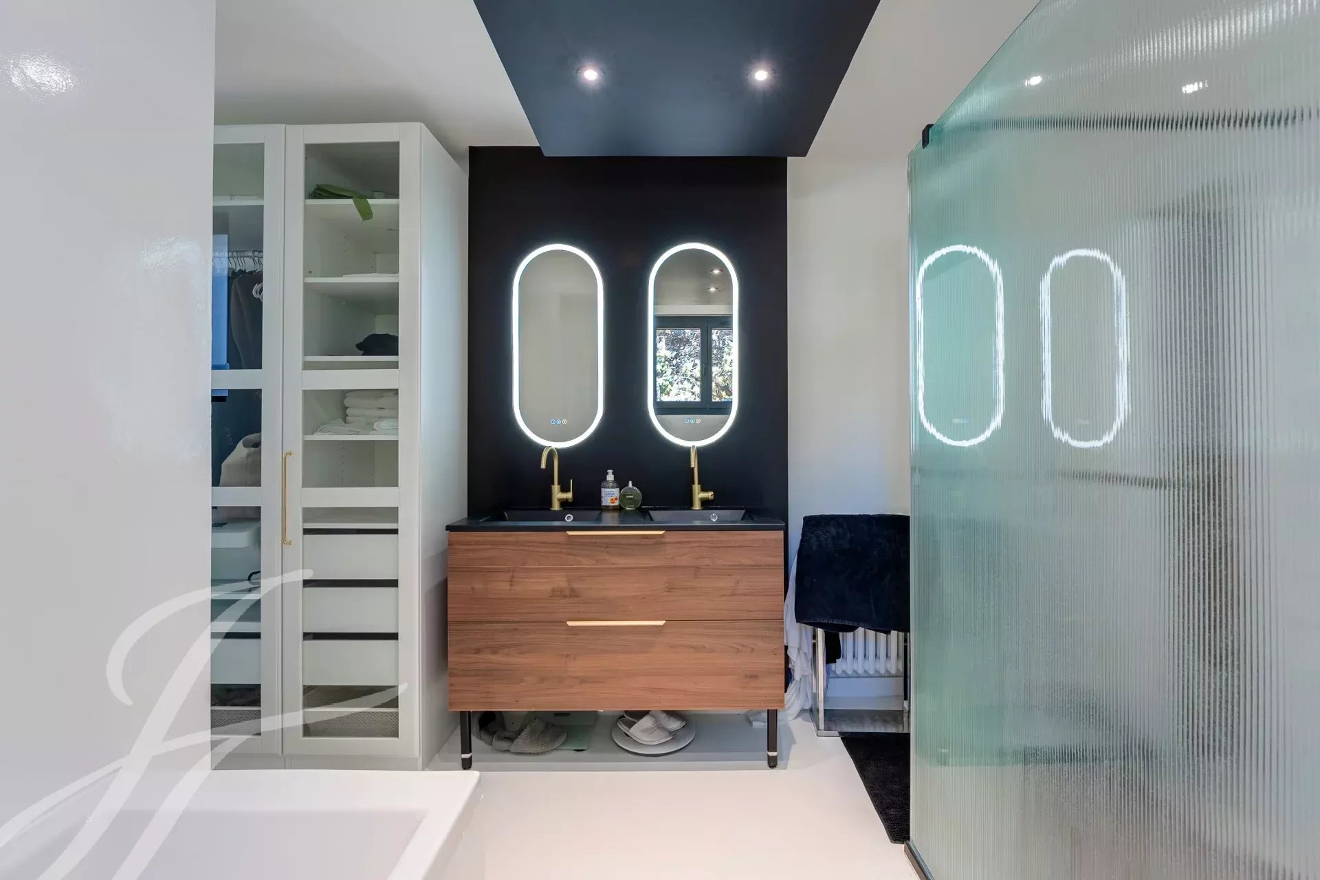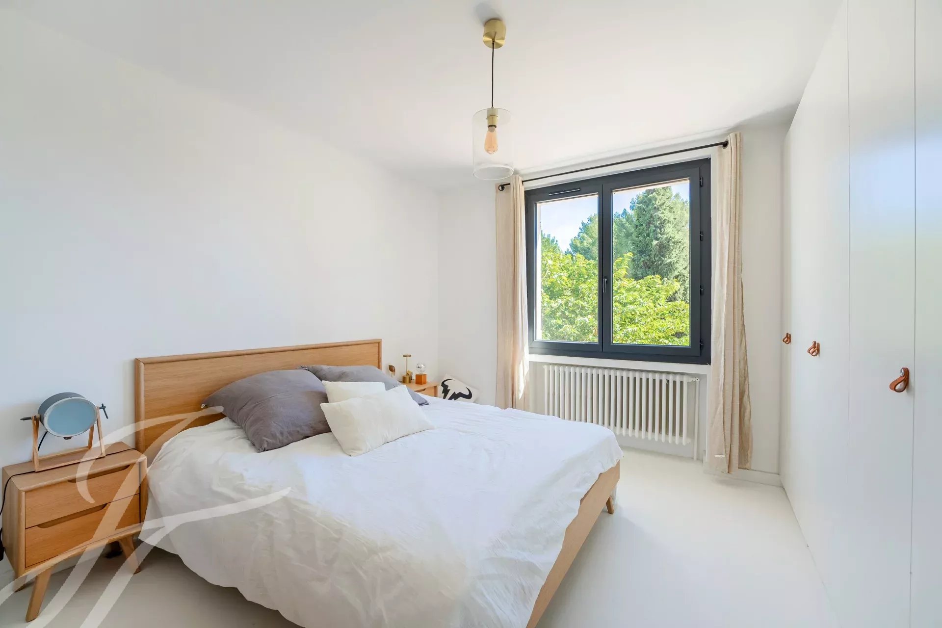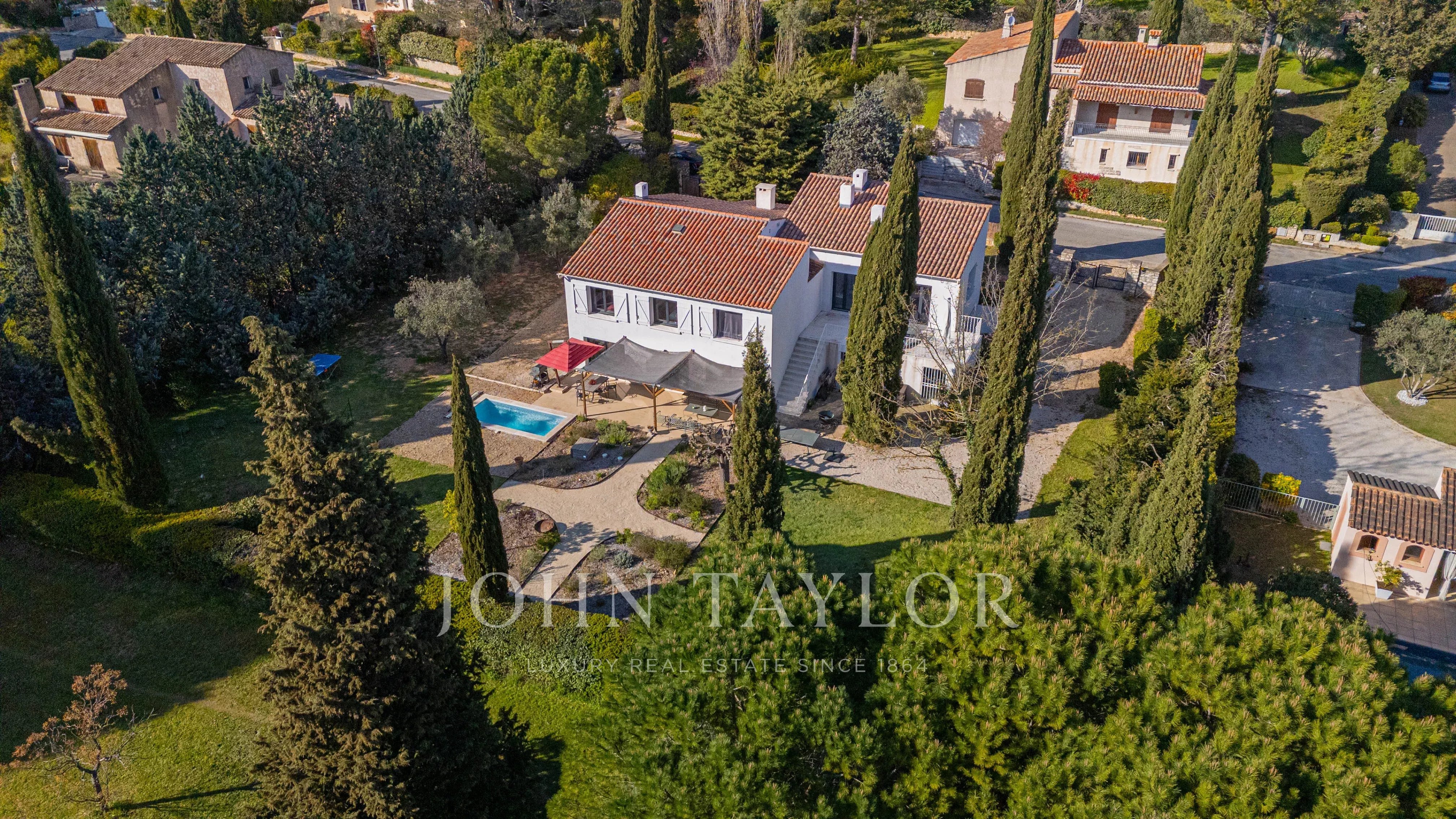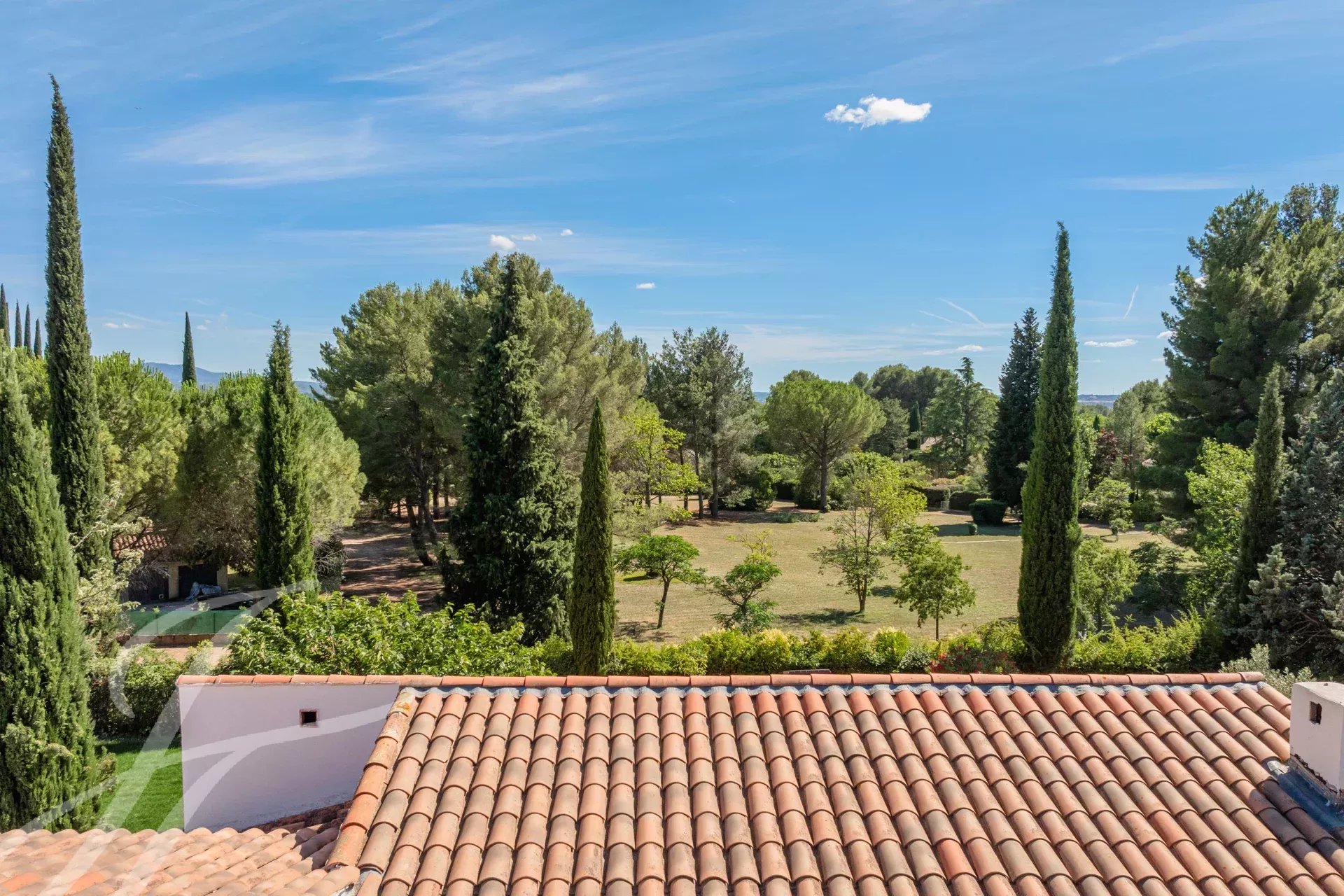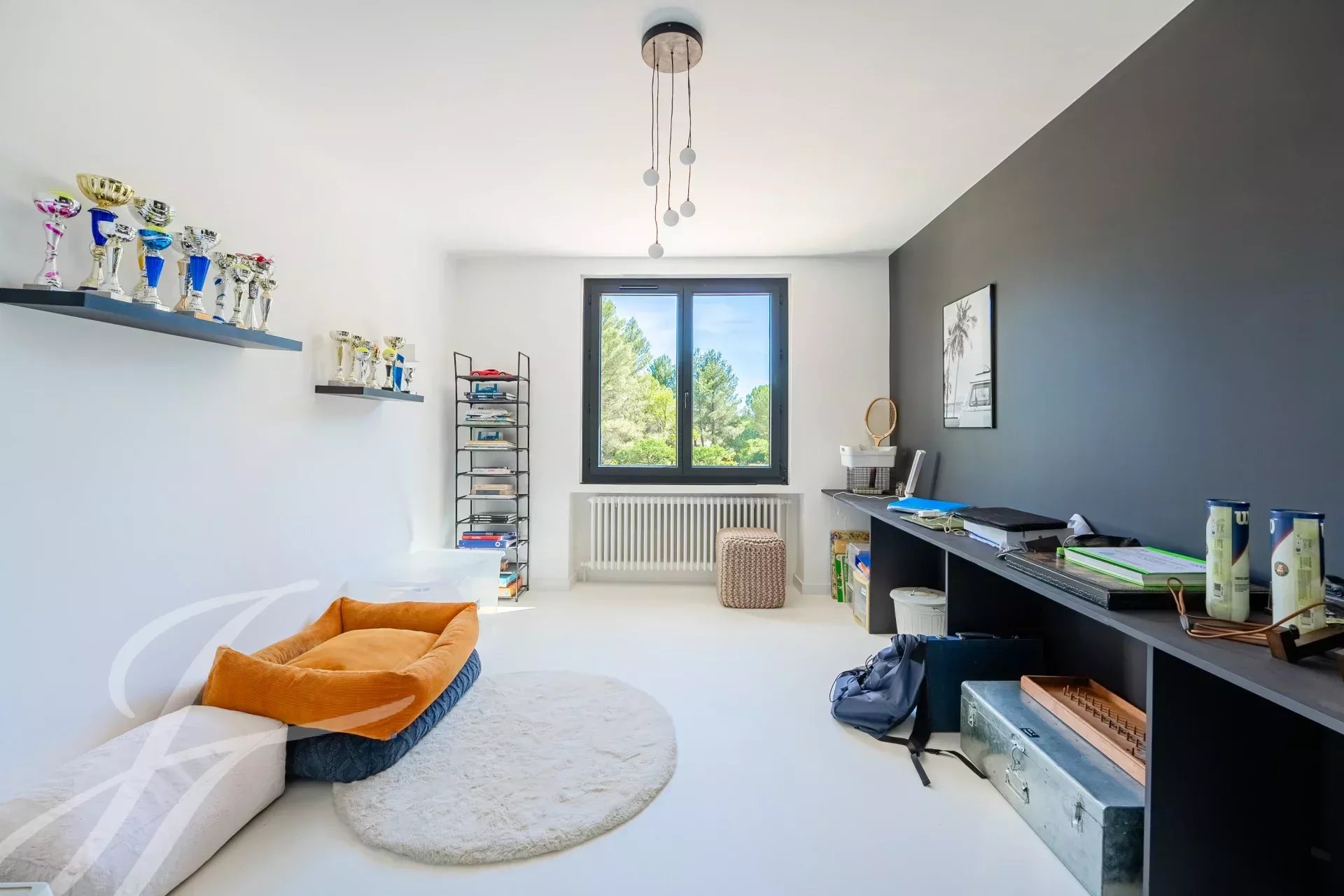 Discover this exquisite 254 m² house nestled in a tranquil setting just minutes from the heart of Aix-en-Provence. Offering five spacious bedrooms and eight versatile rooms, this home blends contemporary comfort with Provencal charm. The expansive living area is highlighted by a beautiful fireplace, double glazing, sliding windows, and air-conditioning, creating an inviting atmosphere year-round.