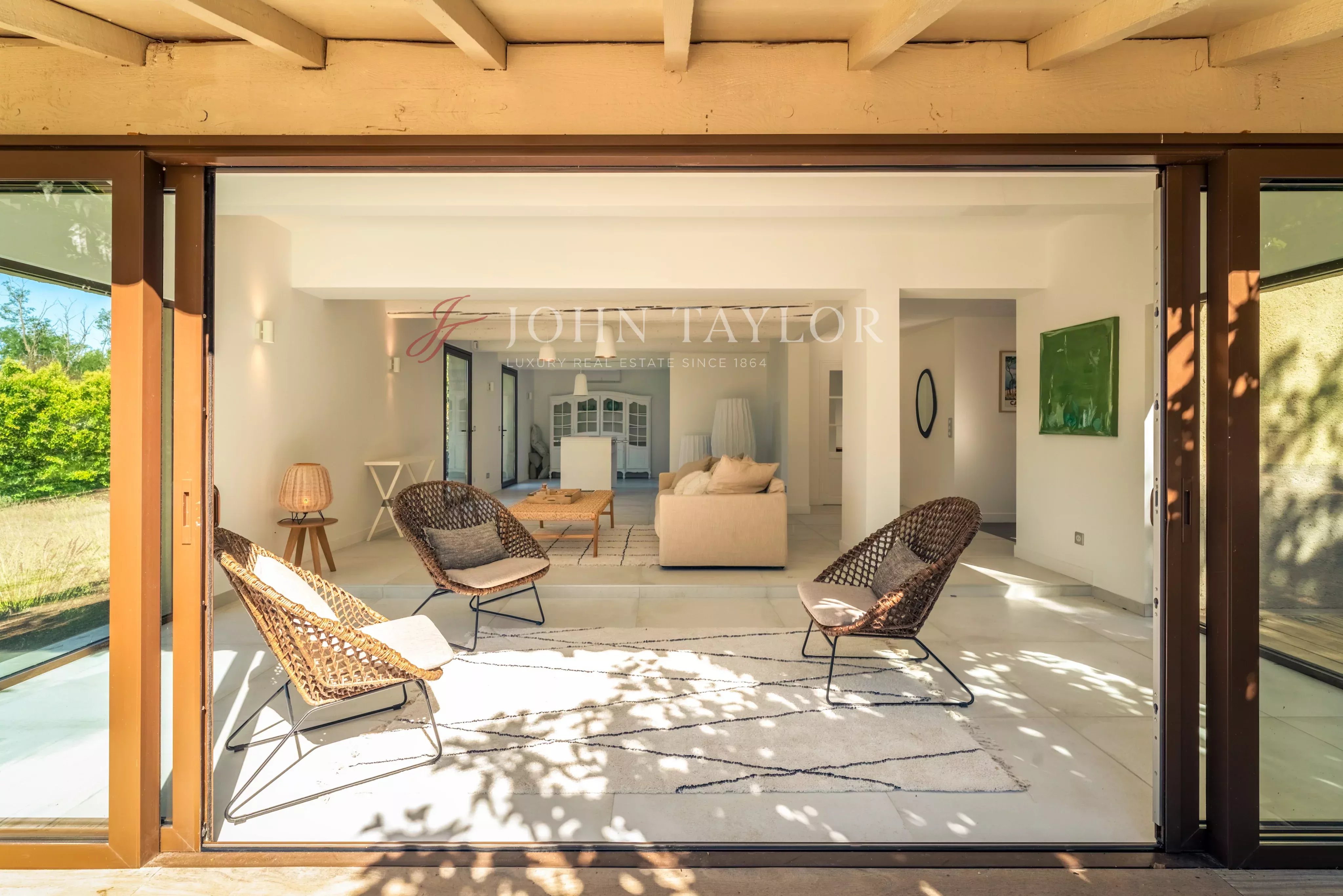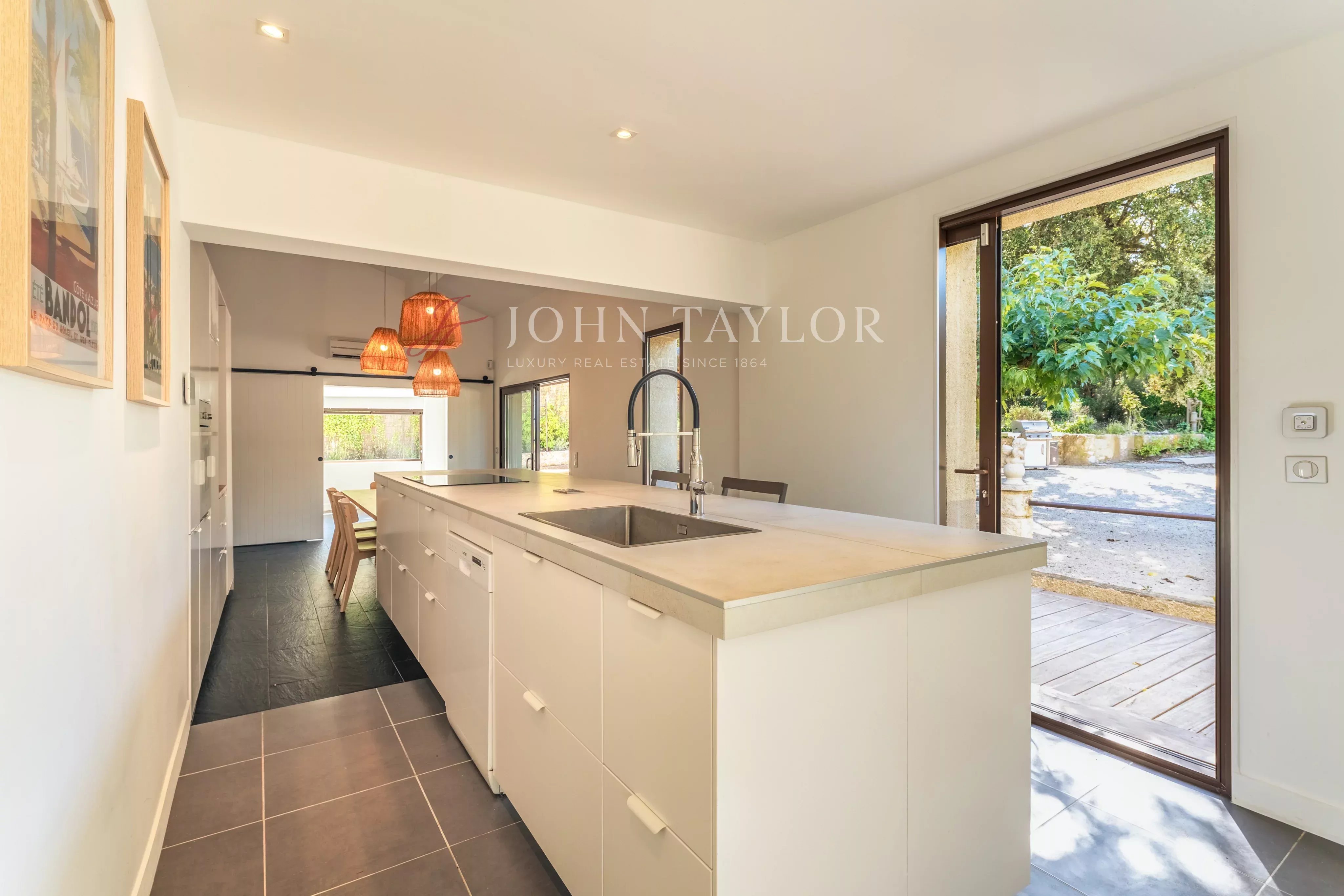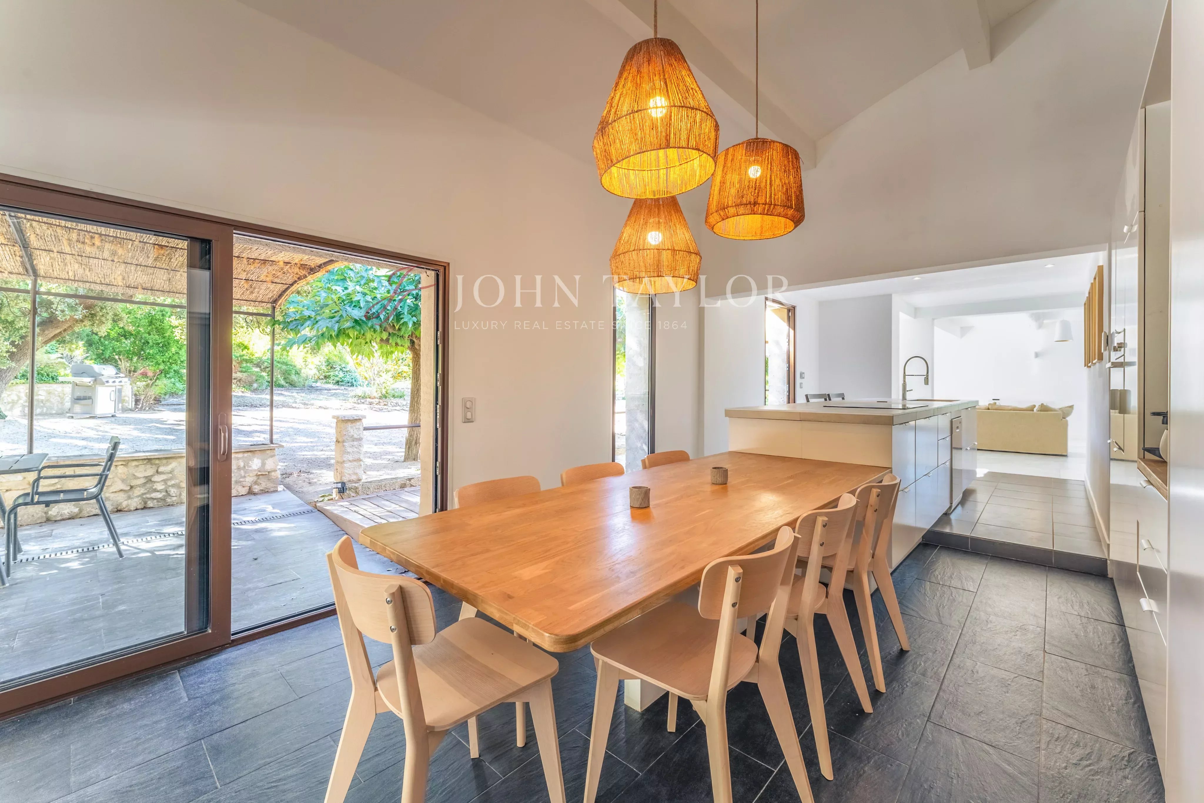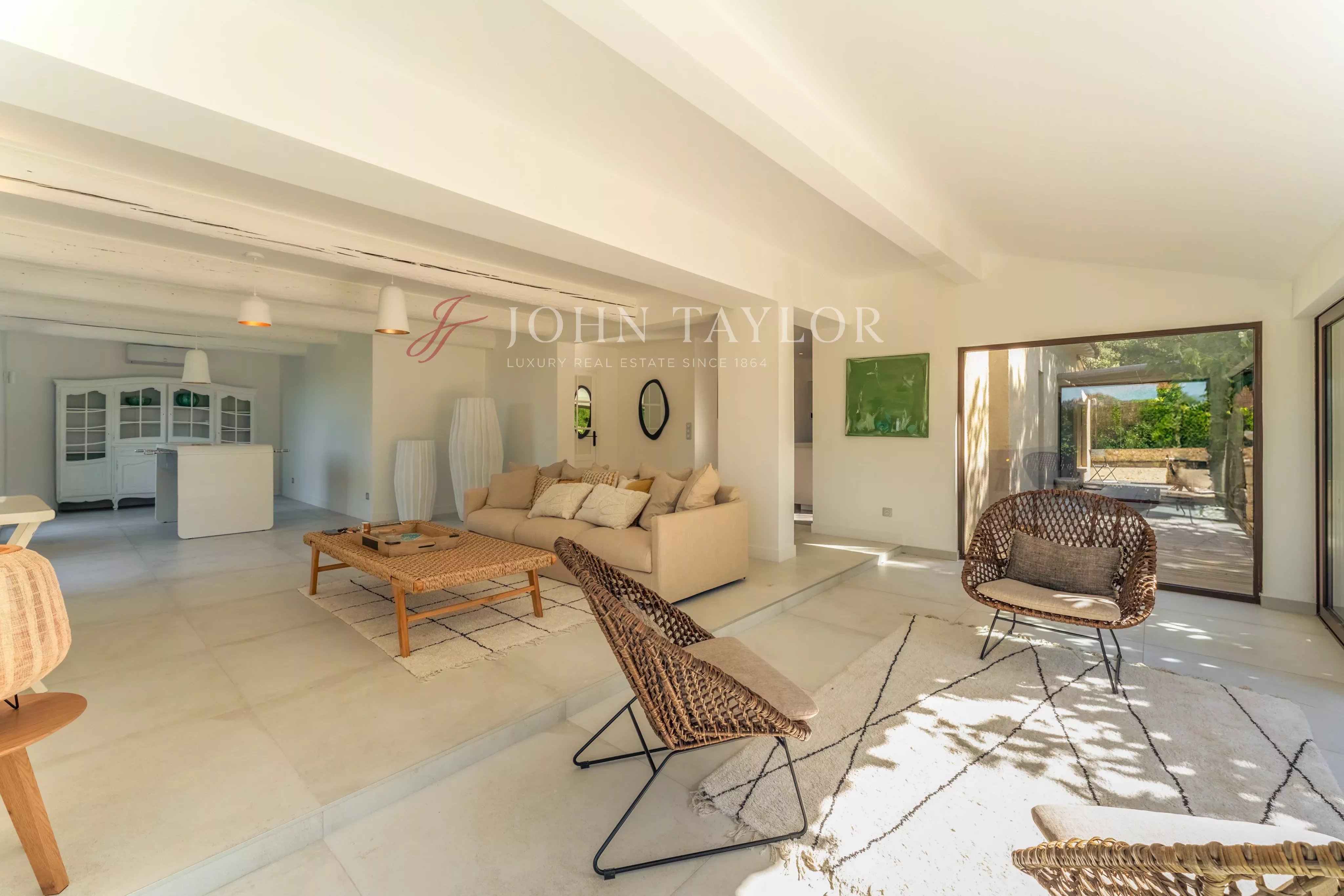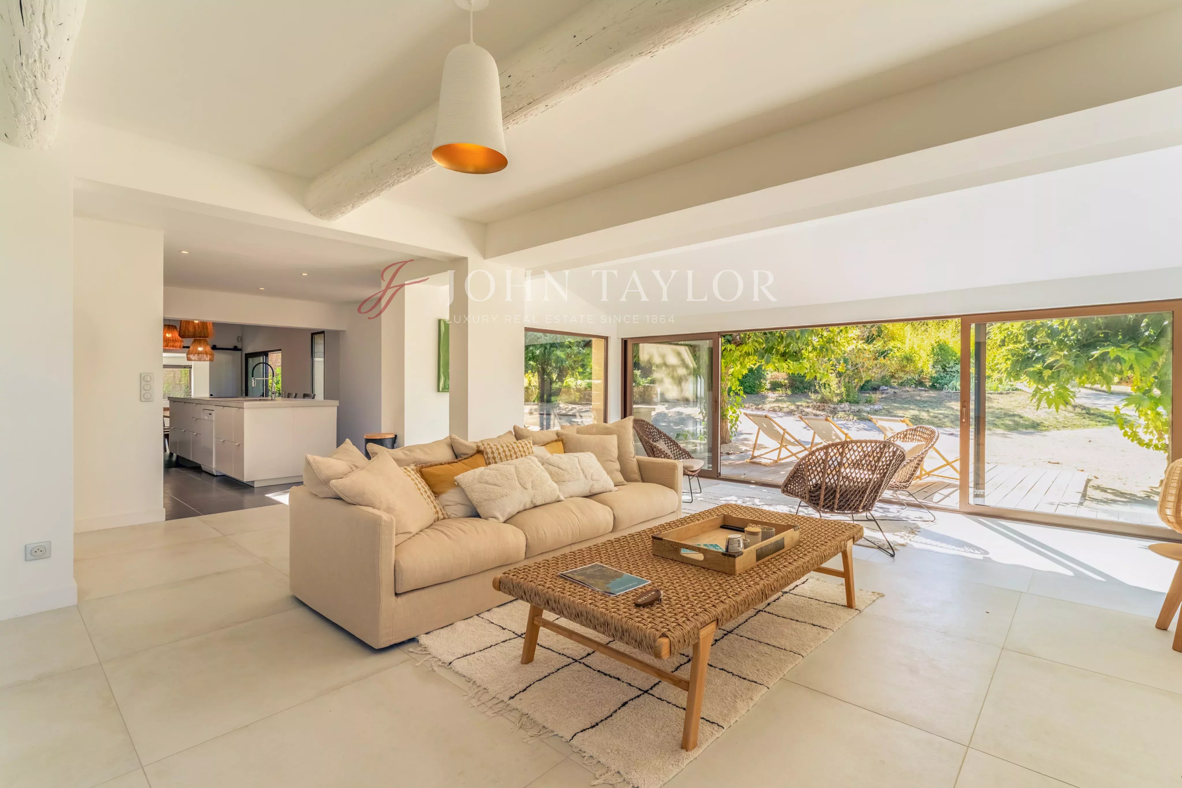This mainly single-storey house opens onto a spacious double living room, punctuated by large bay windows that open onto a shaded terrace, where every moment becomes an invitation to contemplation. A bright and functional fitted open-plan kitchen completes this harmonious living space.