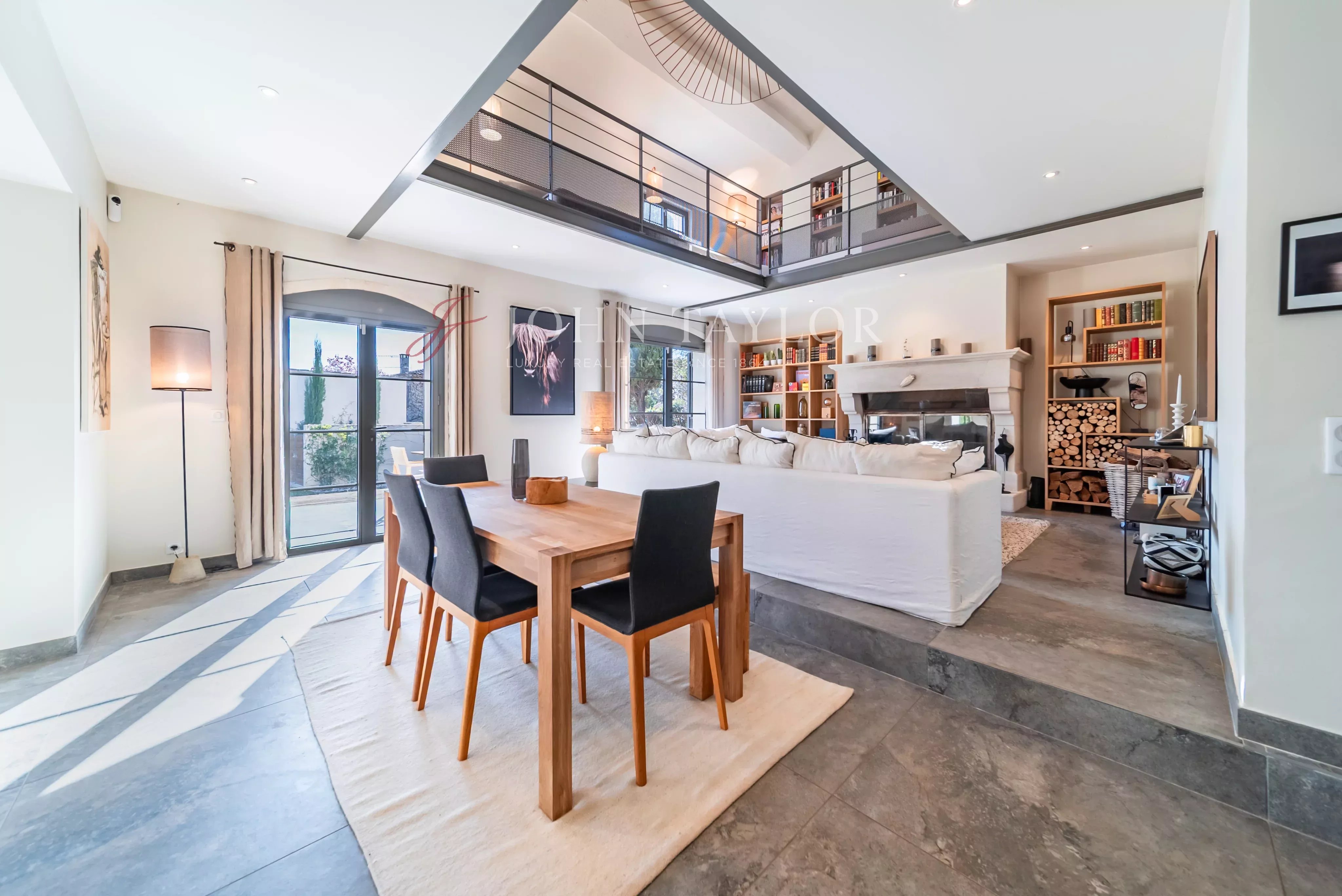 The living areas are particularly appealing thanks to their generous volumes and natural light, including a large cathedral-style living room with a stone fireplace, a TV lounge, and a fully equipped high-end kitchen open to the dining area. Additional amenities include a wine cellar, a gym, a laundry room and a garage.