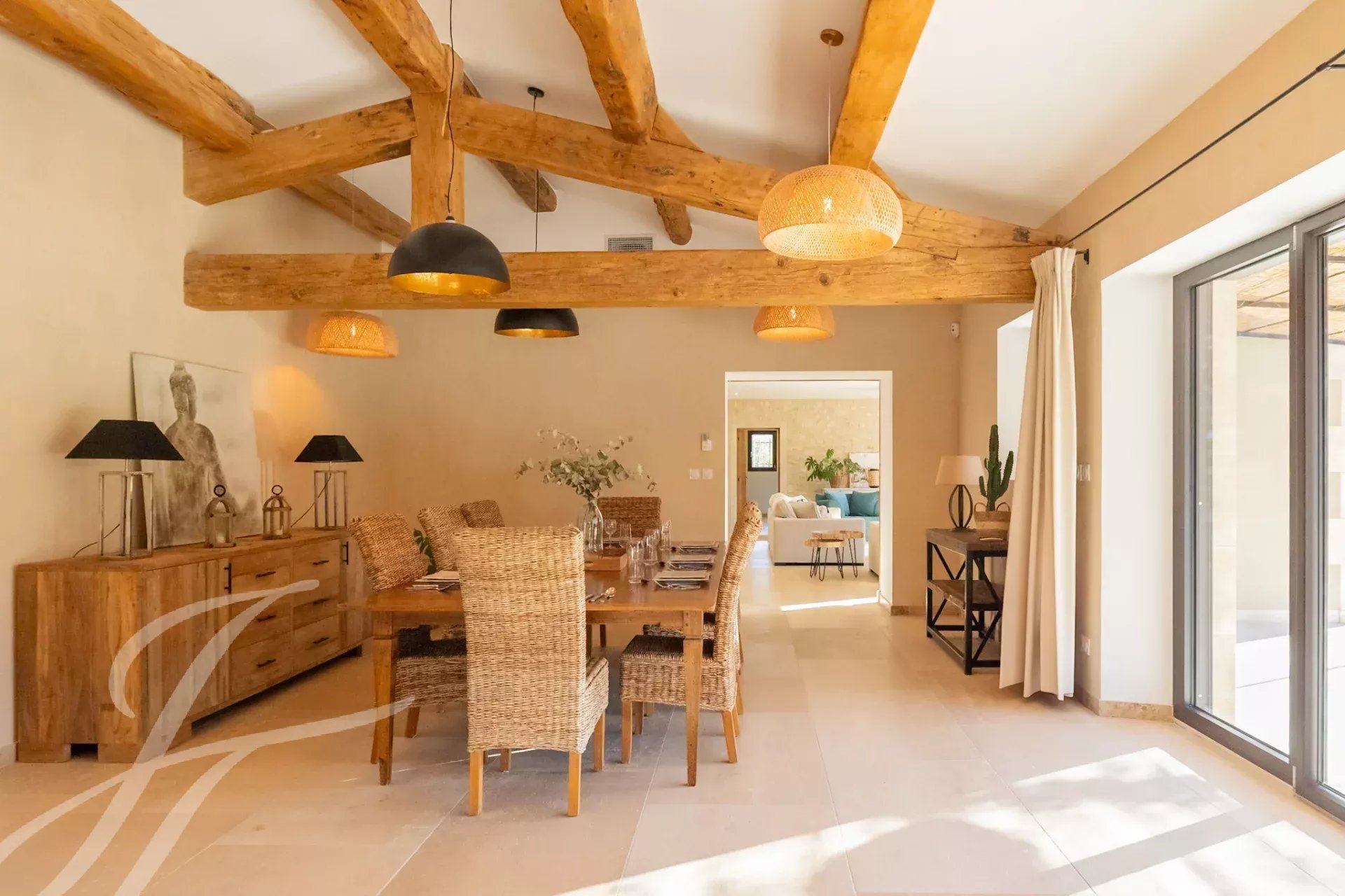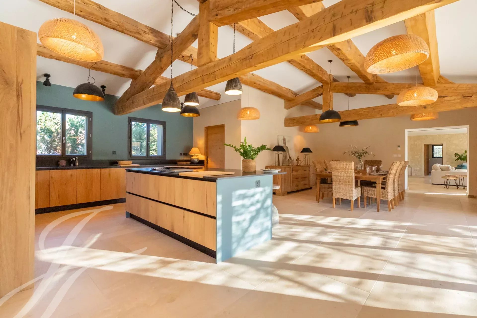 Built with the expertise of local craftsmen, this family home boasts over 308 m² of living space and 420 m² of buildings. Every space has been designed to combine comfort and character: a spacious kitchen opening onto the dining room with its superb exposed beams, a vast living room bathed in light, and six bedrooms, including four suites.