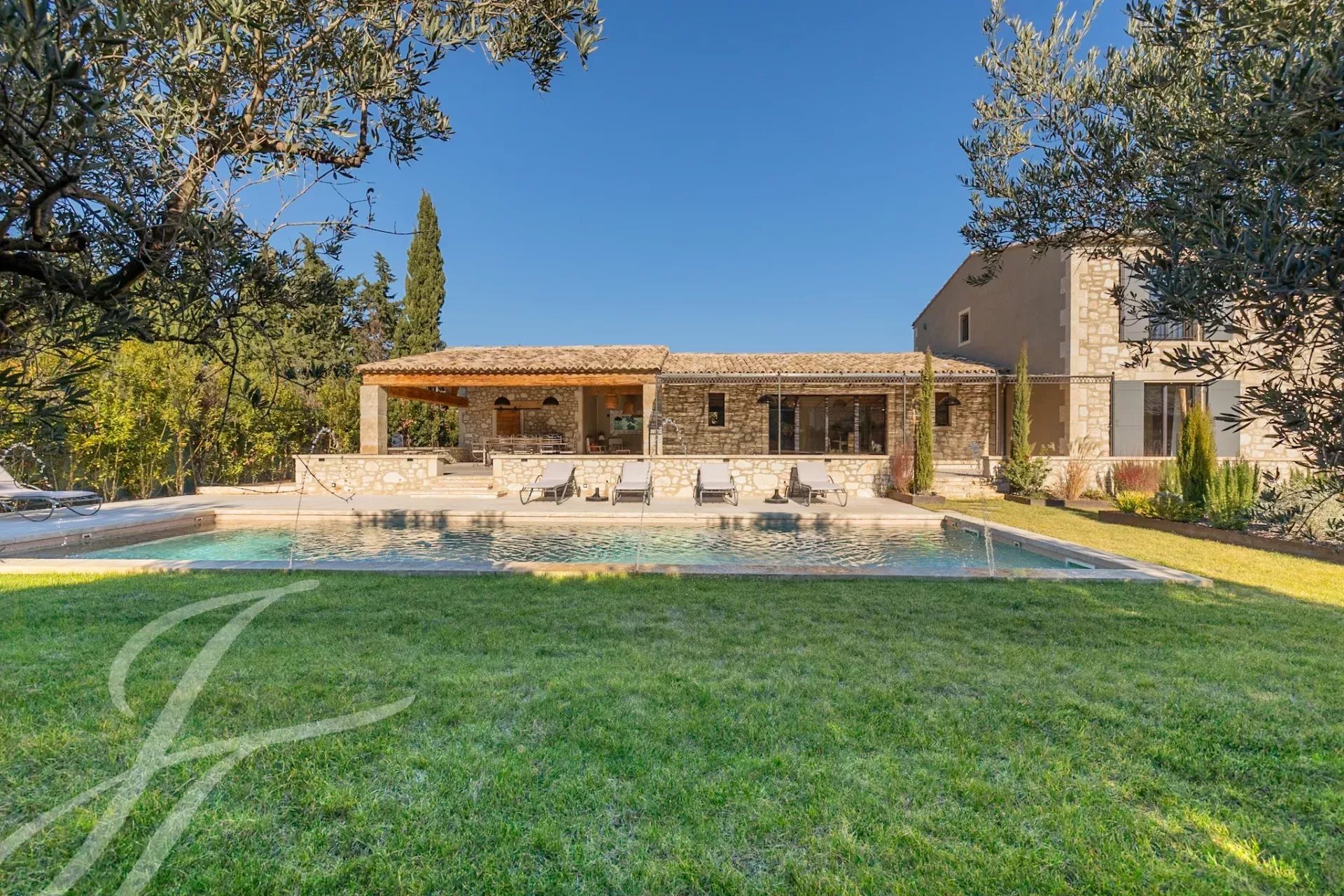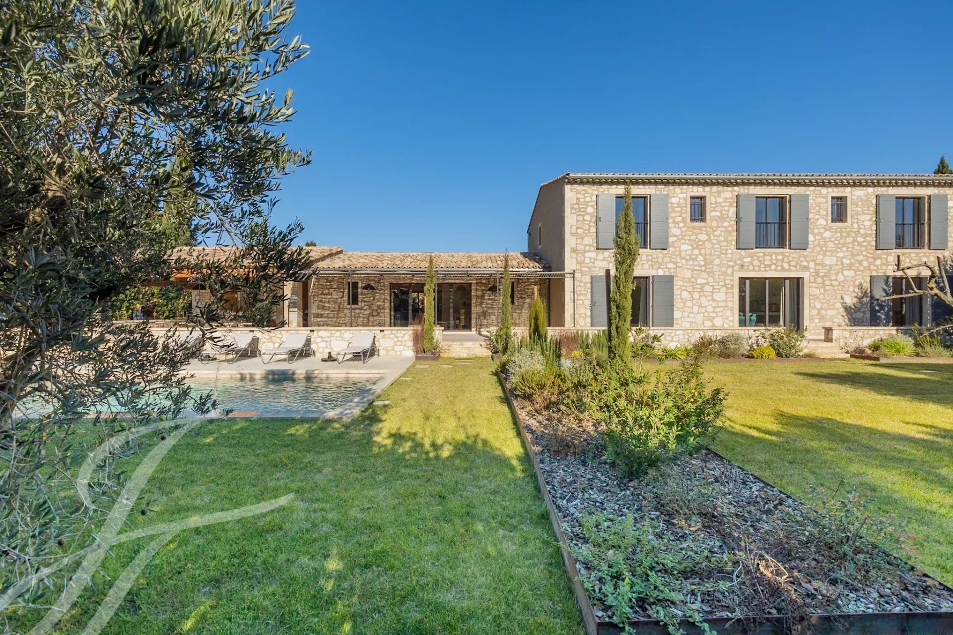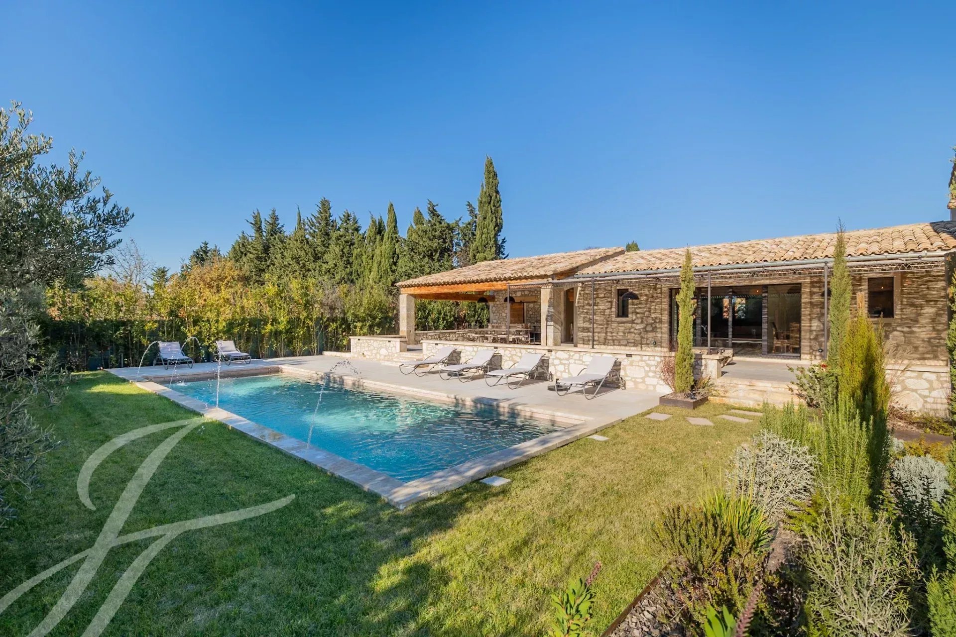 Nestled at the end of an unassuming lane, this authentic stone farmhouse captivates with its timeless charm and enchanting setting. Its carefully landscaped 1,700 m² garden offers a haven of greenery enhanced by a beautiful swimming pool surrounded by flower beds and an elegant lawn.