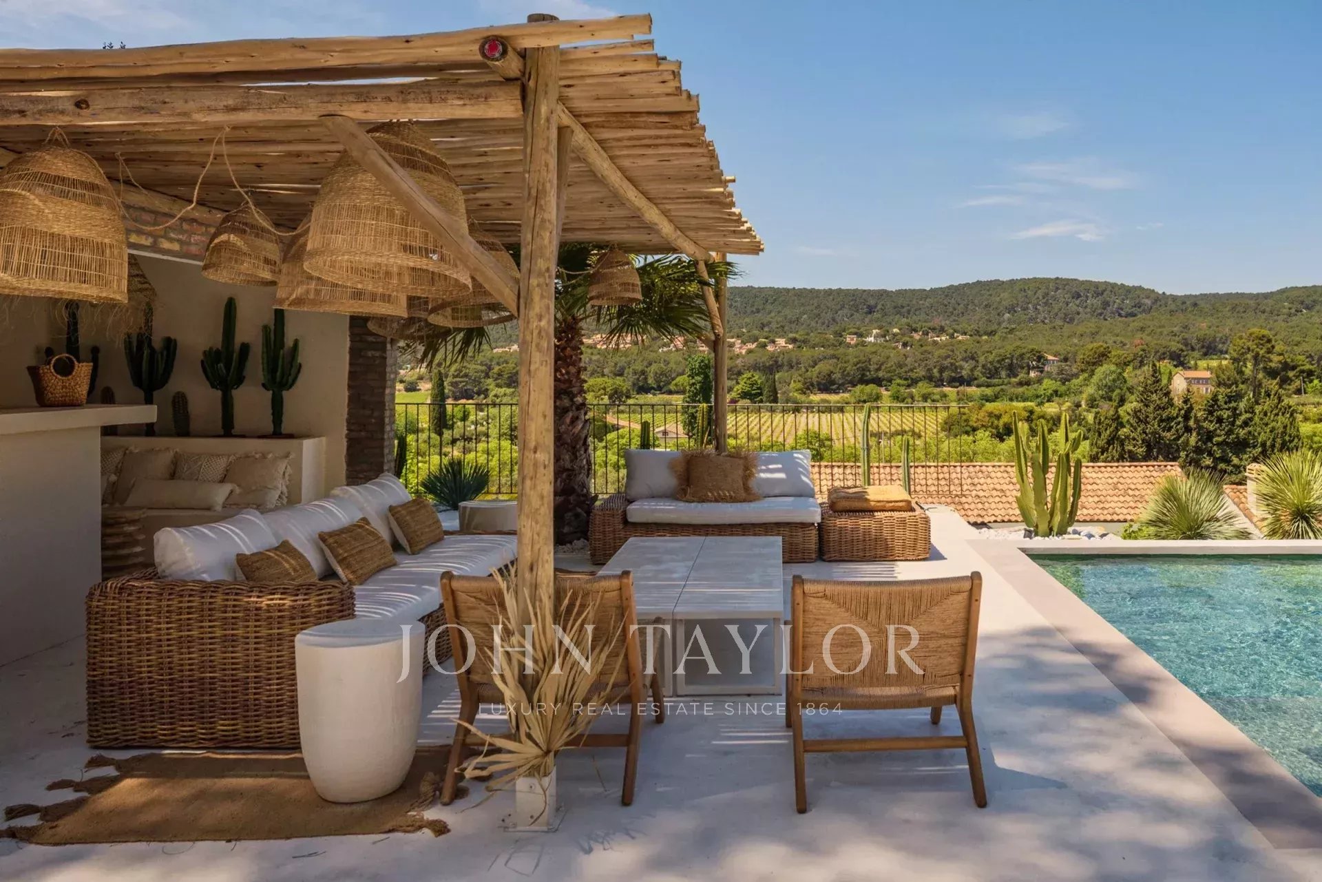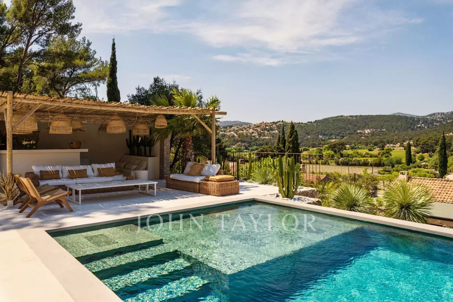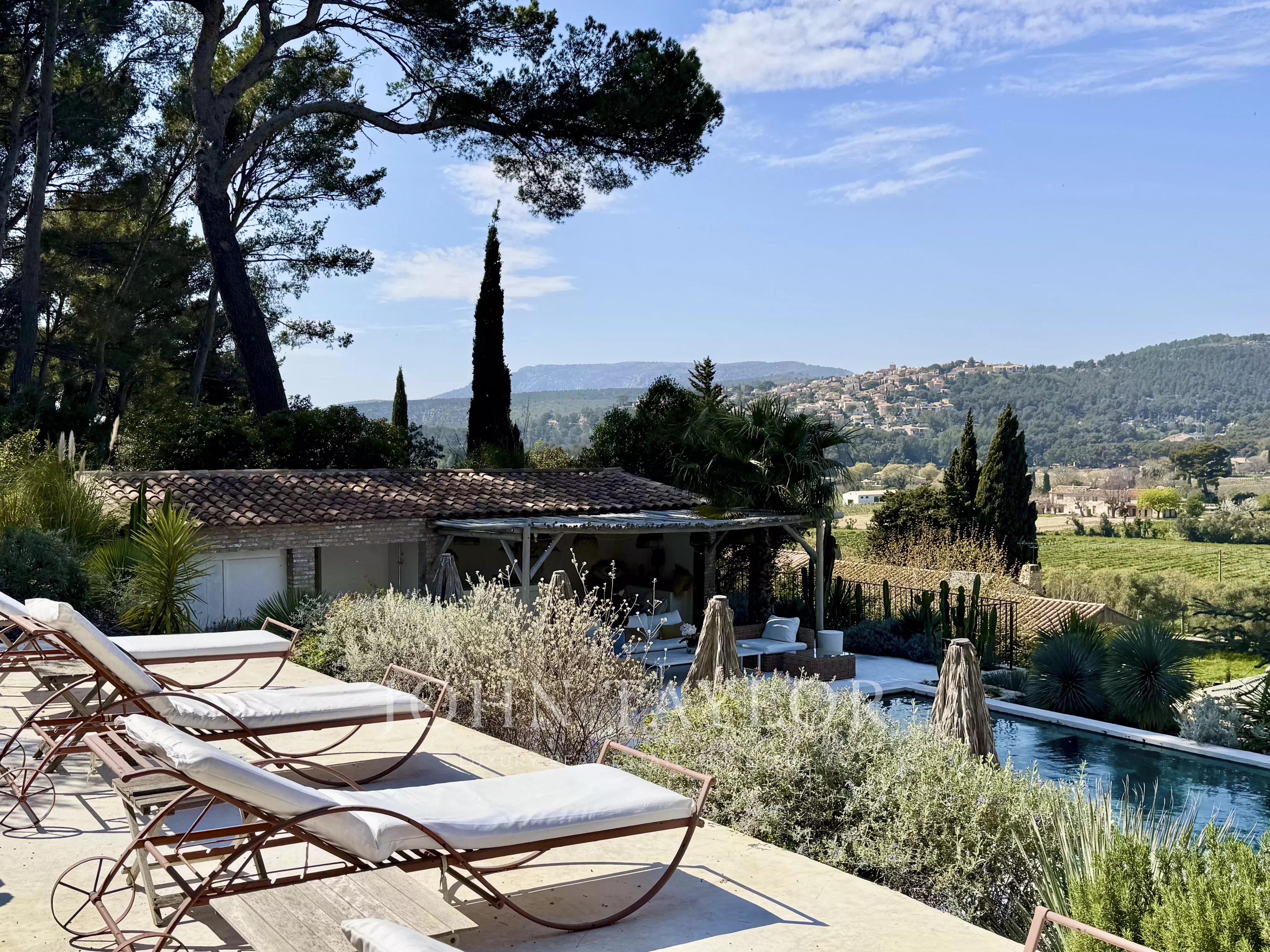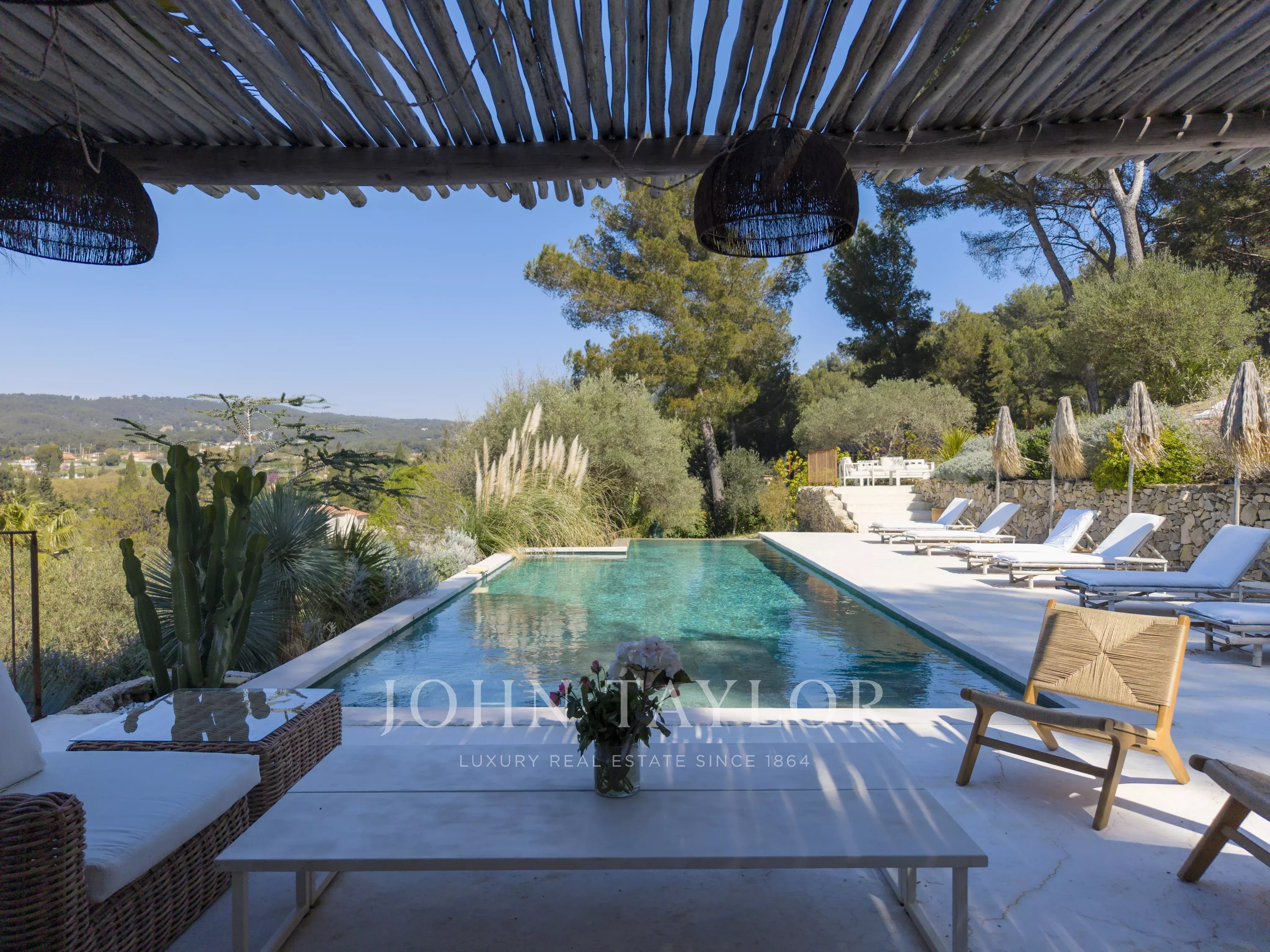 The pool area is in a commanding position, with a solarium and equipped pool house, offering an ideal setting for relaxation in peace and contemplation of sunsets and the ridge line.