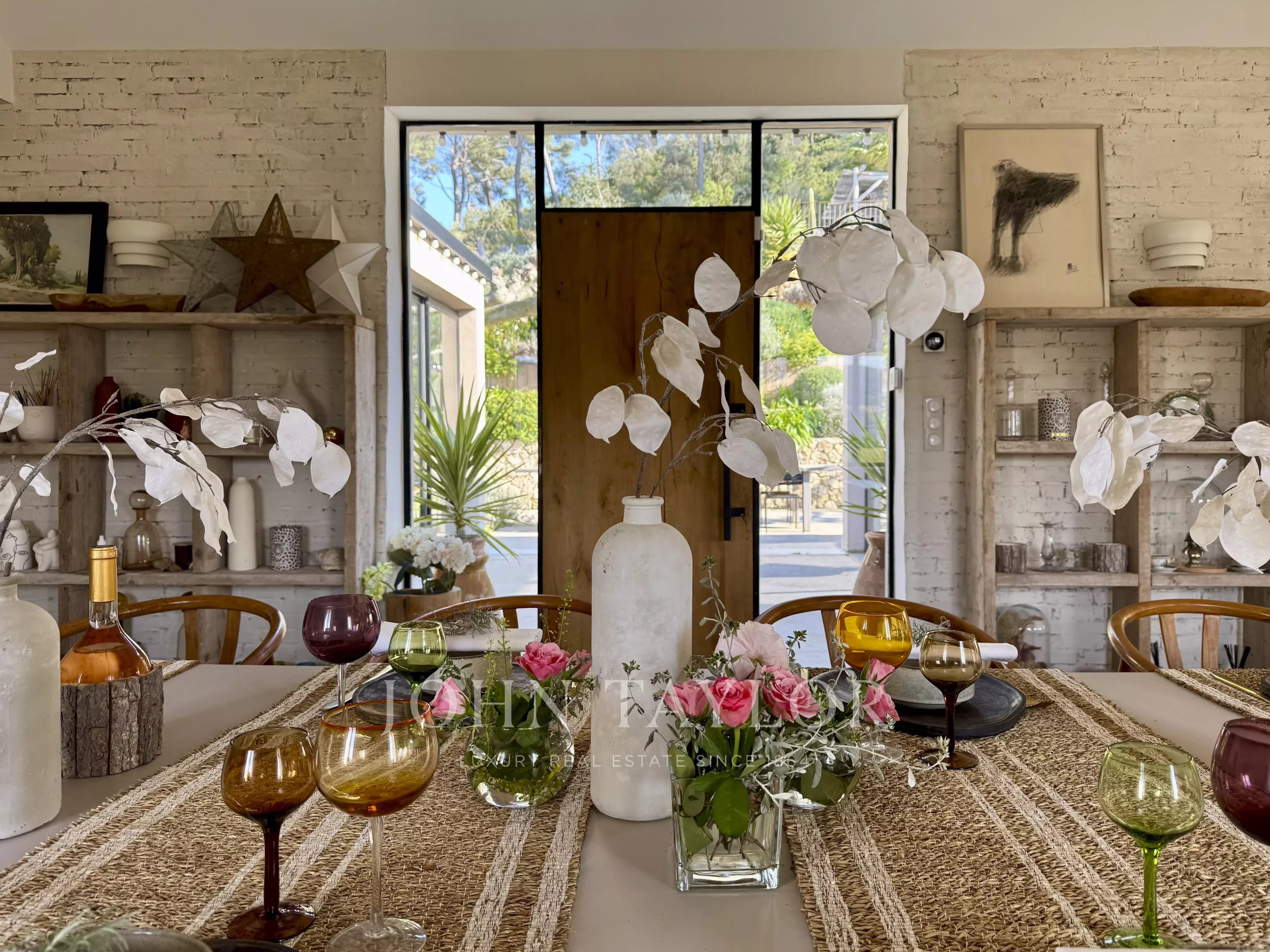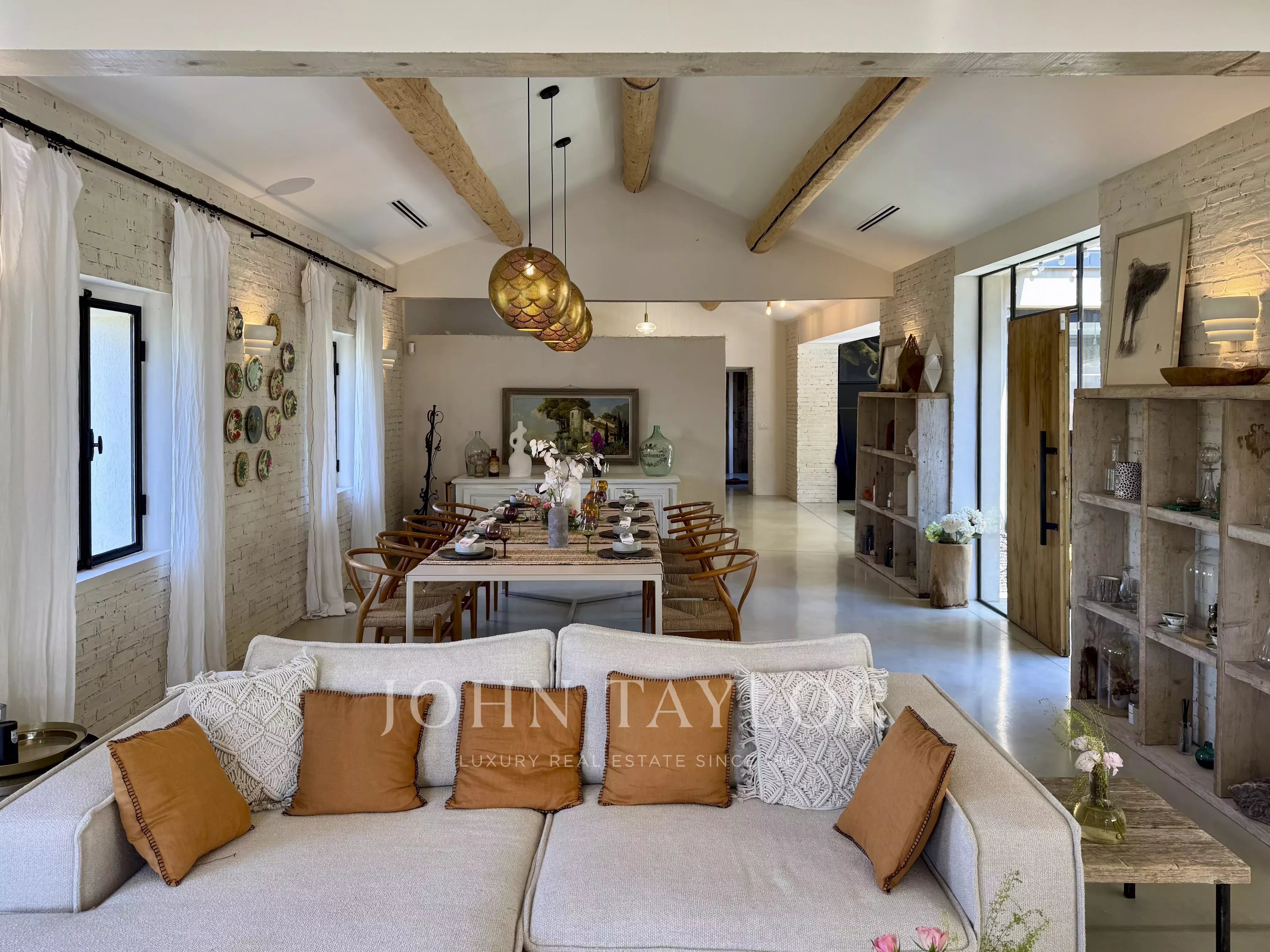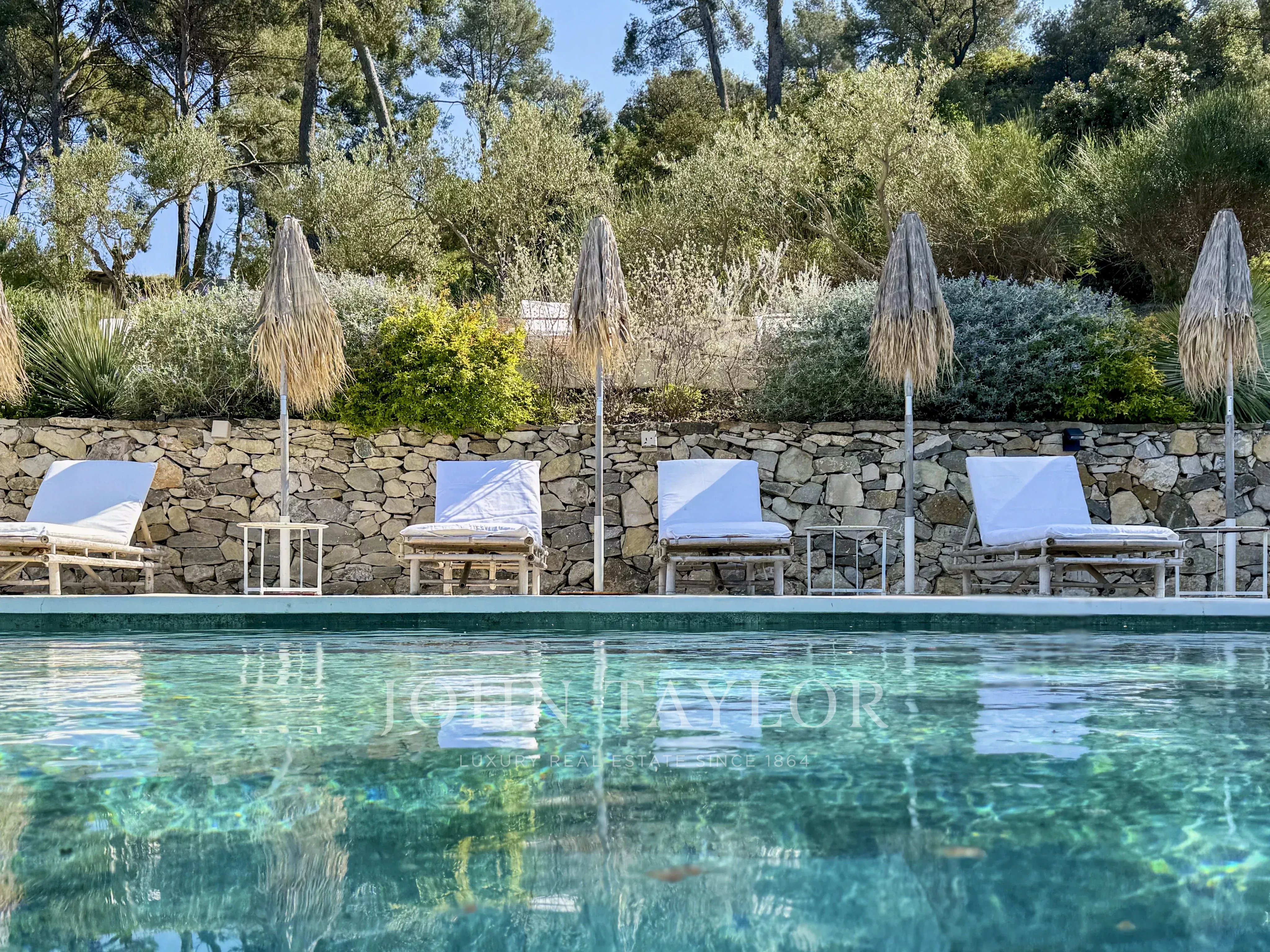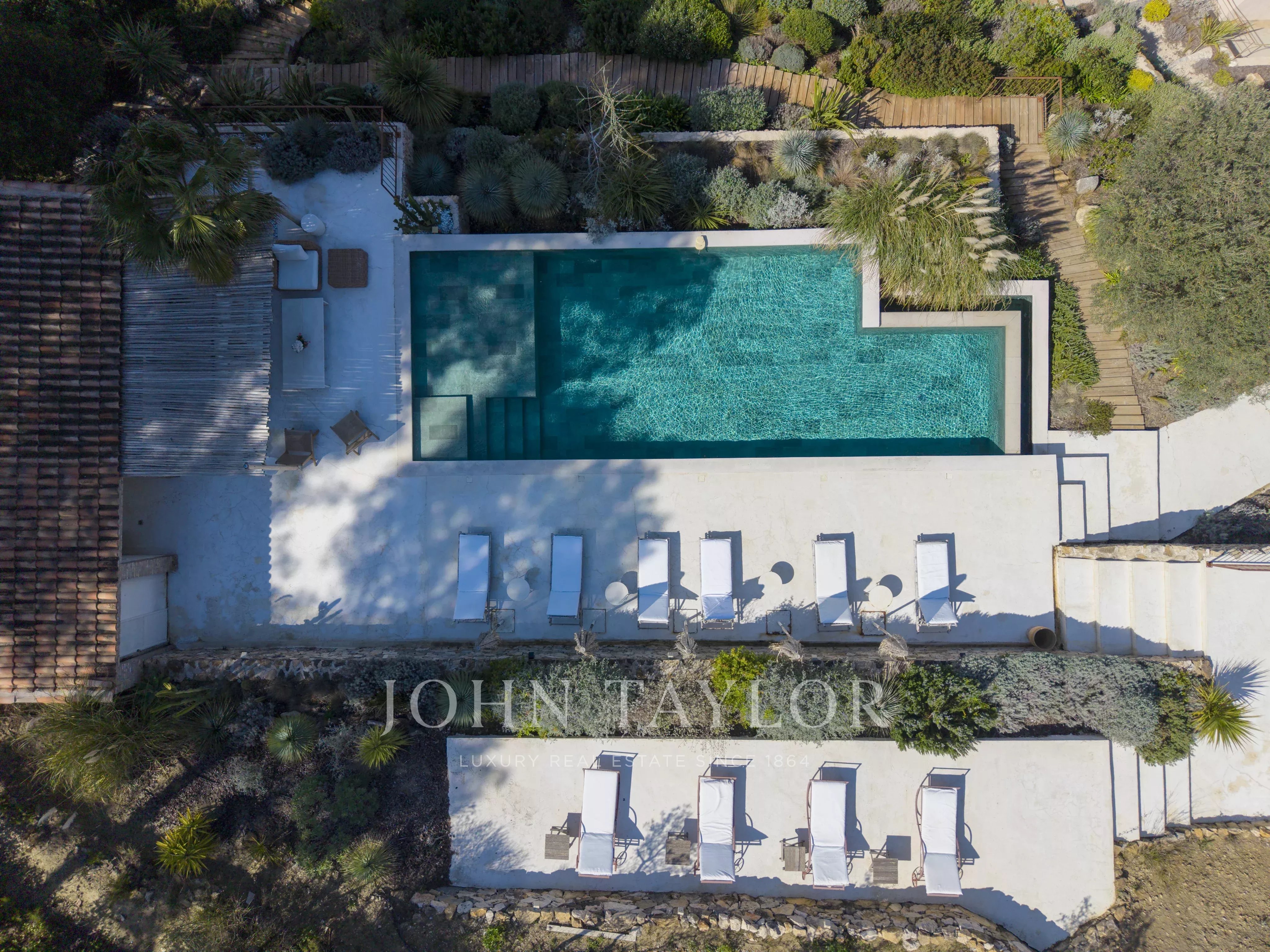 This Mediterranean villa offers an idyllic living environment between a lush garden inspired by the Corsican maquis filled with aromatic essences and ancient olive trees, and its elegant pool and leisure area enjoying magnificent sunsets all year round.