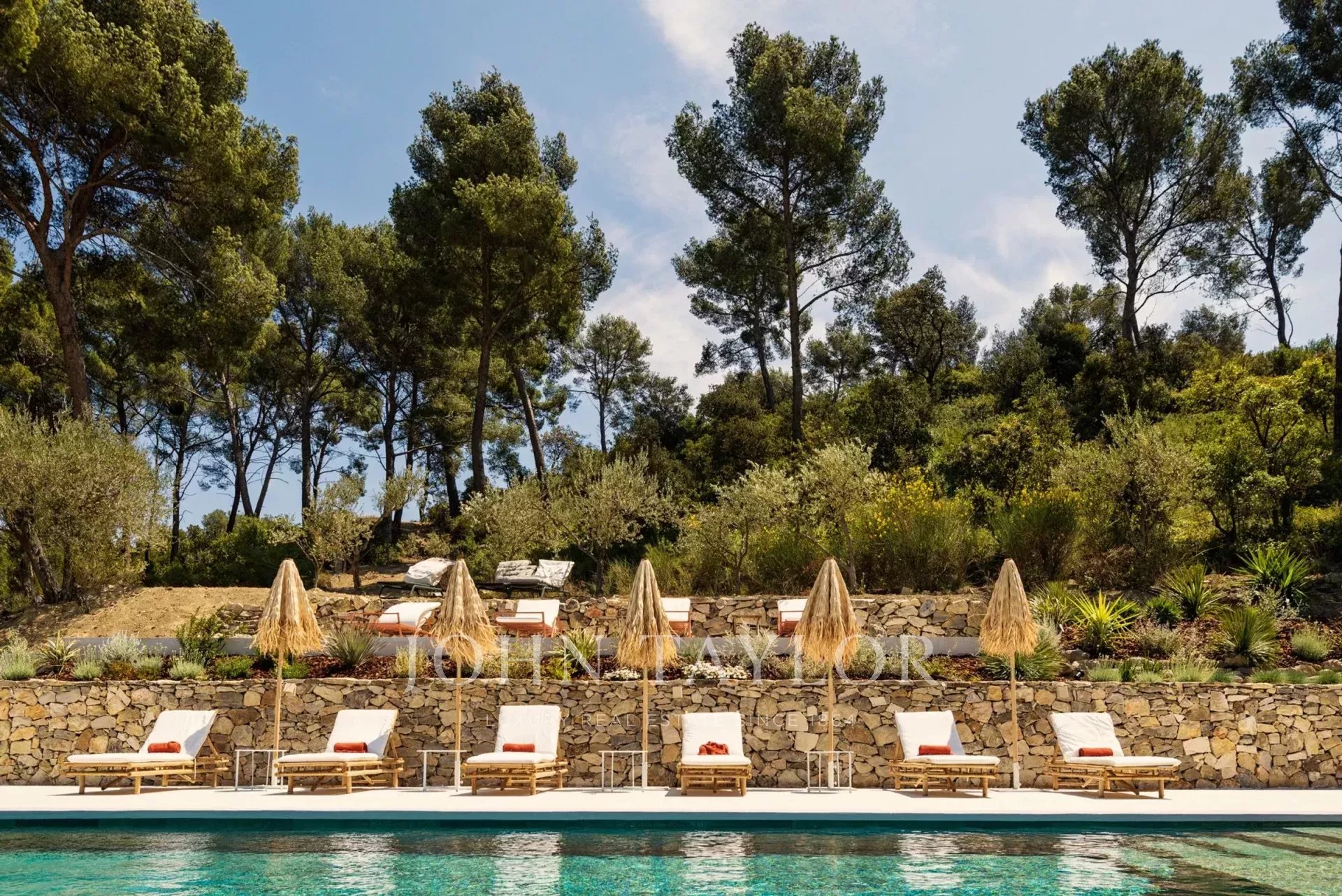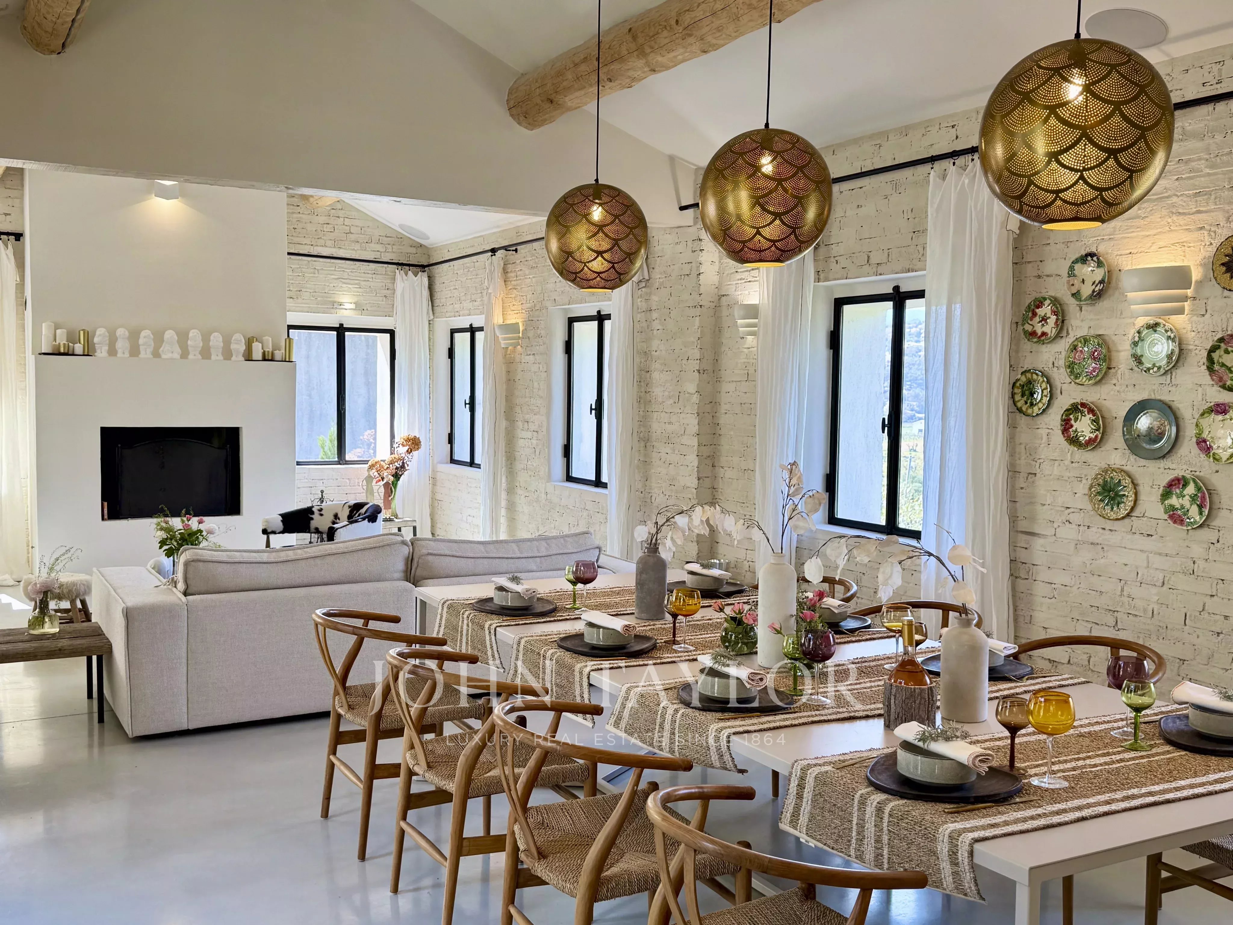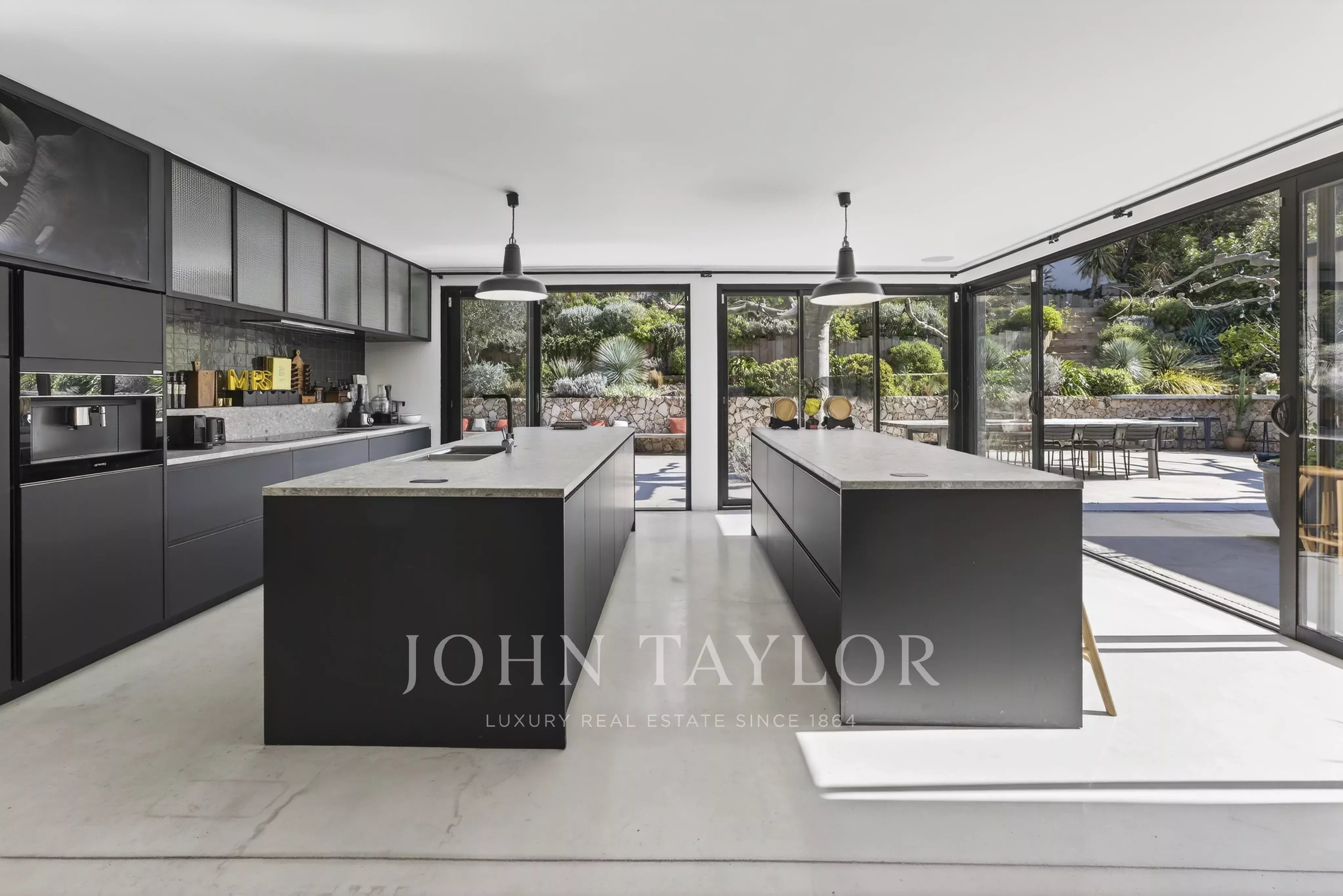 This Mediterranean villa offers an idyllic living environment between a lush garden inspired by the Corsican maquis filled with aromatic essences and ancient olive trees, and its elegant pool and leisure area enjoying magnificent sunsets all year round.