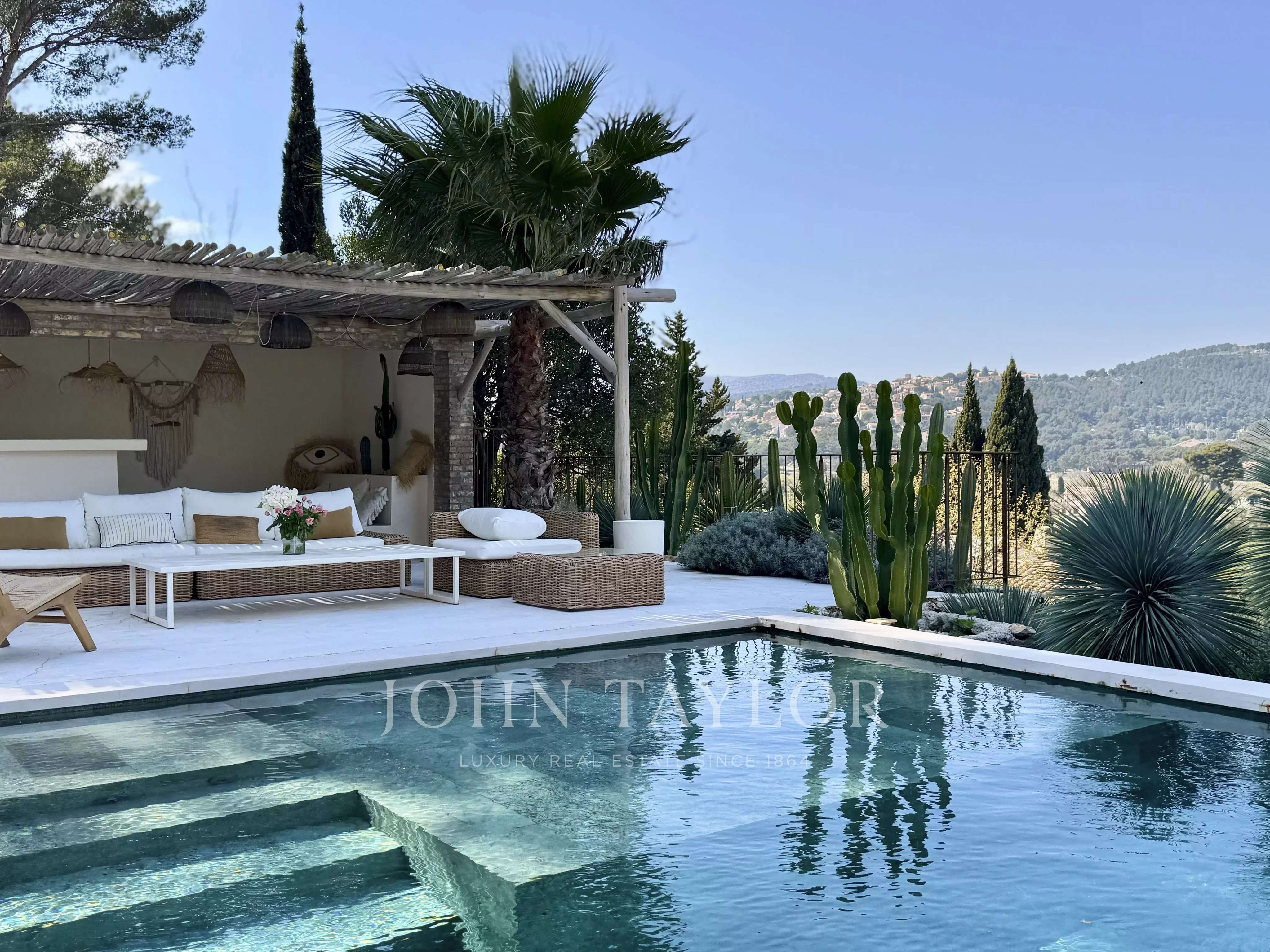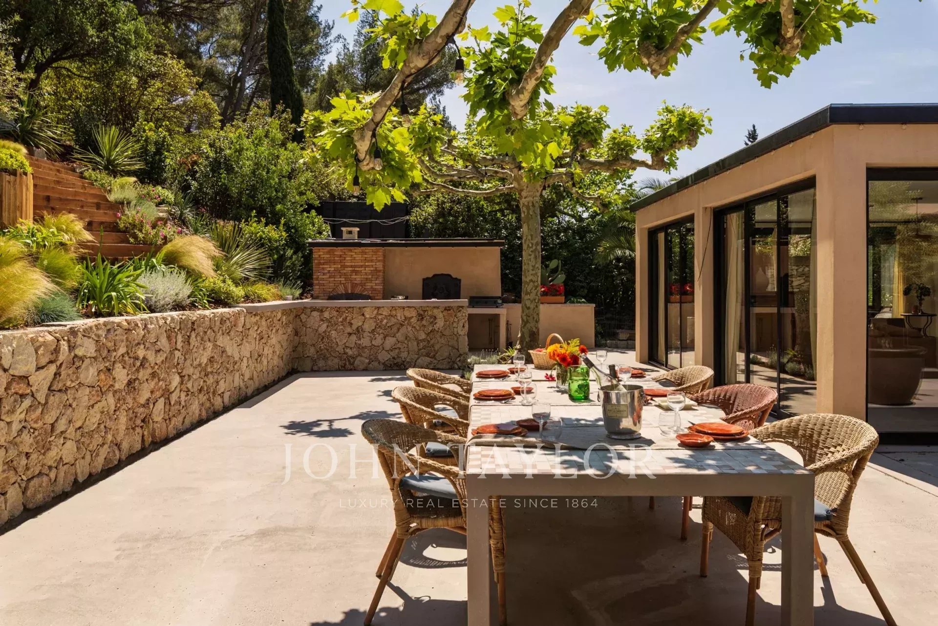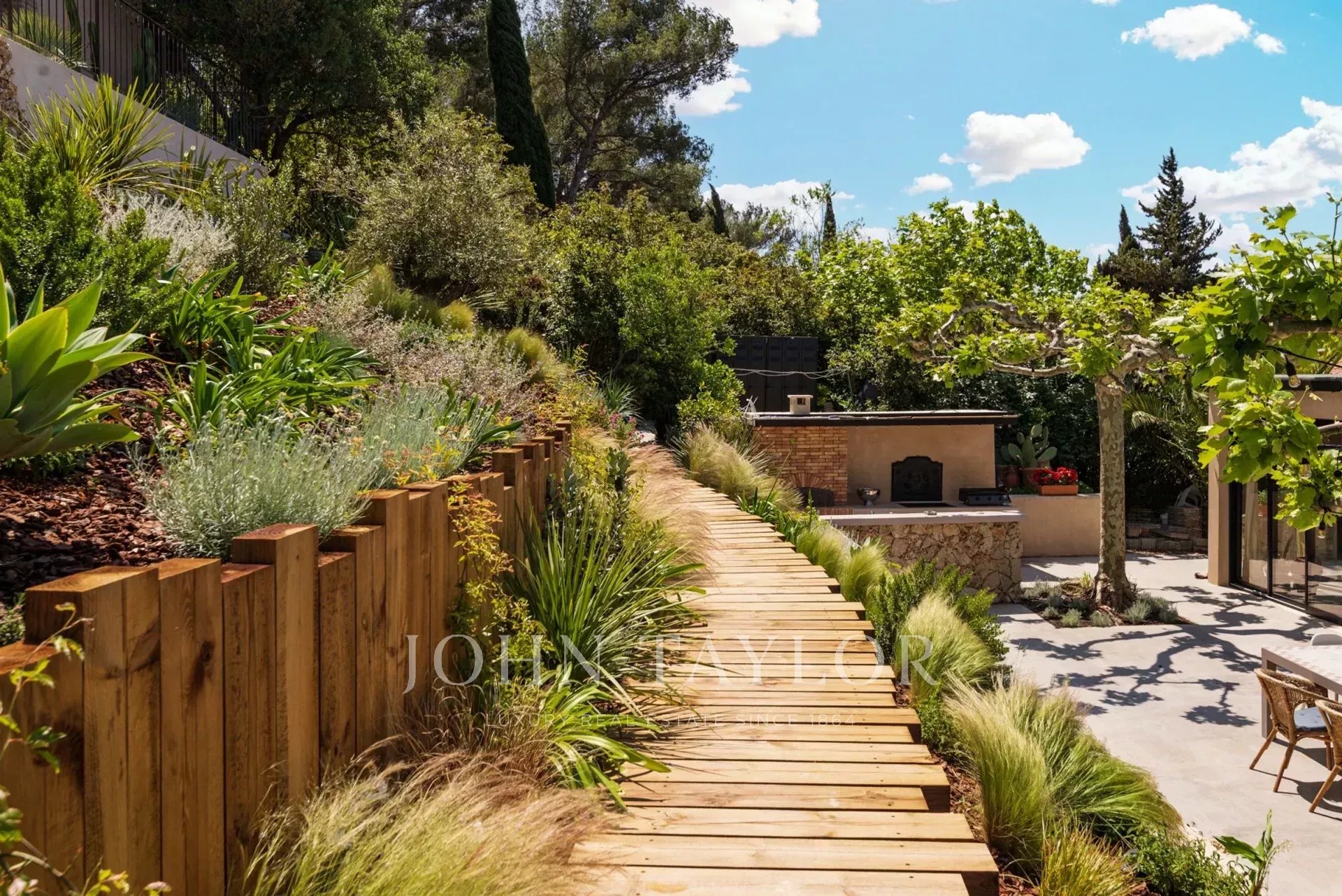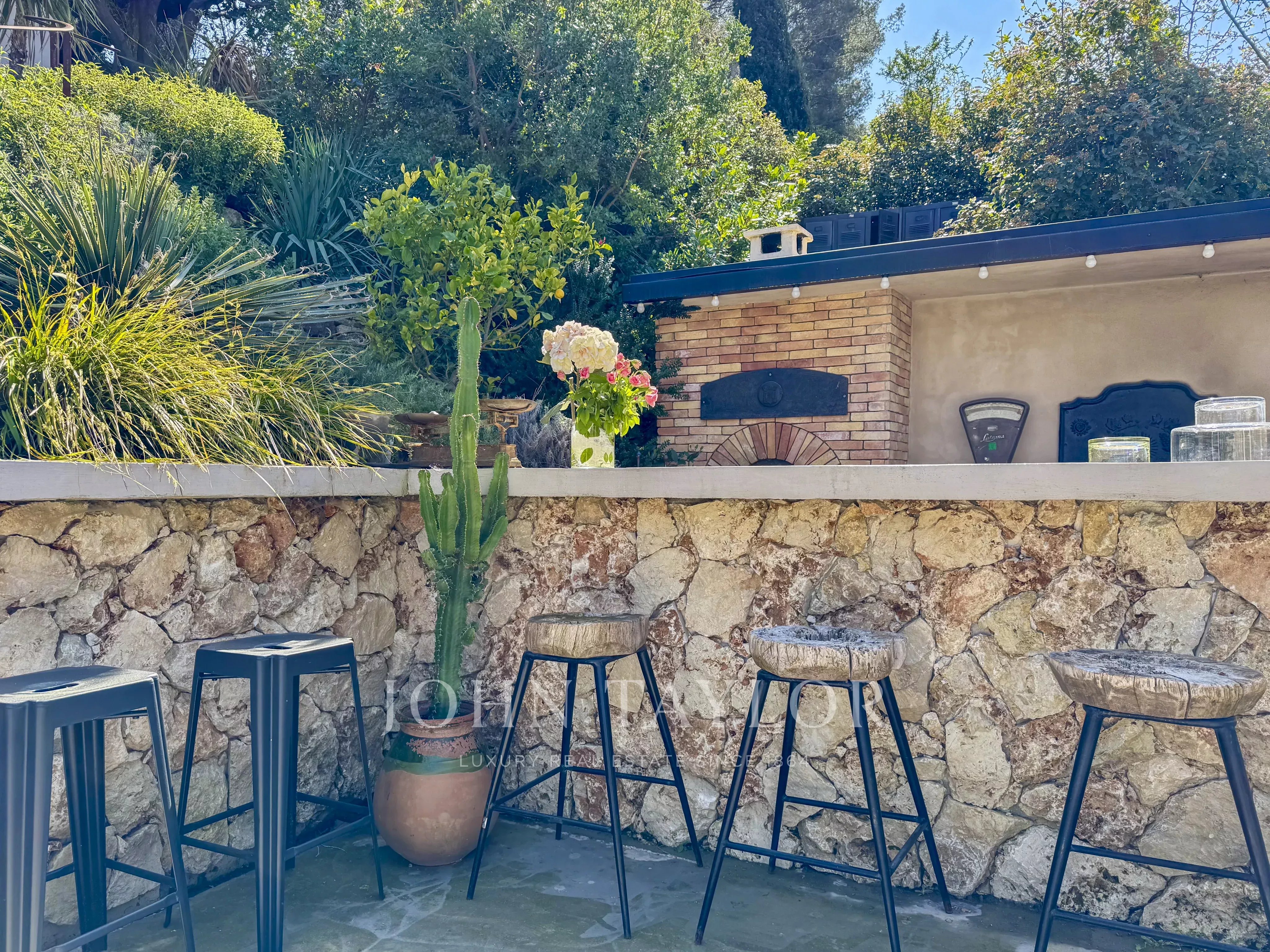This Mediterranean villa offers an idyllic living environment between a lush garden inspired by the Corsican maquis filled with aromatic essences and ancient olive trees, and its elegant pool and leisure area enjoying magnificent sunsets all year round.