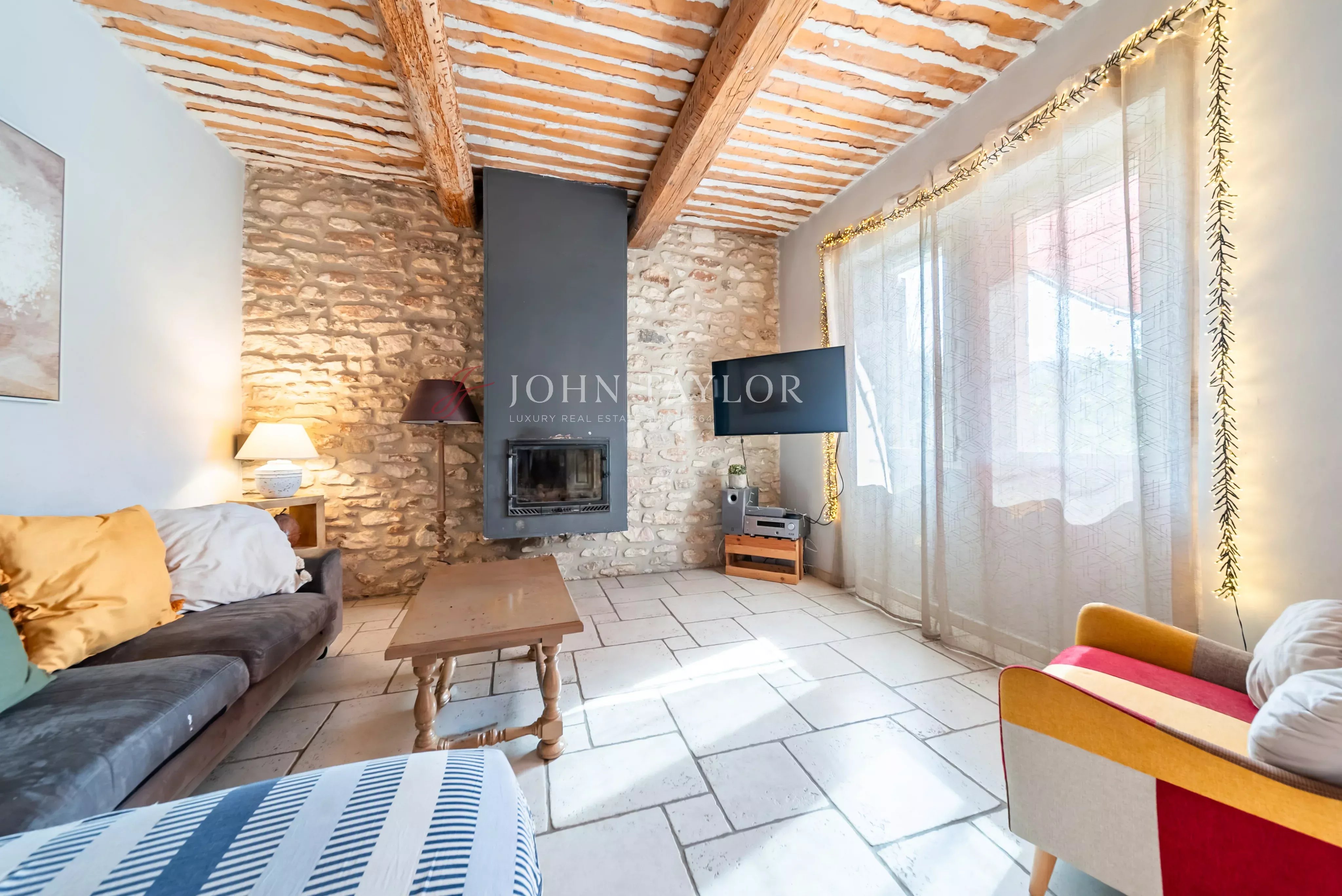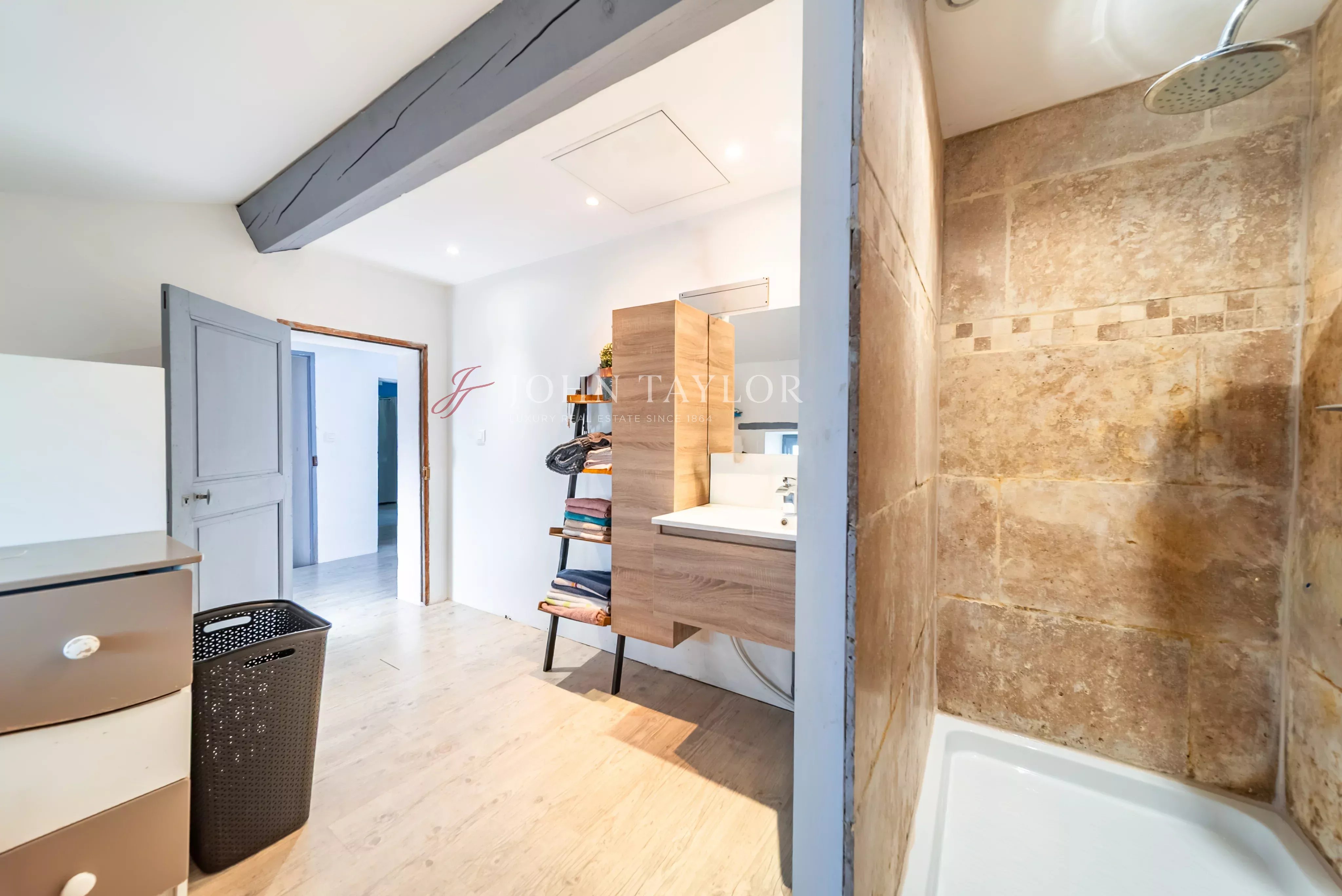 The farmhouse has been renovated with high-end amenities, including air conditioning, a traditional fireplace, double glazing, and high-speed internet access. The residence also benefits from ecological solutions such as photovoltaic panels, a well, a security code, an intercom, and an electric gate ensuring safety and comfort of living.