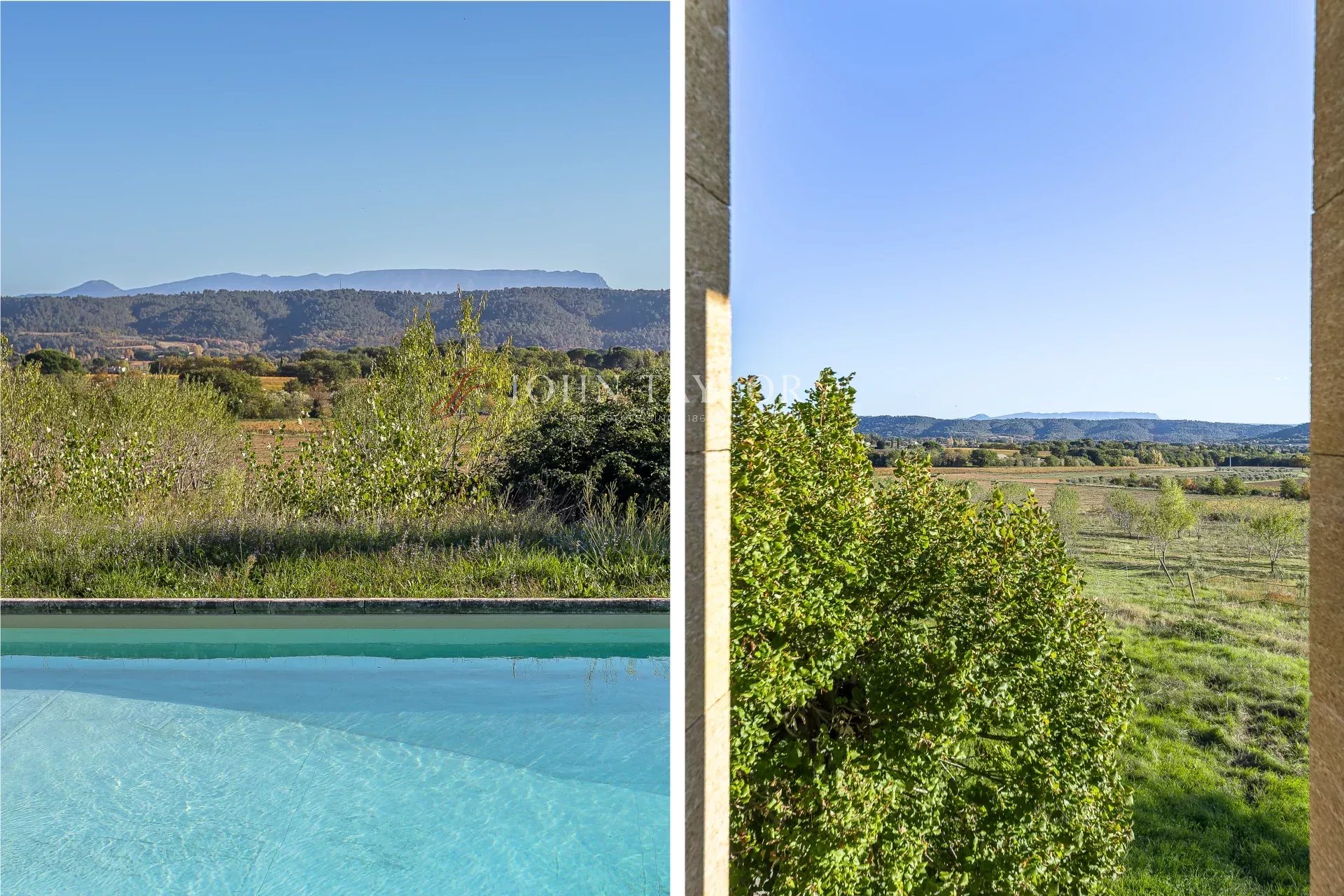 The two houses are located on a hillside, facing south and southeast, and the property boasts a commanding view over the valley, extending to the Sainte-Victoire mountain.