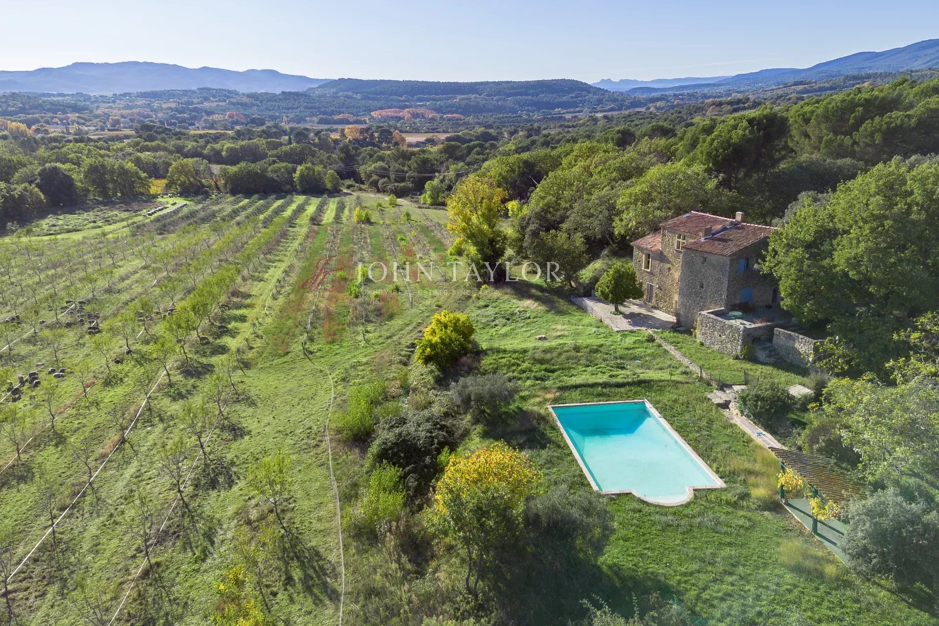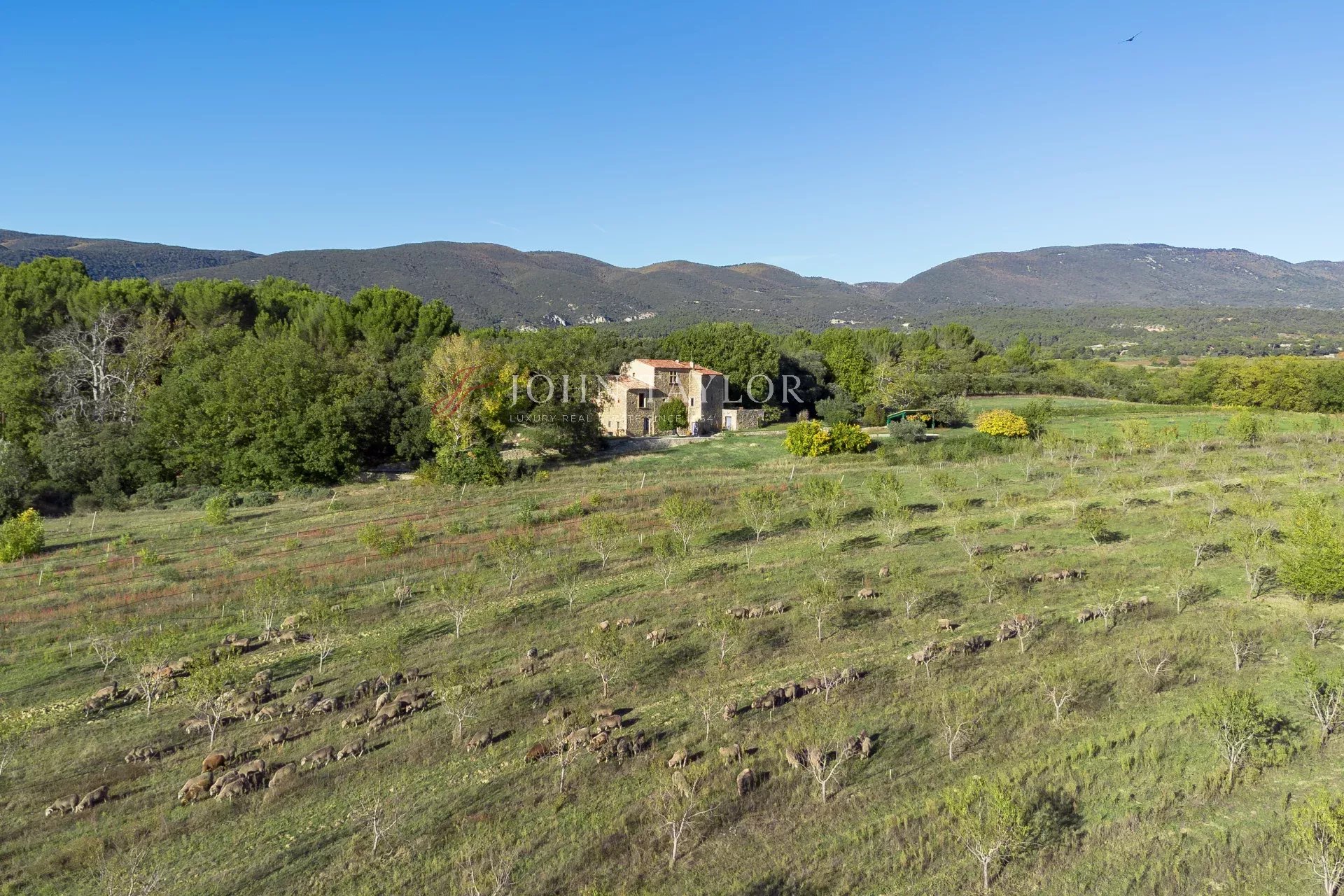 The grounds include lawns surrounding the houses, garrigue scrubland, woods, olive trees, oaks, pines, and more.
