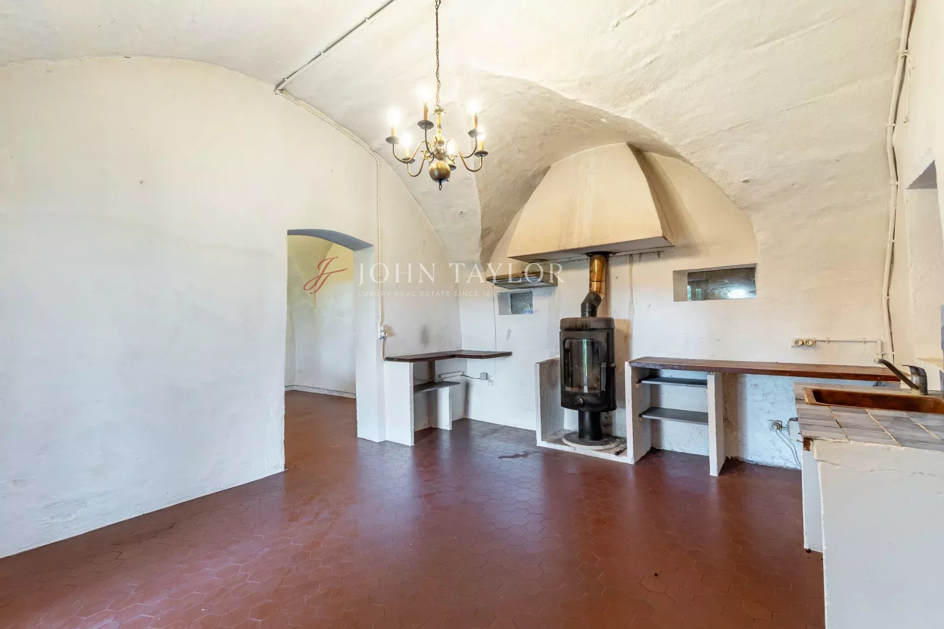 - First floor: east side, a large kitchen (with stairs to the second floor) opening onto an east- and south-facing terrace; in the center, a vaulted living room with a fireplace and a superb antique stone staircase; on the west side, a shed intended to extend the existing living room; on the north side, an entrance hall with a cloakroom and toilet.