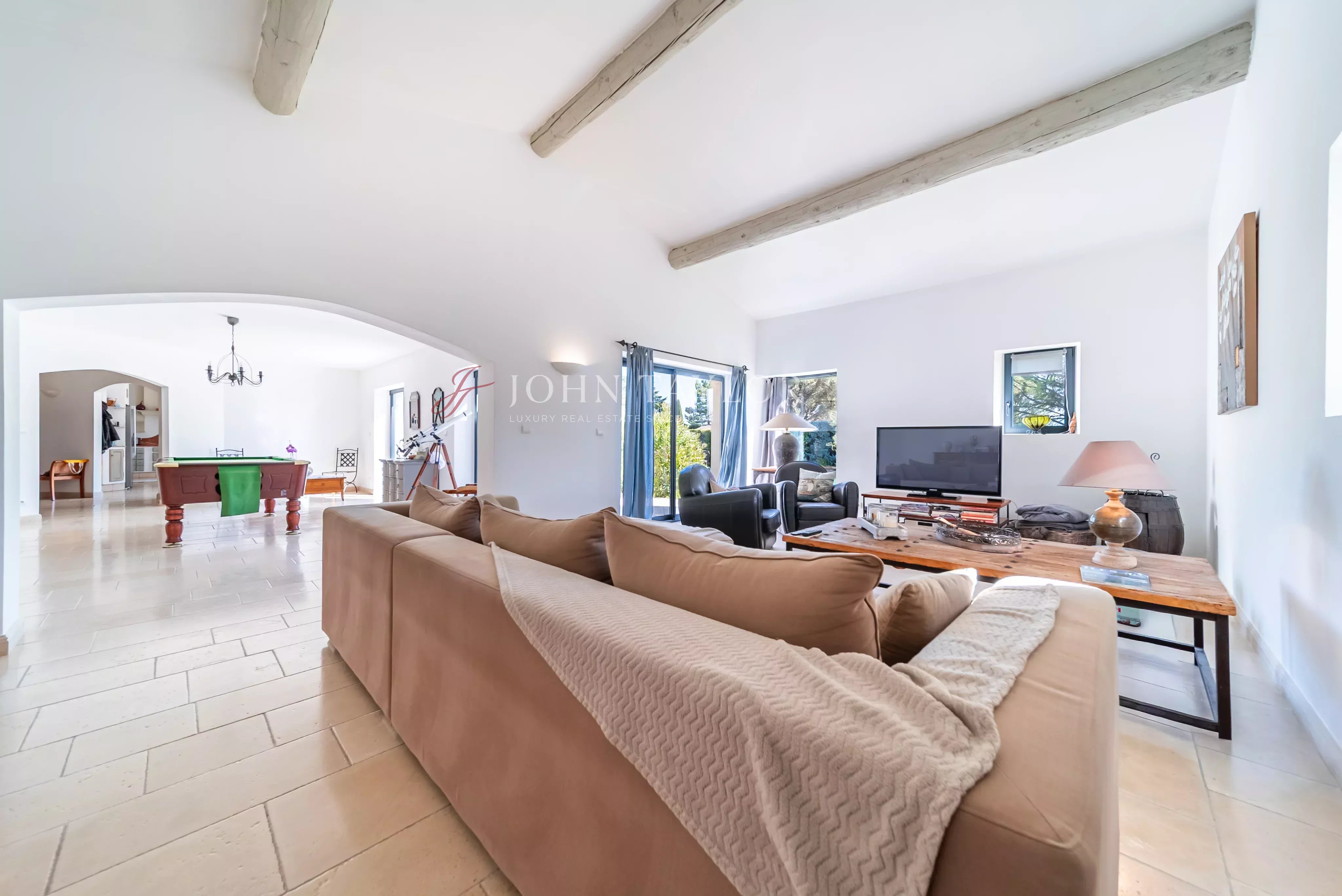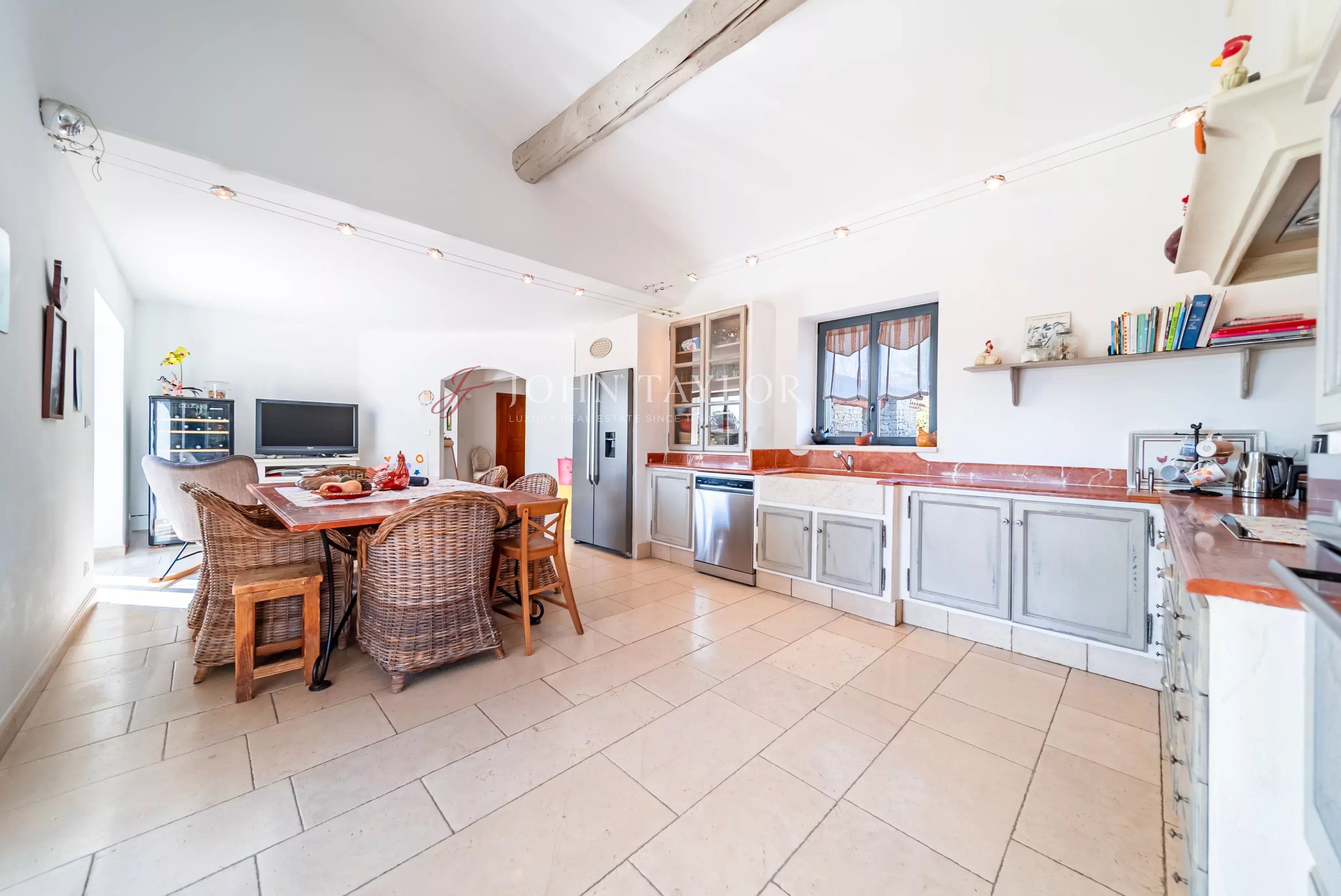 This elegant Provençal Bastide spans two levels and is beautifully oriented to the south, bathing each room in natural light. The residence is centered around a spacious living area on the ground floor, complemented by a relaxation lounge, a dedicated office space, a fully-equipped kitchen, a laundry room with pantry, and an en-suite bedroom.