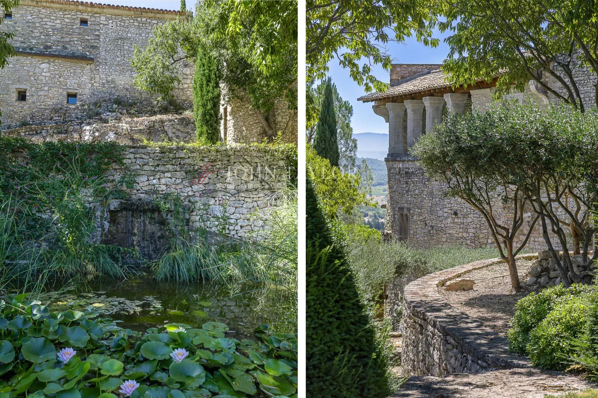 The nearly 5000 m² plot, located in the heart of the village, is slightly sloped. It is entirely enclosed by stone walls and terraced. The landscaping is meticulous, featuring numerous plant species, grassed slabs, and an elegant basin with a fountain.
