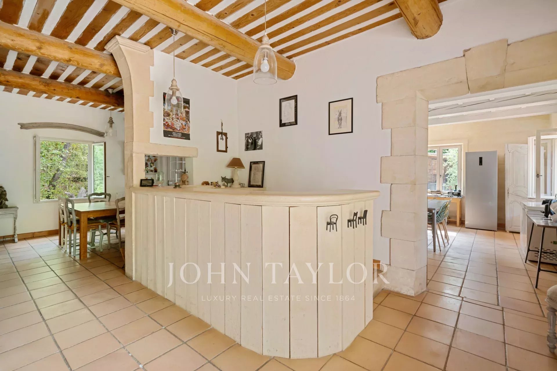 Inside, the house offers a perfect blend of modern comfort and authentic Provencal charm. The expansive reception room, covering over 75 square meters, is enhanced by an elegant fireplace, creating a warm and inviting living space. It includes a generous living area, a spacious dining room, a cozy bar area conducive to socializing, as well as a double semi-professional kitchen, perfect for culinary enthusiasts. A suite-style bedroom of over 35 square meters, with its private bathroom and WC, offers a premier private living space.