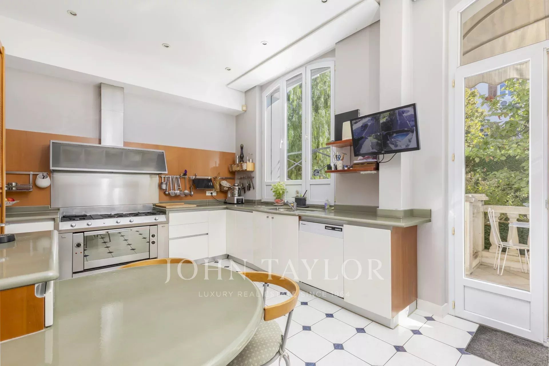 Set on a landscaped plot of approximately 1,000 sqm, the property offers over 500 sqm of living space across four levels, all served by an interior elevator. It features spacious reception rooms with generous volumes, five bedrooms, and an independent 30 sqm studio ideal for hosting family or guests.