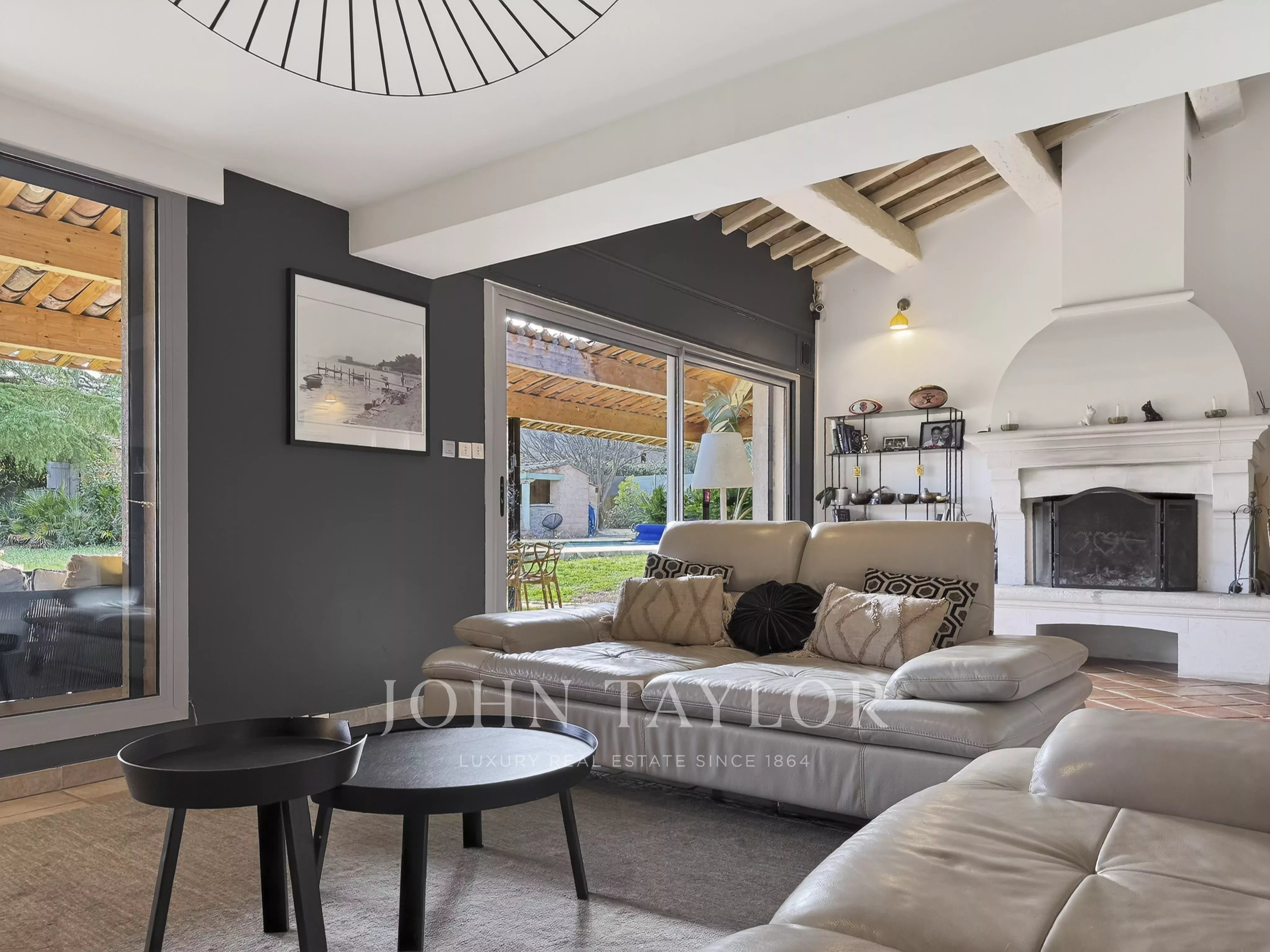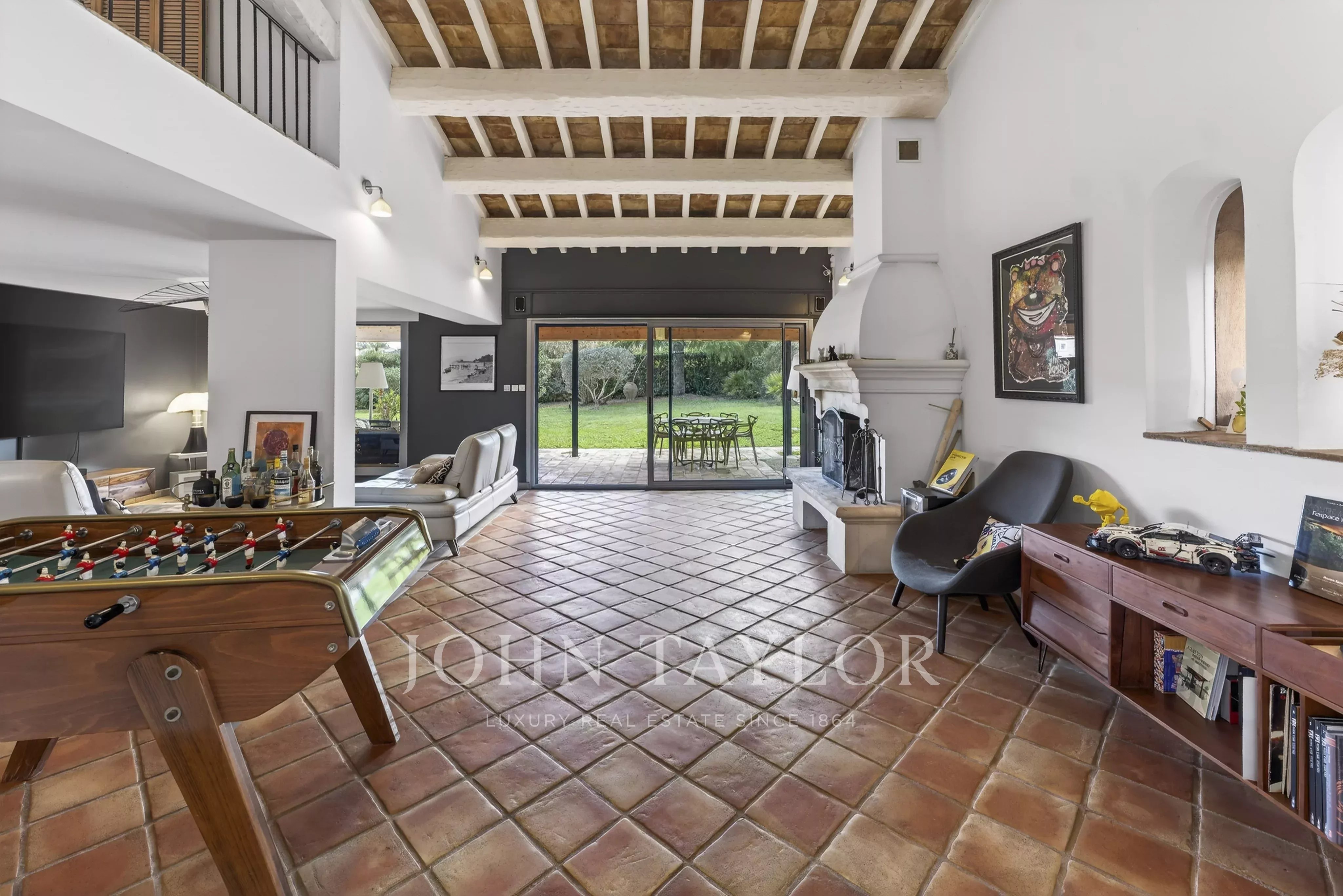 Offering approximately 257 sqm of living space, the villa impresses from the entrance with a spacious hall opening onto a bright 60 sqm living area, enhanced by large bay windows, a fireplace, exposed beams and natural stone features. A dining room extends this reception area, creating a seamless and elegant living space.