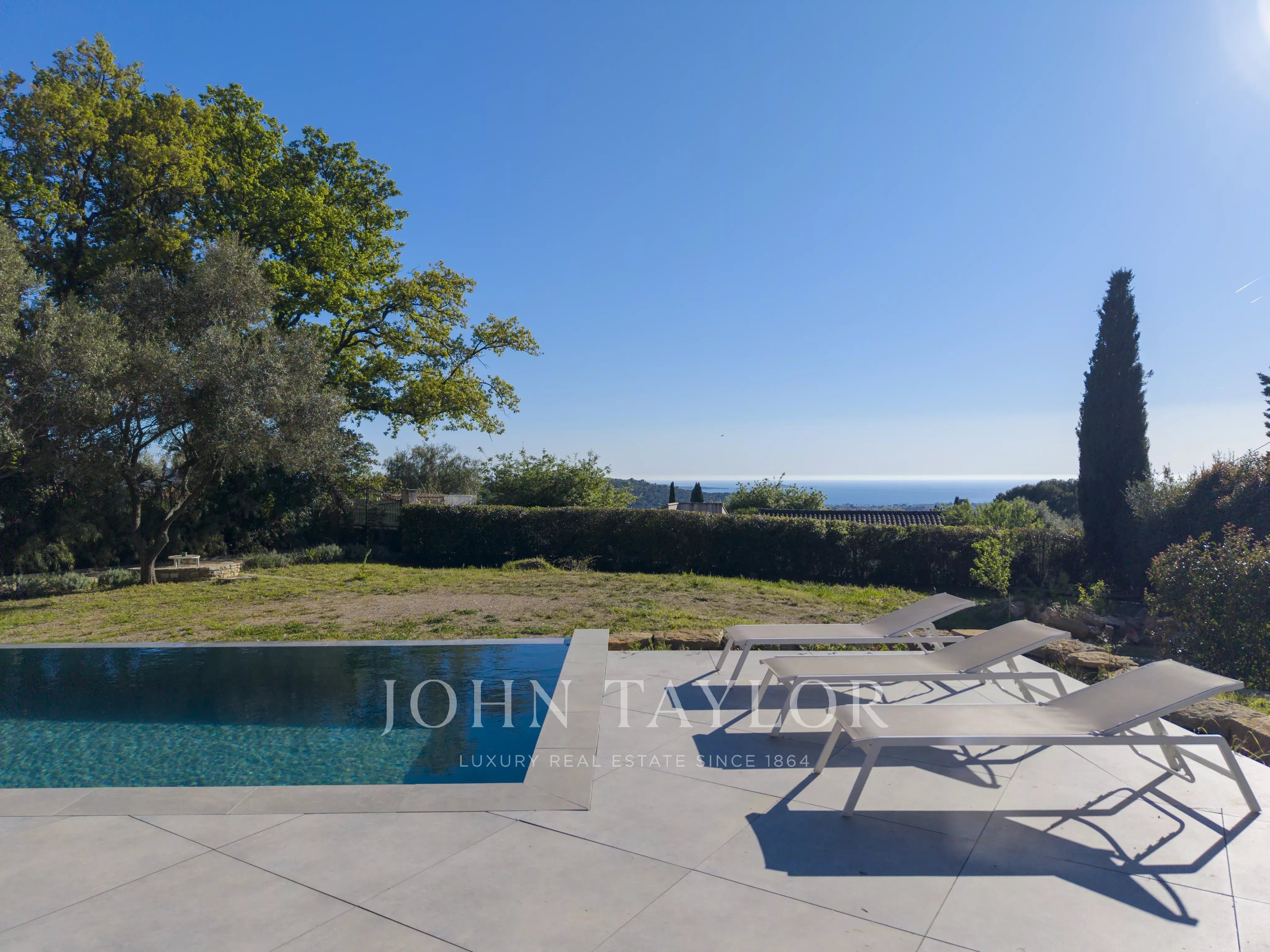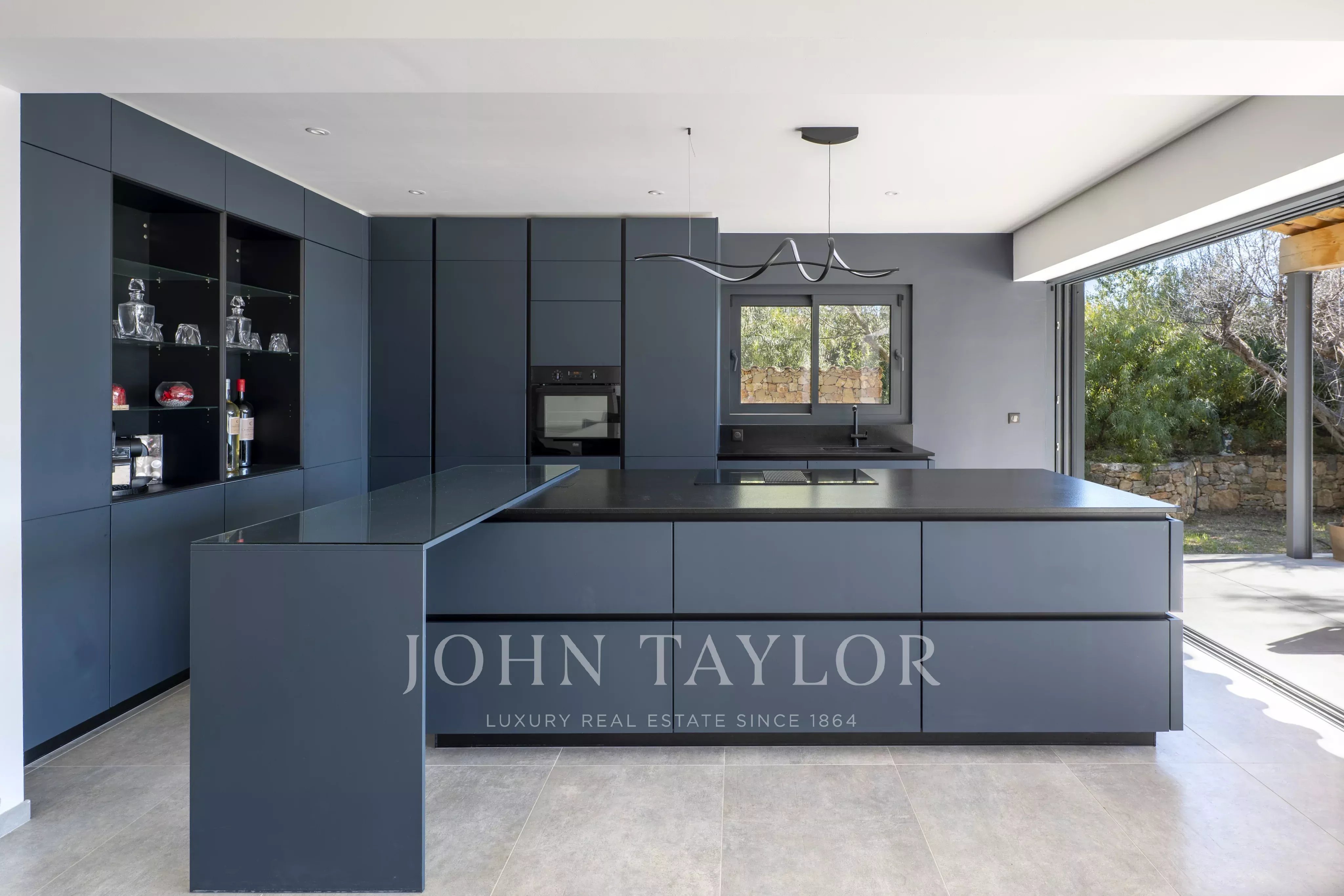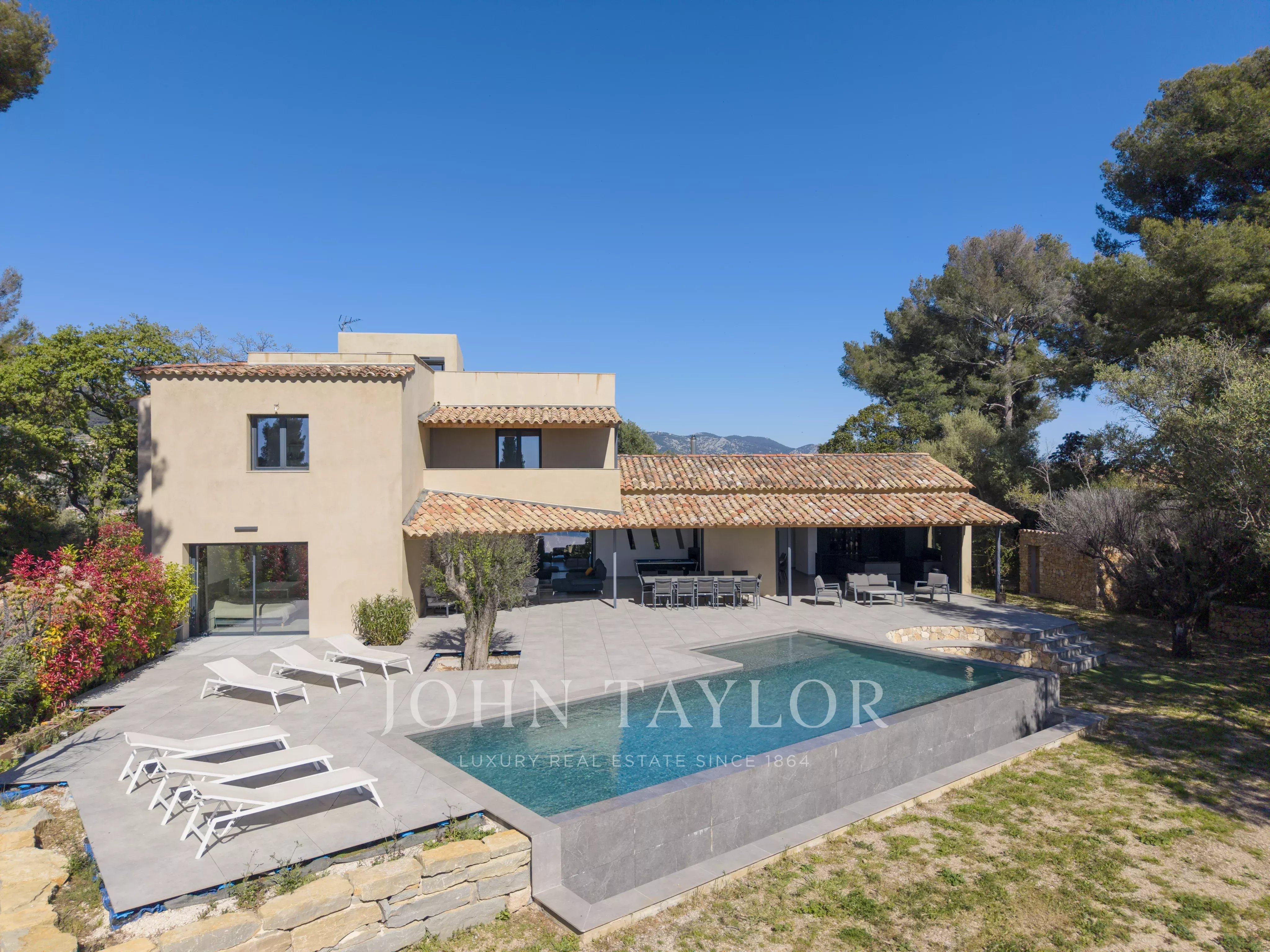 The JOHN TAYLOR SANARY/BANDOL agency presents this architect-designed villa, reimagined by Jean Gouzy and fully renovated in 2024, ideally located in a शांत and green residential setting, just moments from Sanary-sur-Mer.