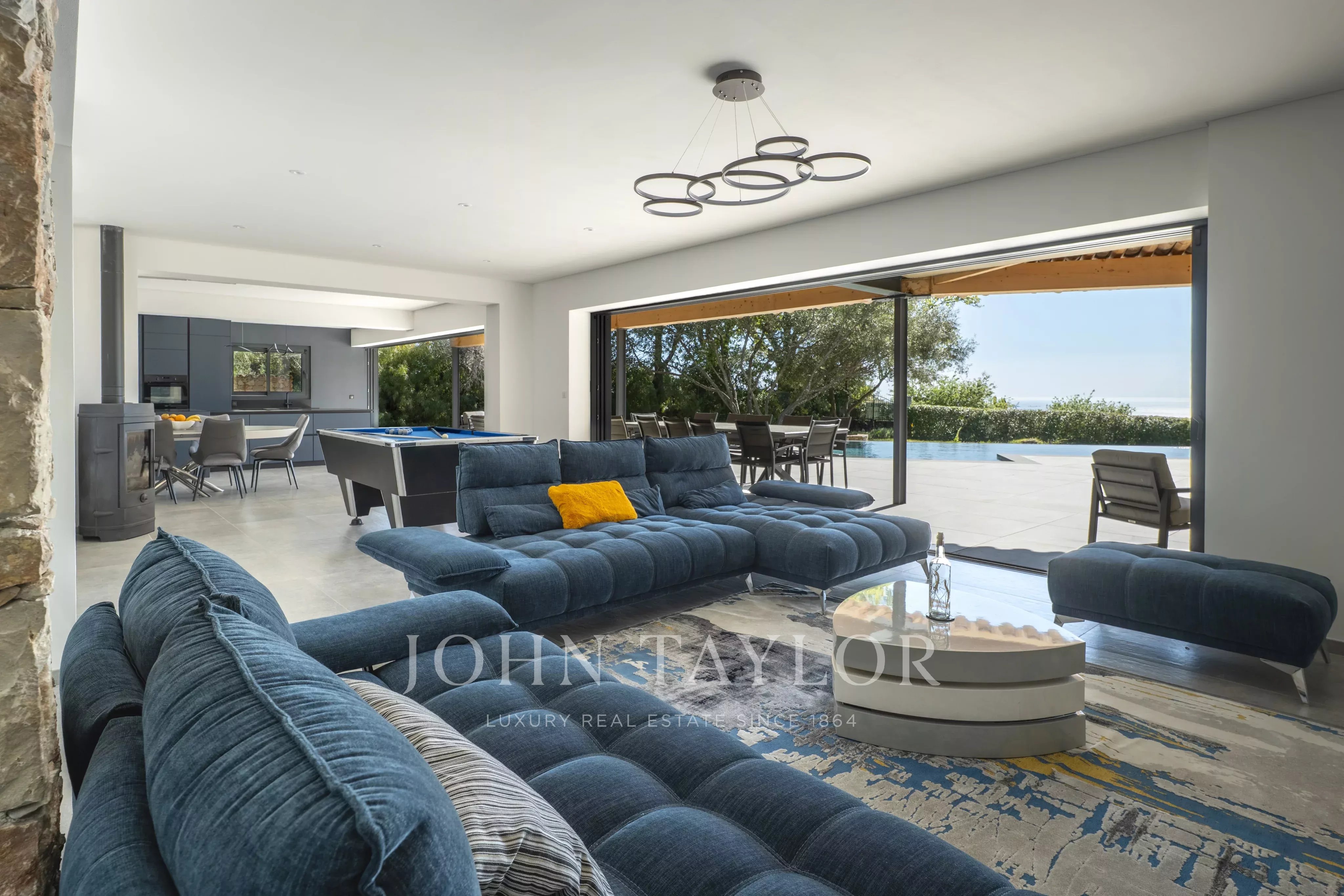 The main living room flows effortlessly into the infinity pool, creating a unique indoor-outdoor lifestyle perfectly oriented towards the Mediterranean.
