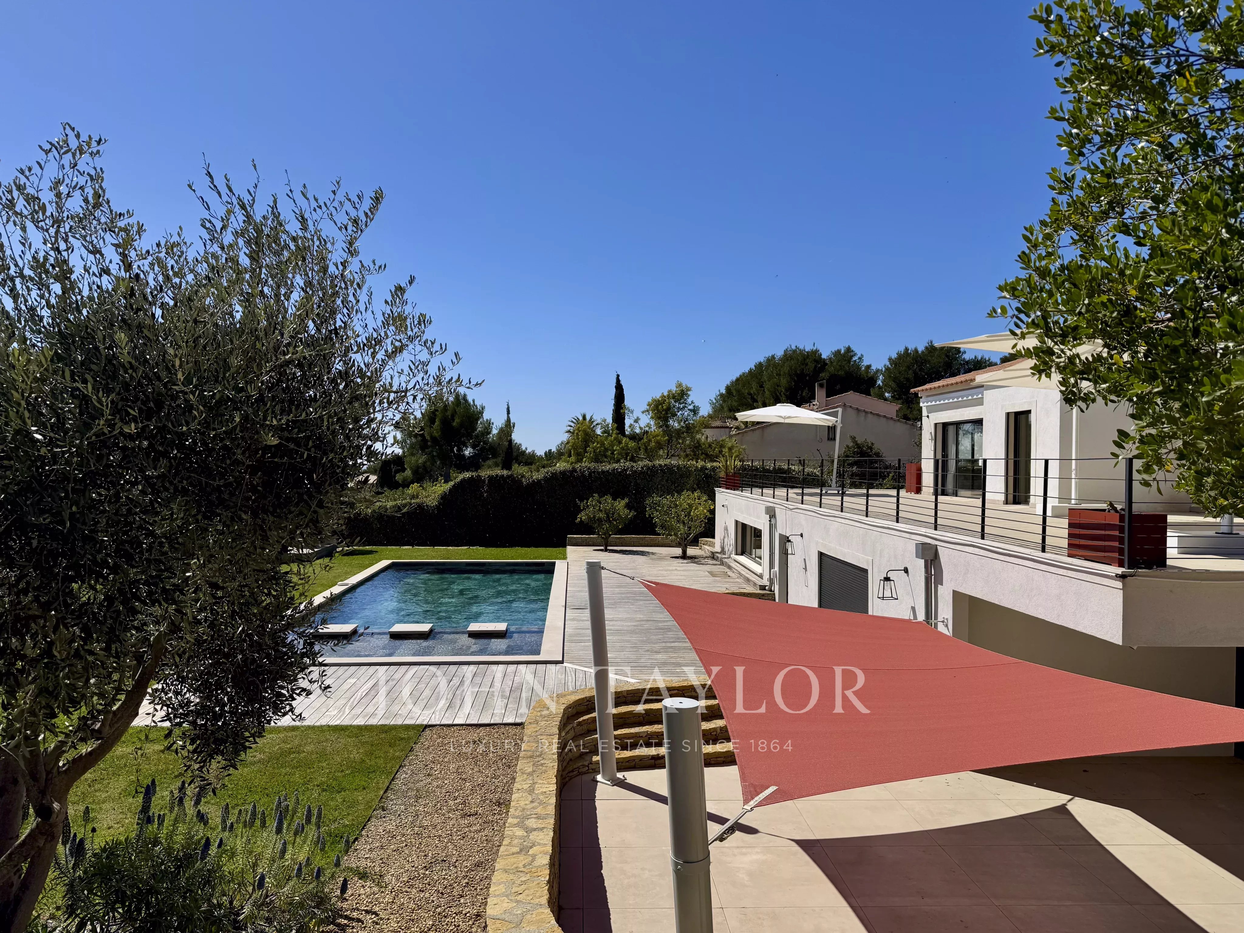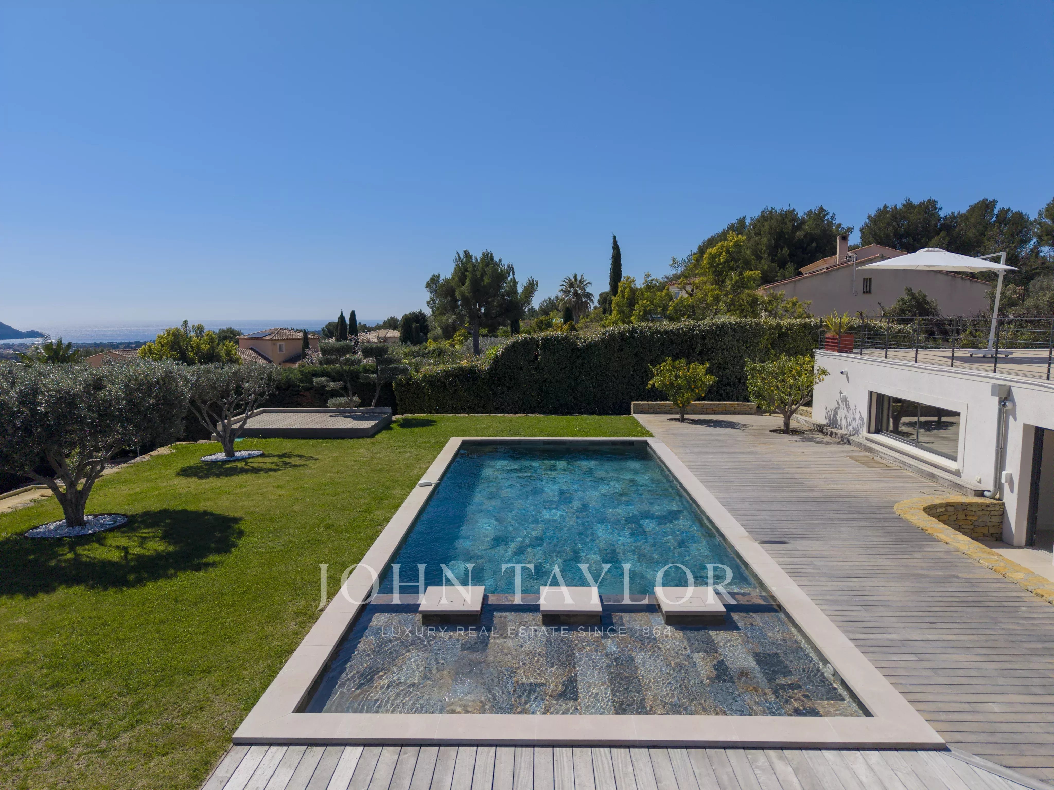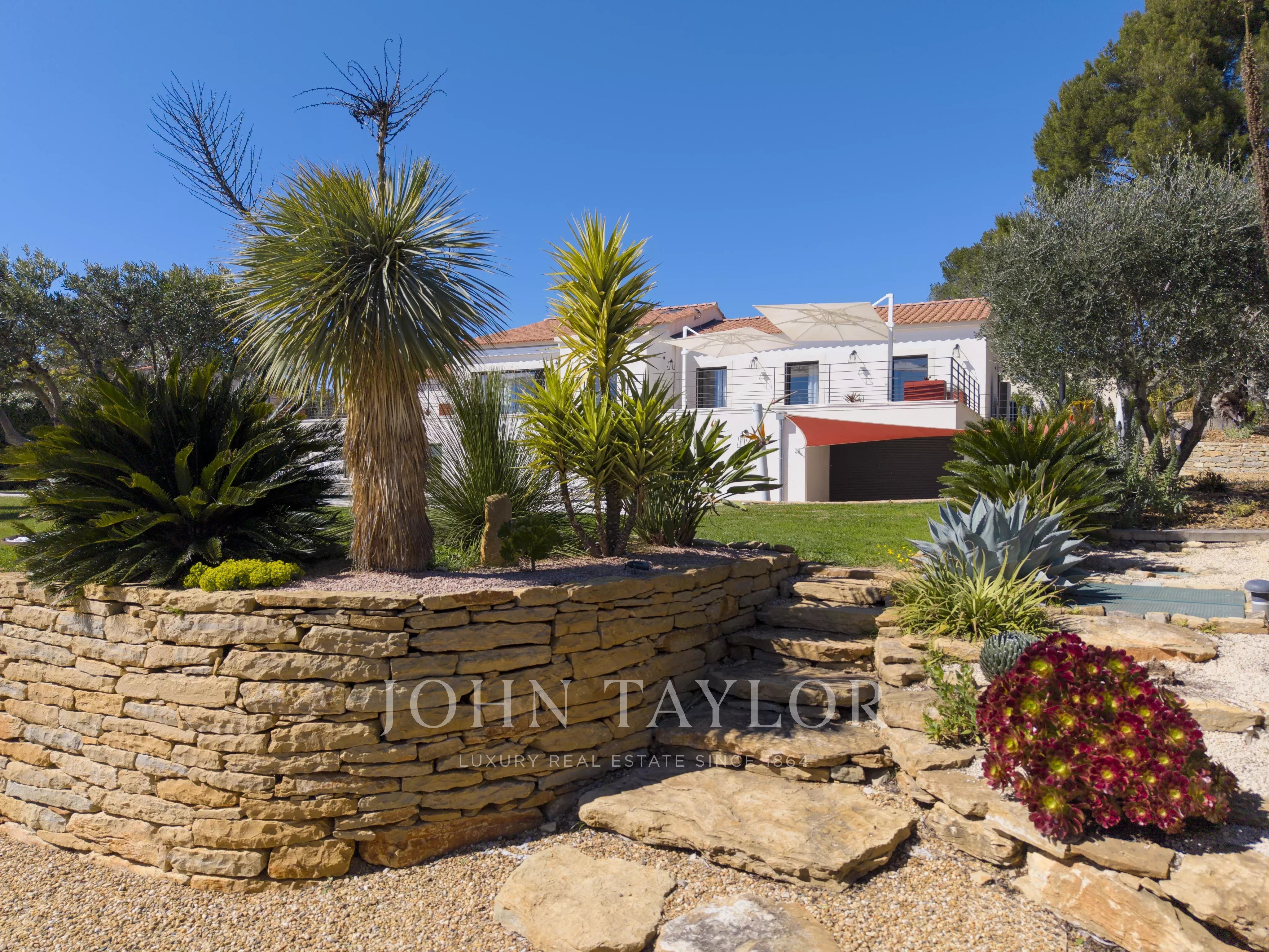 The JOHN TAYLOR Marseille & Sanary Agency offers in a sought-after and particularly quiet area of La Cadière d’Azur, this beautiful recent contemporary villa offers a privileged living environment, with no overlooking neighbors, and panoramic views of the sea and the surrounding countryside.