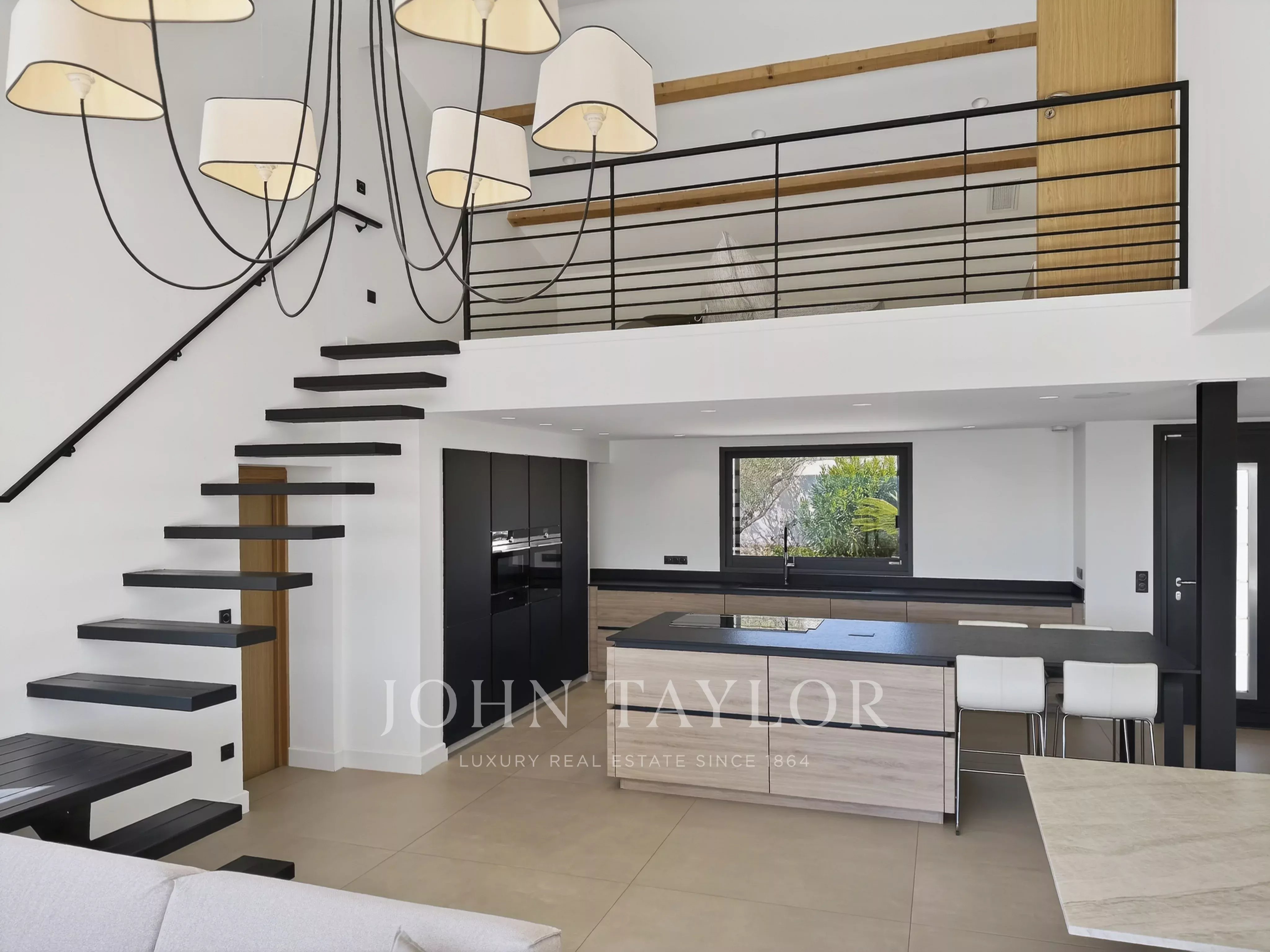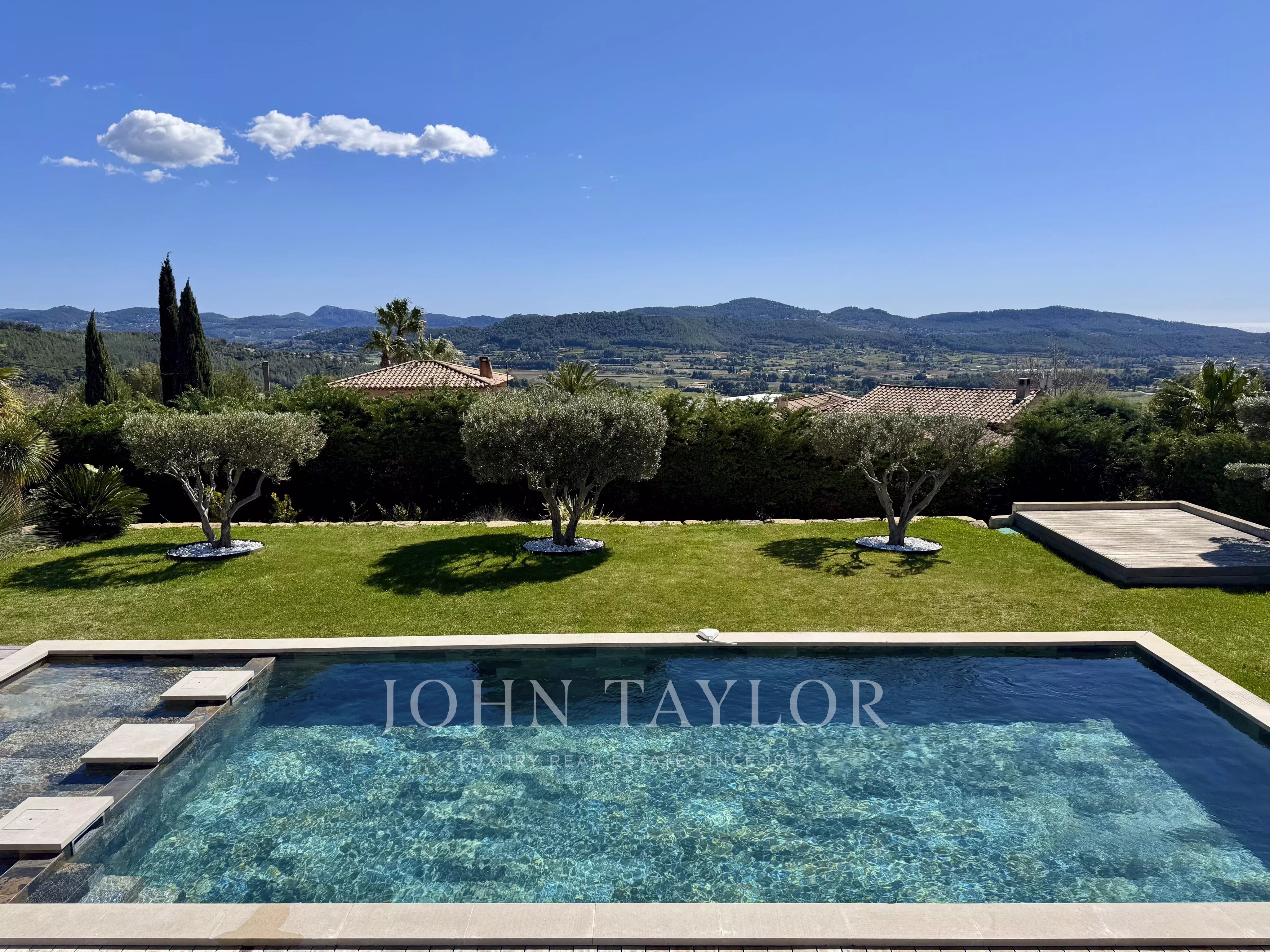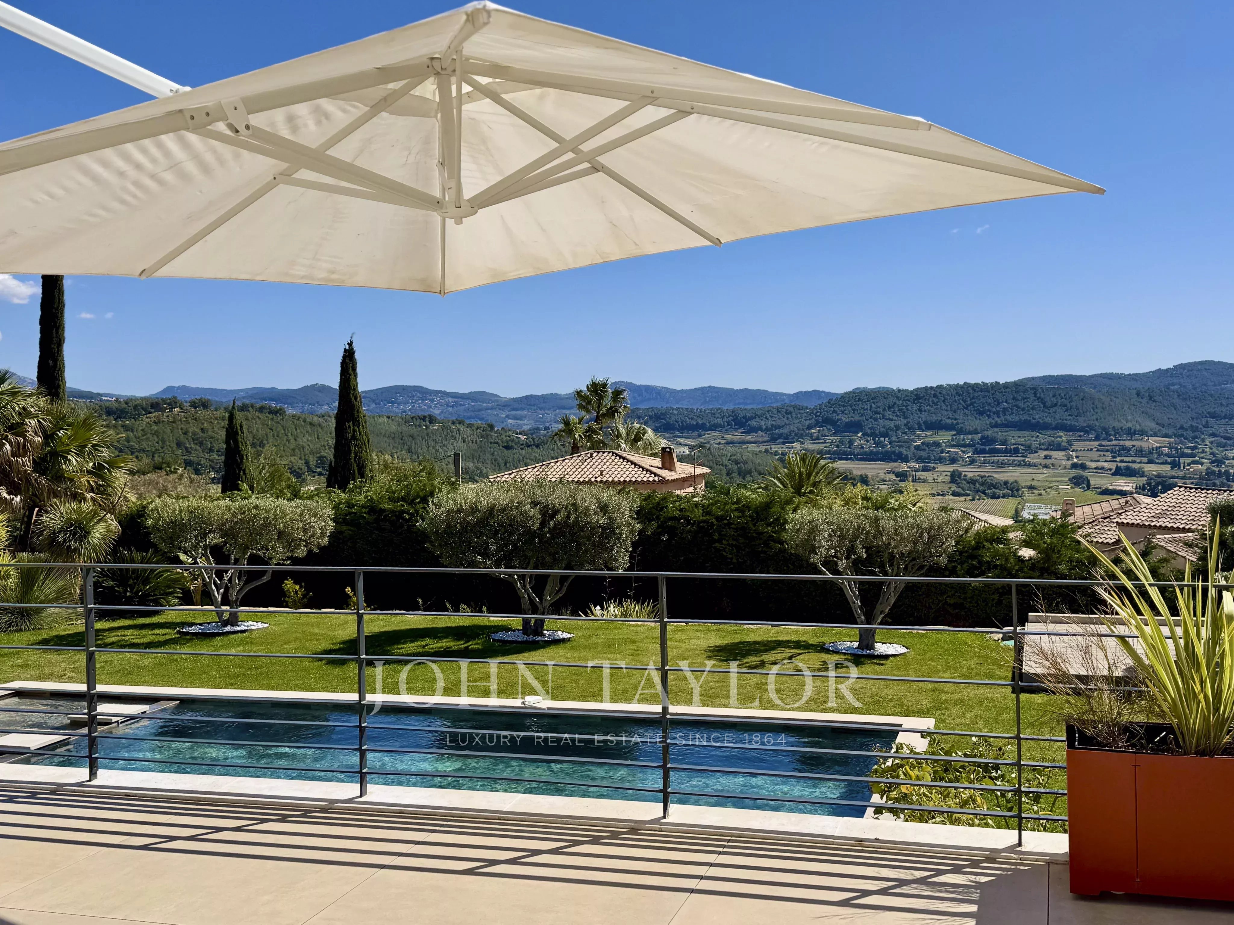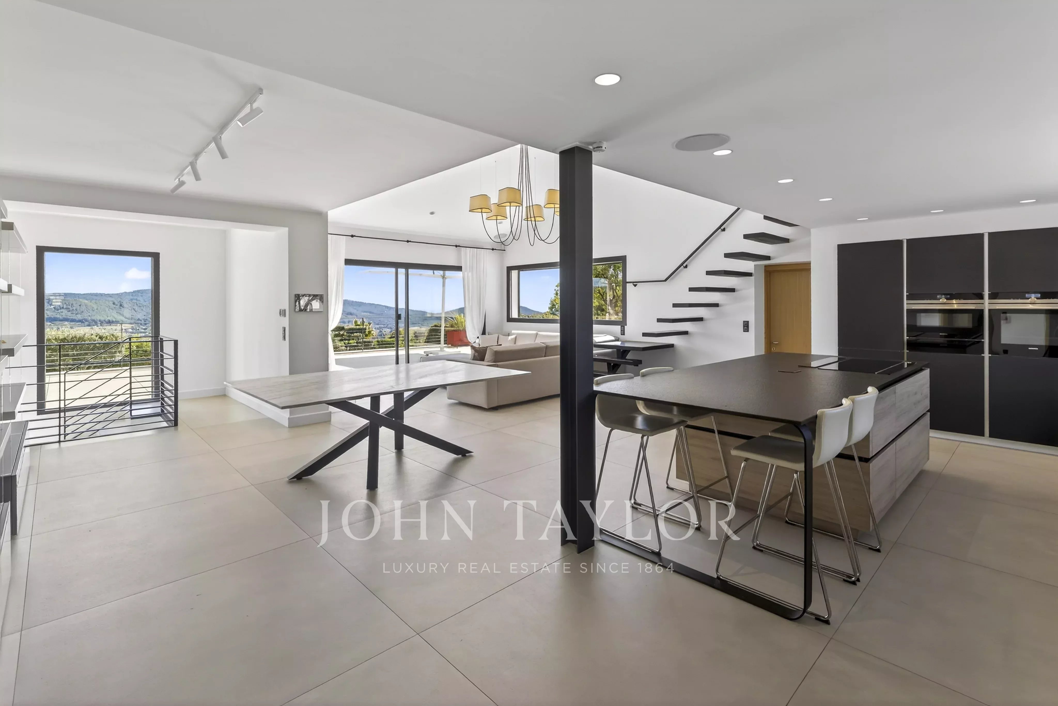 The JOHN TAYLOR Marseille & Sanary Agency offers in a sought-after and particularly quiet area of La Cadière d’Azur, this beautiful recent contemporary villa offers a privileged living environment, with no overlooking neighbors, and panoramic views of the sea and the surrounding countryside.