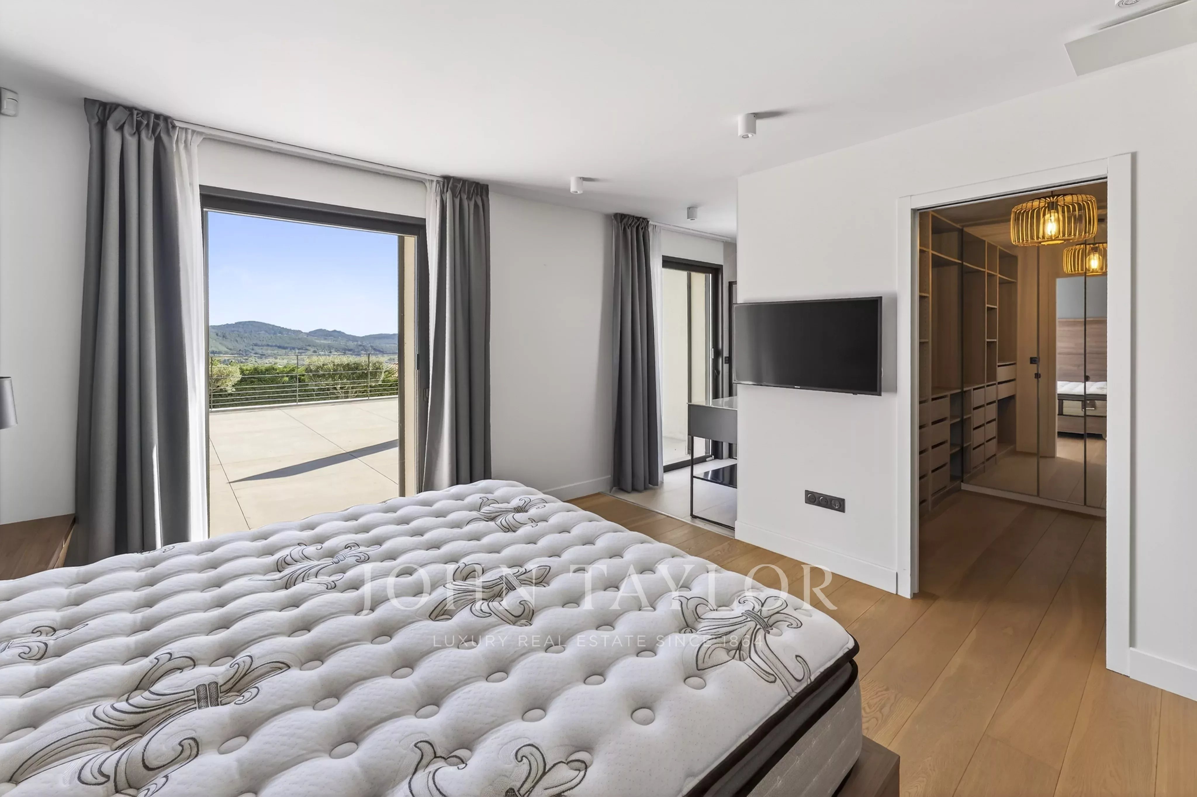 The main level features a large living room combining a lounge, dining area, and open kitchen, extended by a utility/laundry room. The whole opens widely onto a terrace of over 200 m² offering an exceptional panorama. On this same level, three en-suite bedrooms including an elegant master bedroom guarantee single-story living comfort. A mezzanine overlooking the living room houses an additional bedroom.
